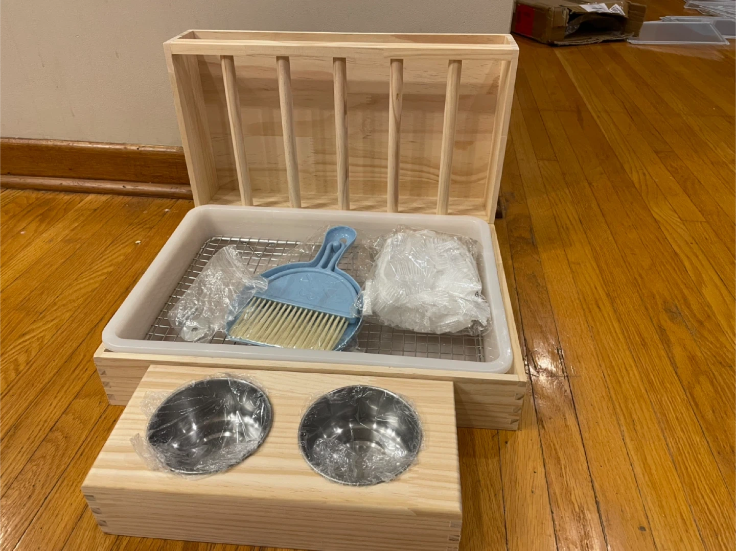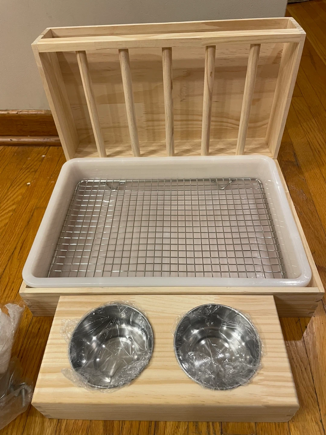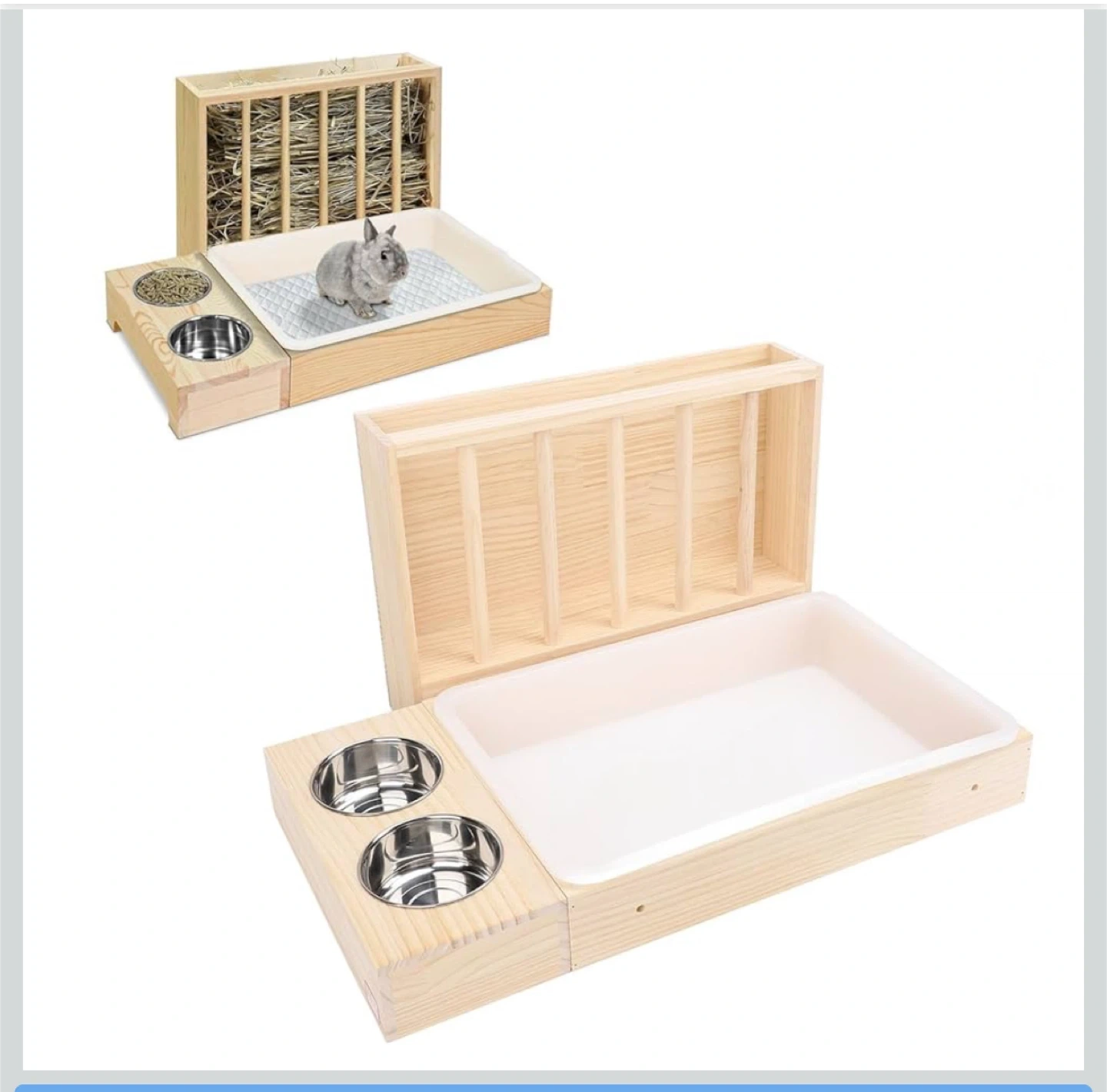This is a rabbit hay feeder with food bowls. It has a hay rack with vertical railings to prevent rabbits from dragging out all the hay. It also includes two stainless steel food bowls. Great for keeping your bunny happy and tidy!