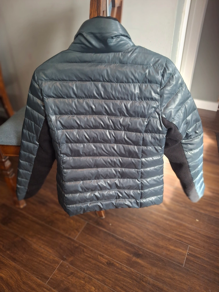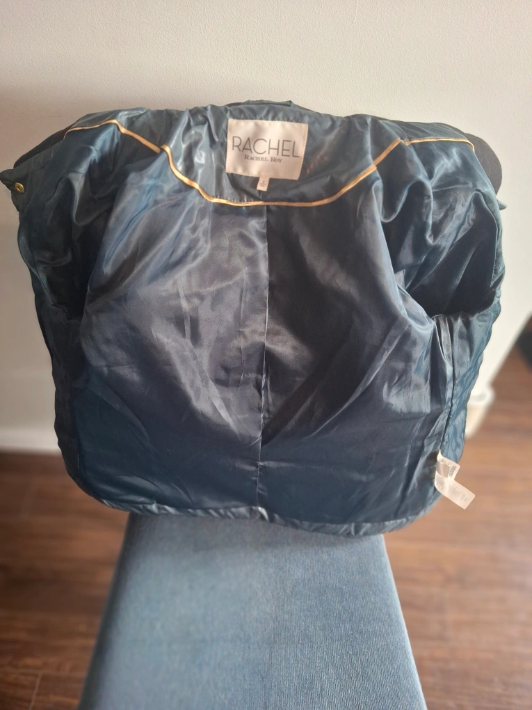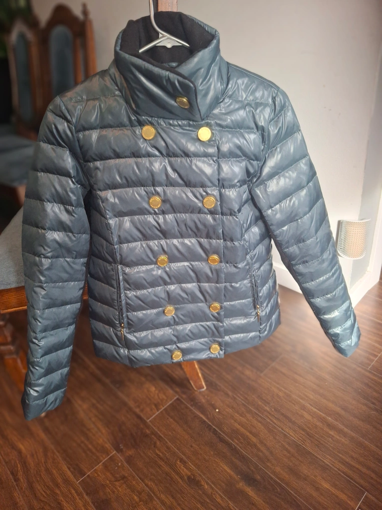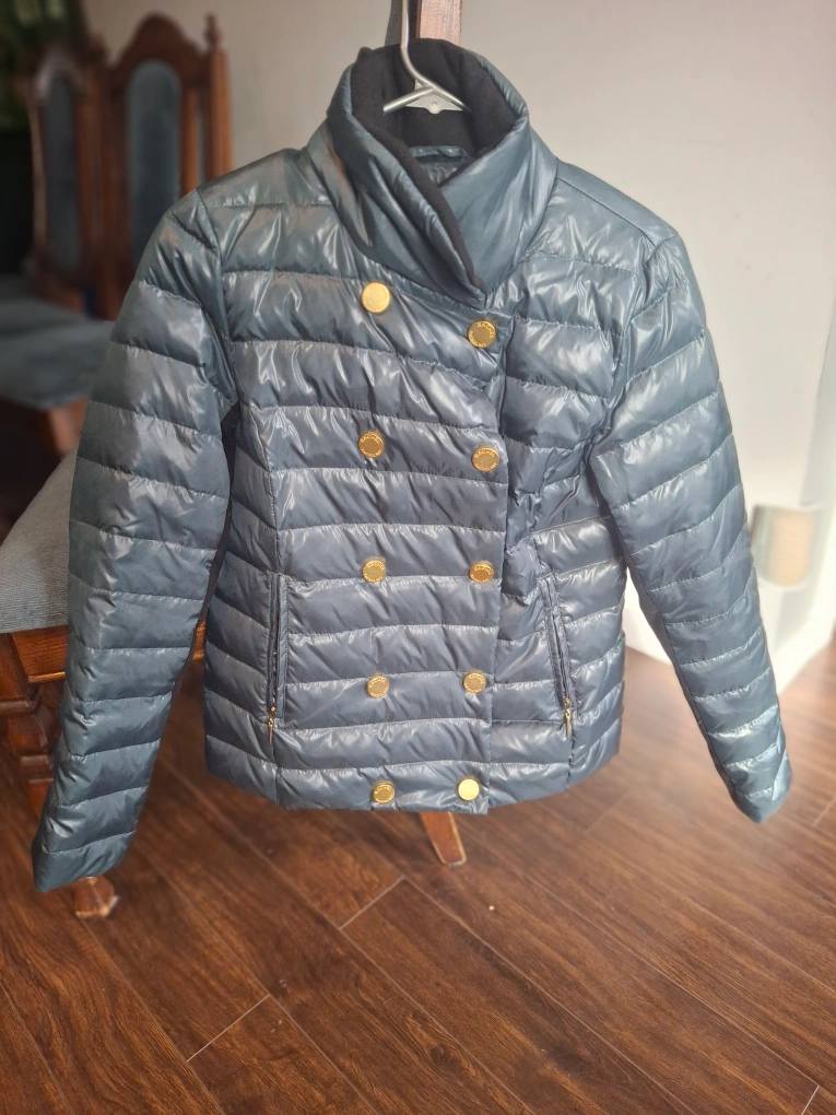 Here's a stylish puffer jacket from Rachel Roy! It's a size small and features a double-breasted design with gold buttons. The colour is a lovely blue-grey, perfect for cooler weather.