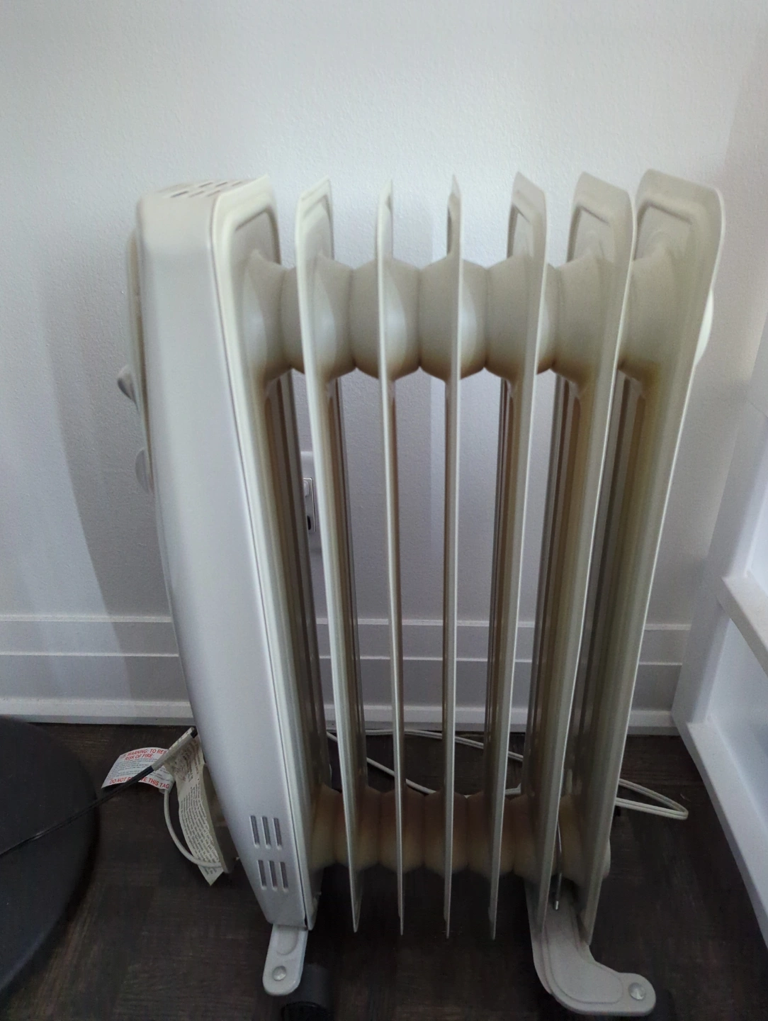 A portable heater in a neutral colour. Has multiple vertical fins, a side control panel, and rolling feet. Imagine the comfort of a heated room on a cold day.