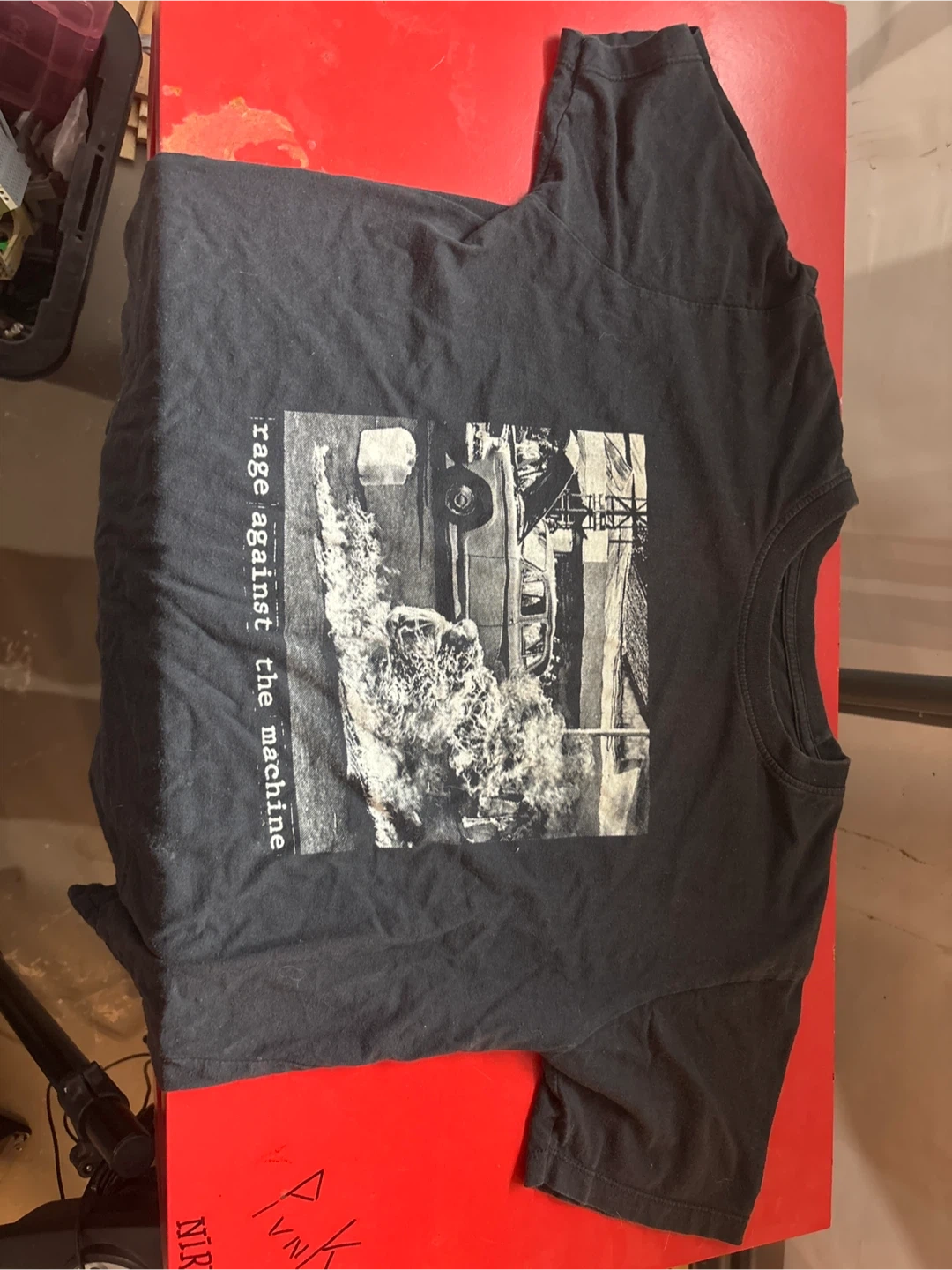 Selling a Rage Against the Machine graphic t-shirt. It's a cool piece for any fan of the band!