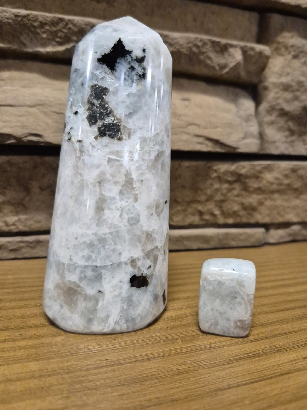 Selling a beautiful moonstone tower with a matching cube. The tower is a lovely statement piece, and the cube is a nice accent. Both have a great texture and are in excellent condition! Rainbow Moonstone Point Tower Carving