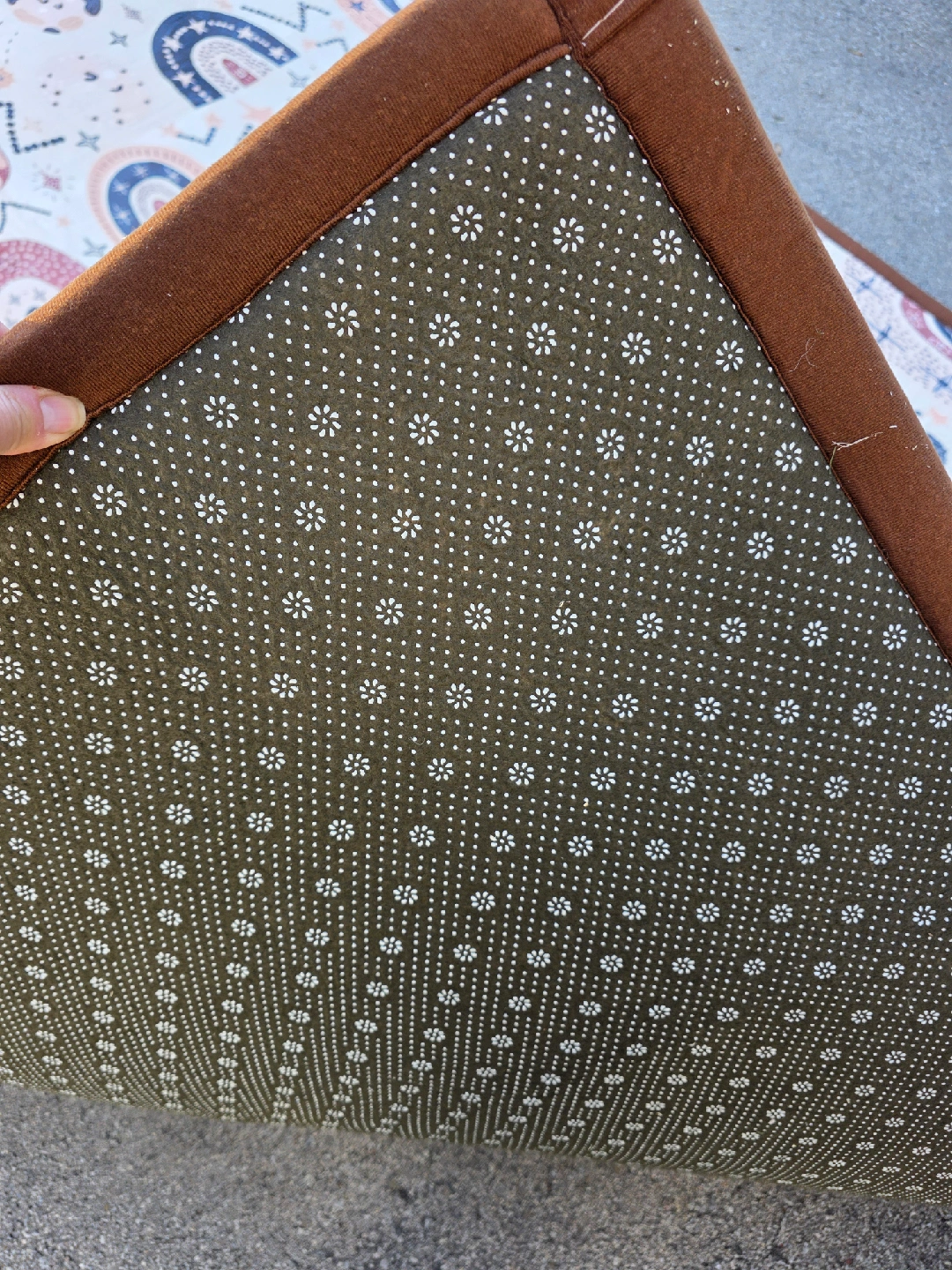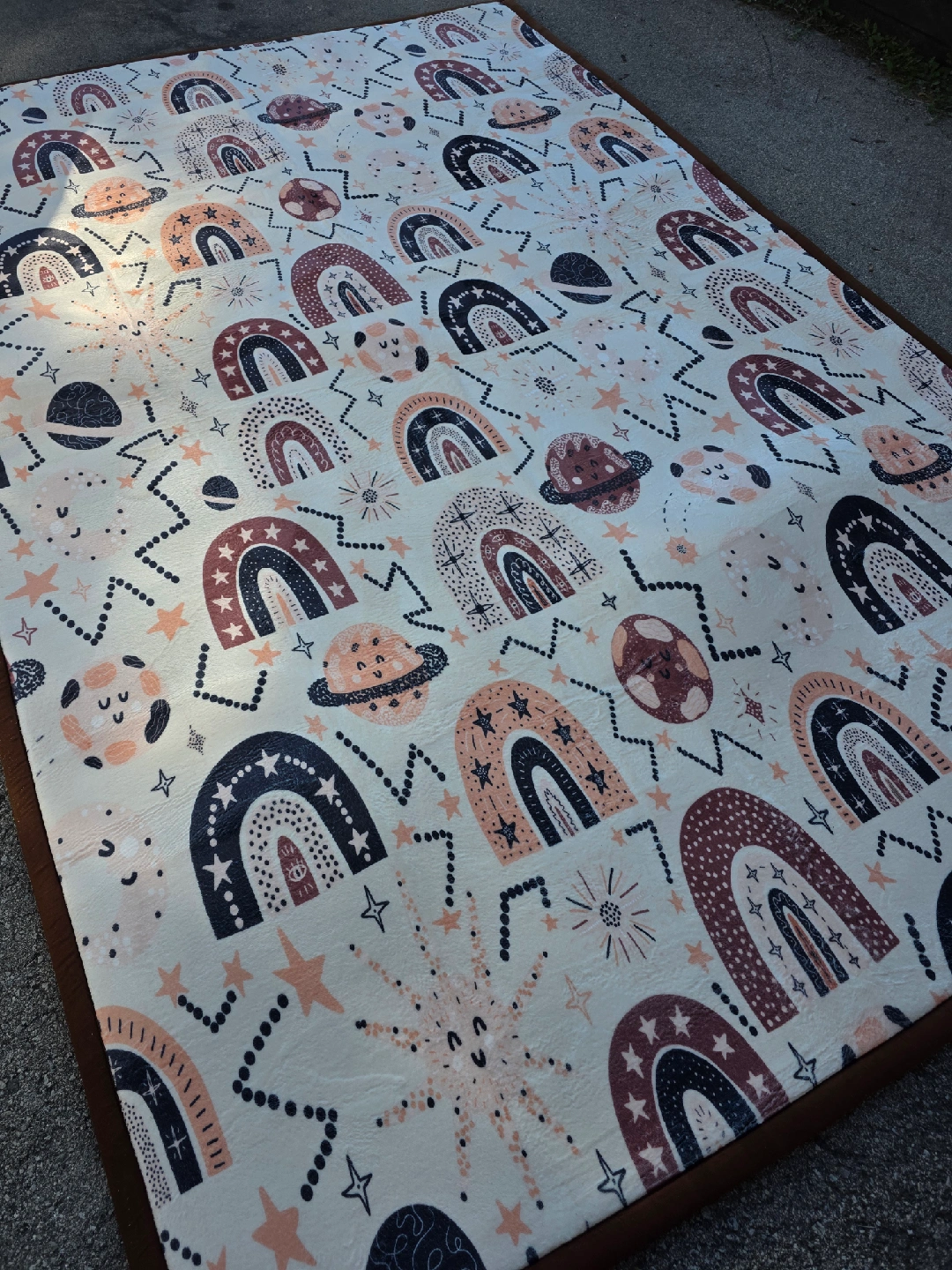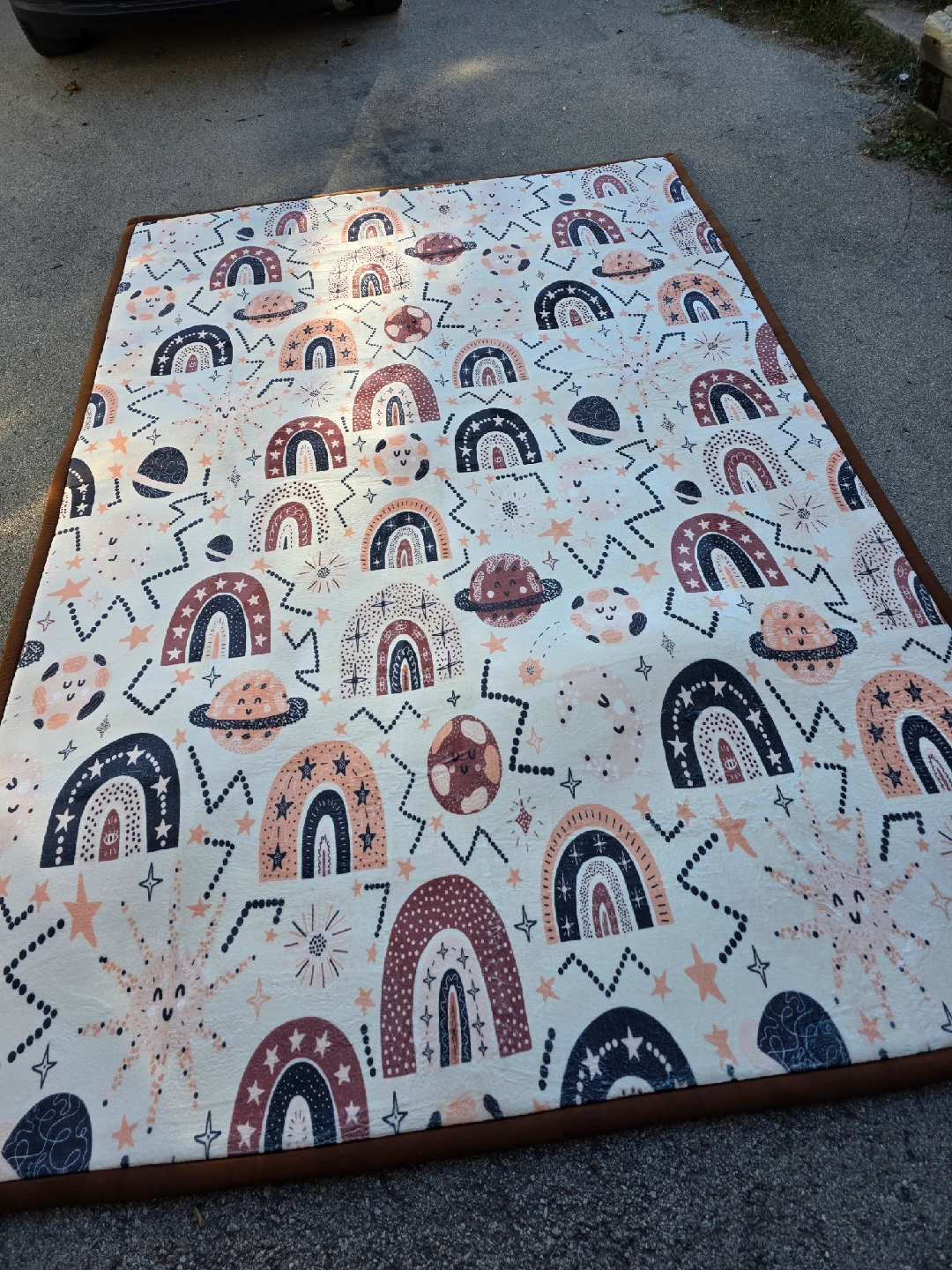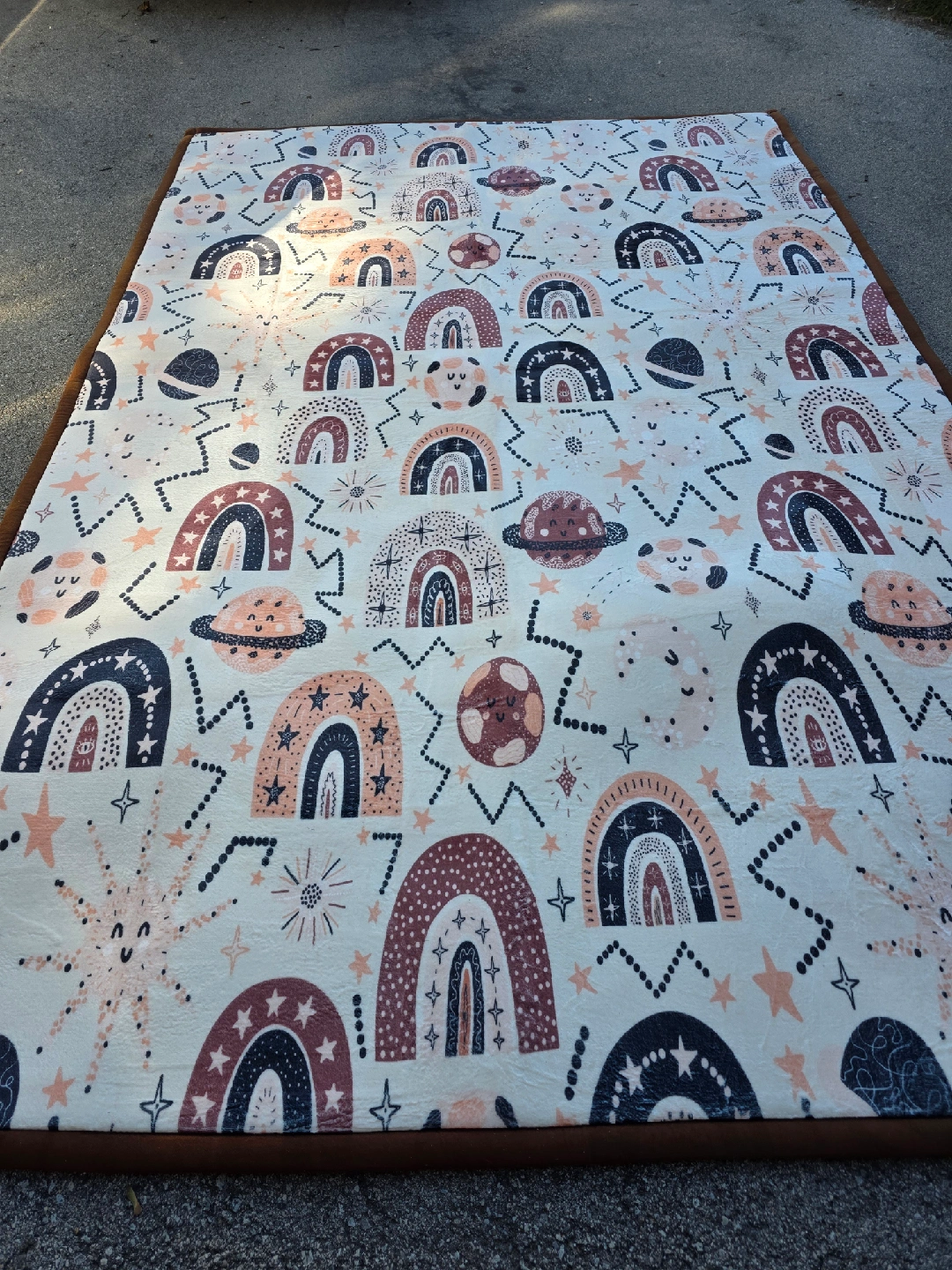 A cute play mat with a rainbow and planet design! The top has a soft, patterned surface, and the bottom has a non-slip backing. Perfect for playtime or tummy time for your little one