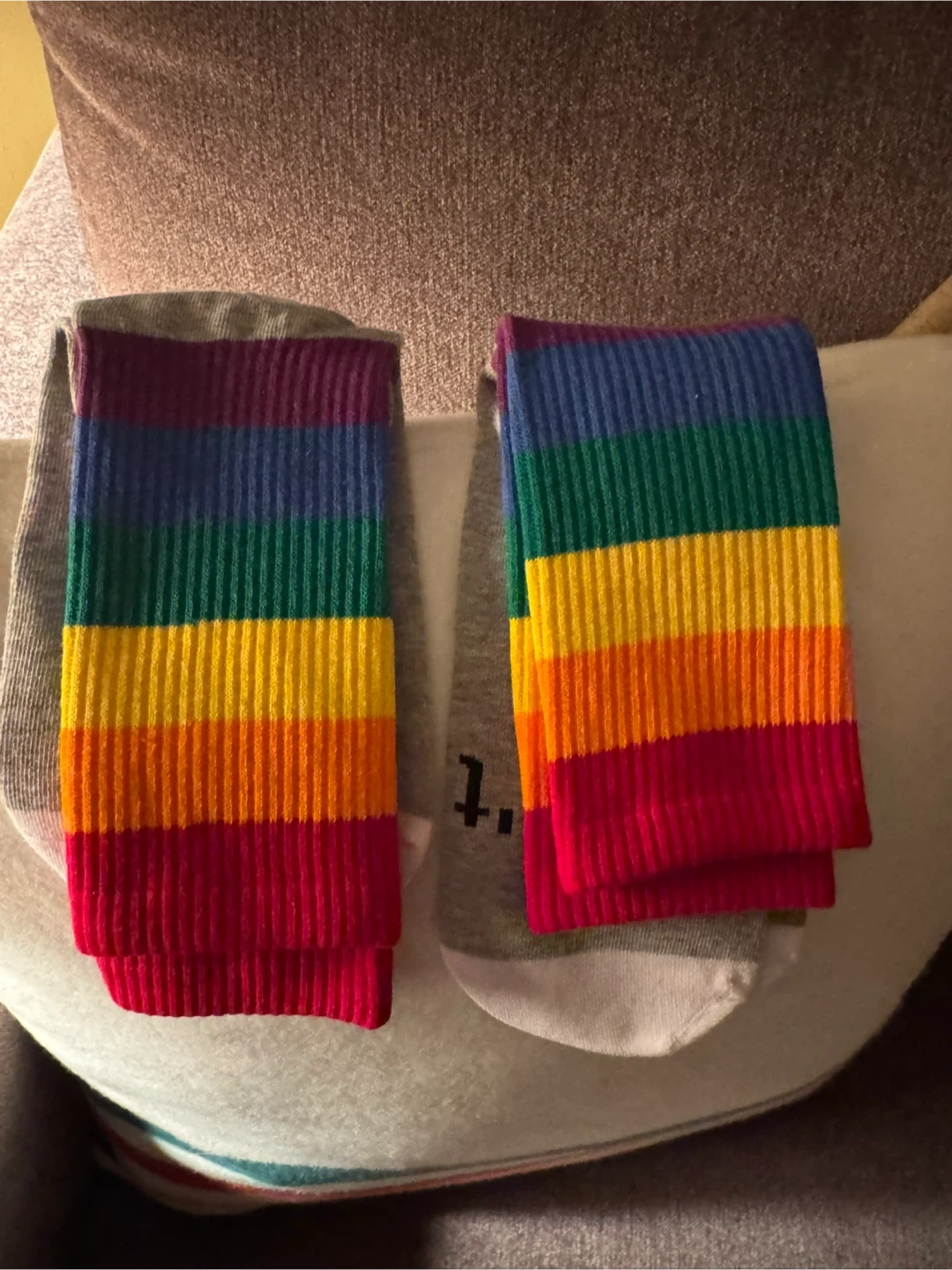 Fun pair of socks with a rainbow design! One sock says 'I Can't Even' and the other says 'Think Straight'. Great for showing your pride or just adding a pop of colour to your outfit