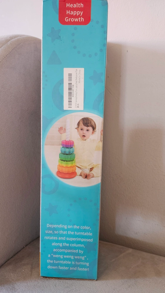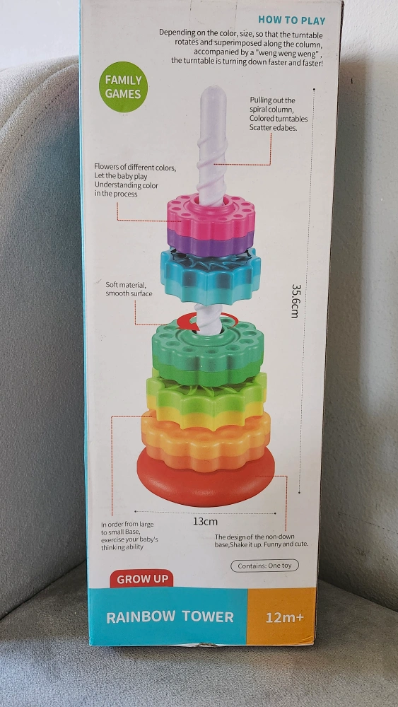 This is a colourful and fun stacking toy for babies and toddlers. It has a variety of features to keep little ones entertained, including a spinning top and colourful gears. The toy is made of high-quality materials and is safe for young children. It is also a great way to help develop baby's fine motor skills and hand-eye coordination.