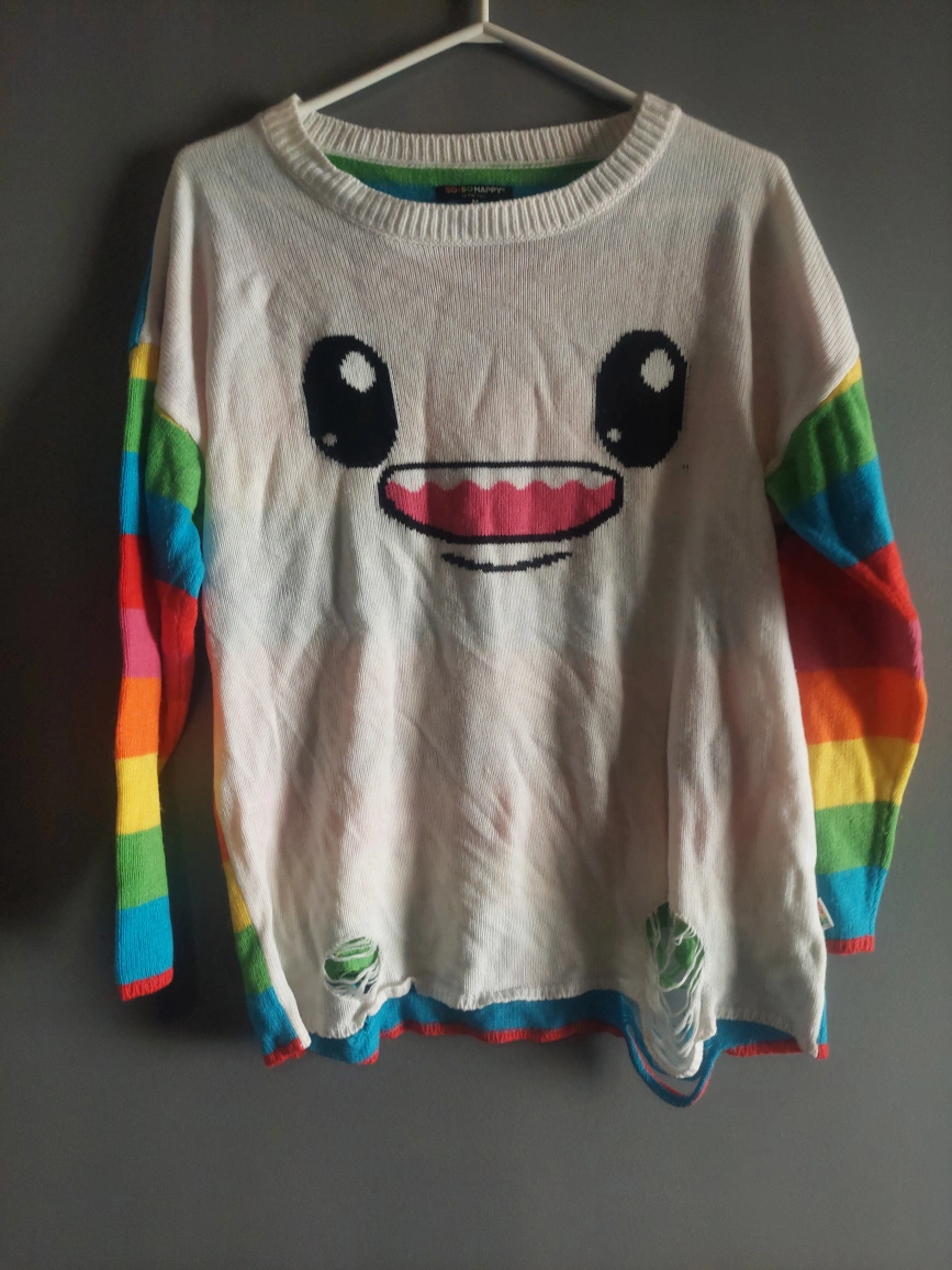 This is a So So Happy sweater by Iron Fist. It's in good condition and would be a fun addition to your wardrobe! There are some distressed details at the bottom. This is much sought after and sells for $250USD and up now!! (you can search Google for confirmation) No longer made and considered a rare find. I paid alot for it but am asking less than current value.