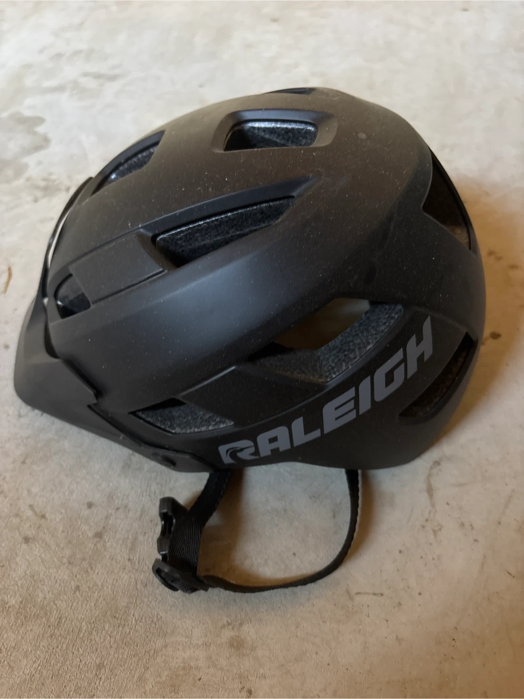 Selling a used Raleigh bike helmet in black. It's in good condition and ready for your next ride!