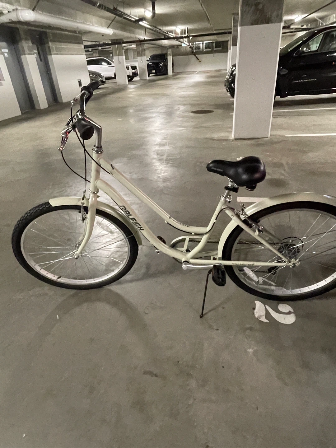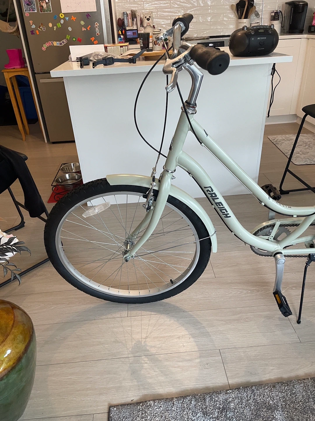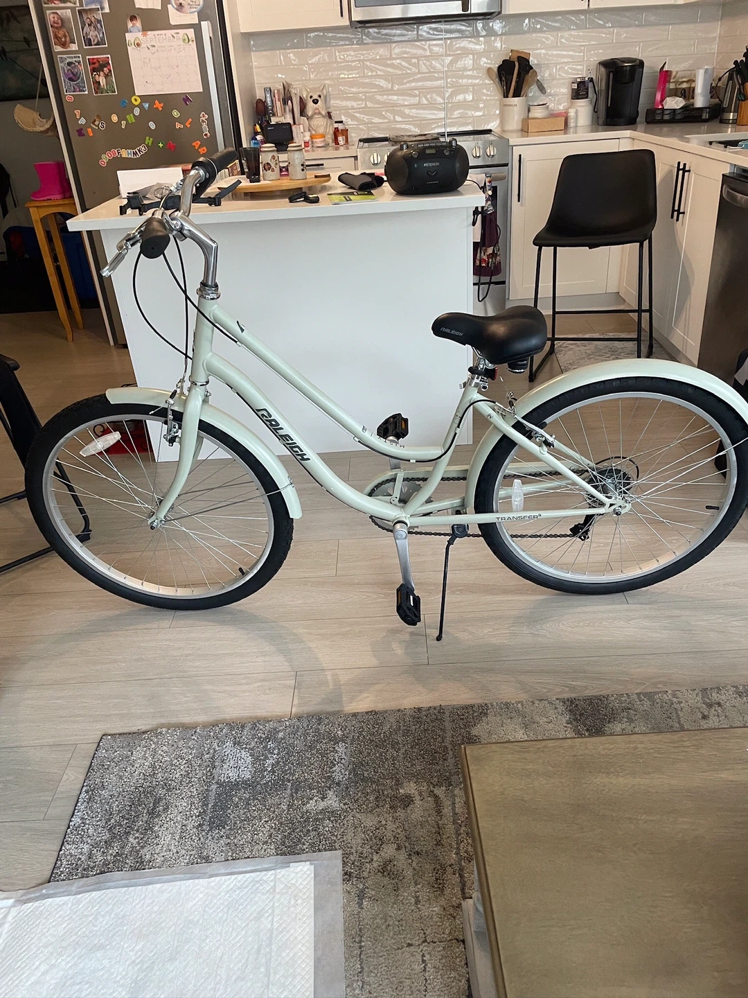 Selling a Raleigh cruiser bike in a lovely mint green colour! It's perfect for leisurely rides around town or along the waterfront. This bike is in good condition and ready for a new owner to enjoy the summer with!