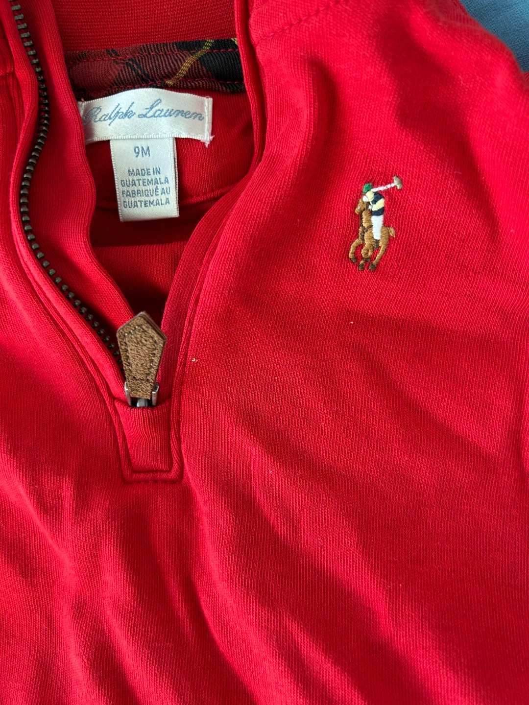 A cute Ralph Lauren red pullover for your little one! It's in great condition and perfect for keeping them warm. The size is 9M, and it features the iconic Ralph Lauren logo.