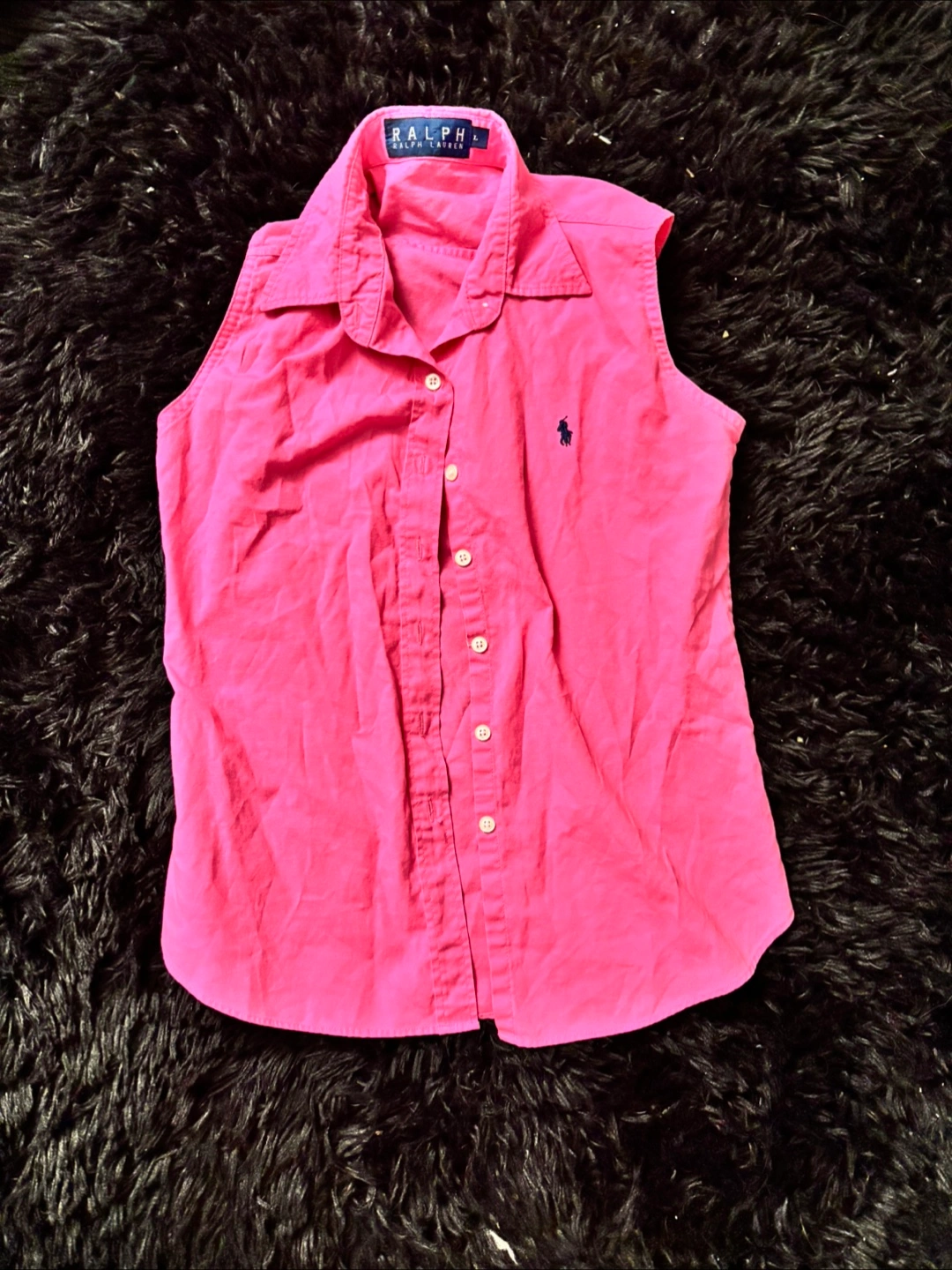 A cute Ralph Lauren sleeveless top in a vibrant pink! It's a size L and made of a comfortable material. Perfect for warm weather or layering. The classic Ralph Lauren logo is embroidered on the front. This top is in great condition and ready for a new home!