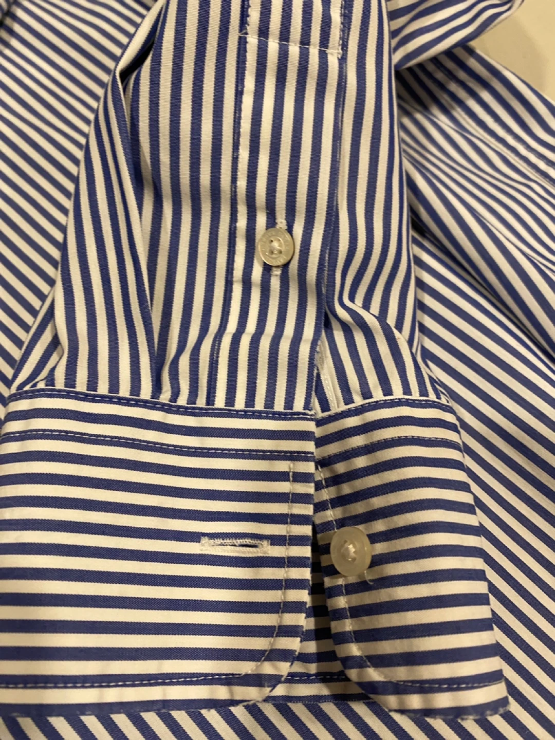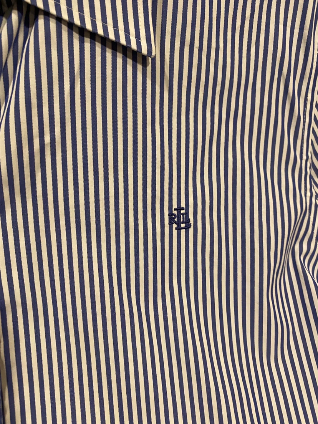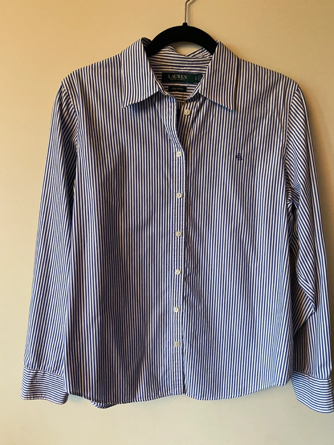 Available for pick up in Crescent Heights near HS or Mount Pleasant near 4th Spot 100% cotton Here's a classic Ralph Lauren button-up shirt in a blue and white stripe pattern. It's a size large and is made with a non-iron fabric, so it's easy to care for. Perfect for a smart casual look! Was $175 new Pick up central nw Mount Pleasant