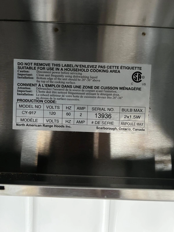 North American Range Hoods CY-917, perfect for your kitchen! This range hood is designed for household cooking areas, ensuring a clean and fresh environment while you cook. It operates at 120 volts and 60 Hz. Model number is CY-917.