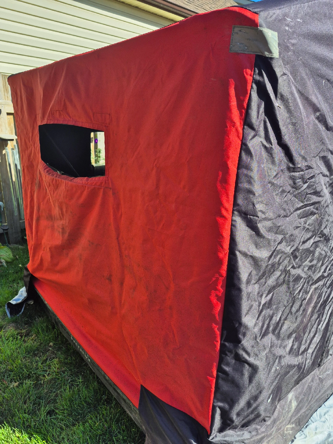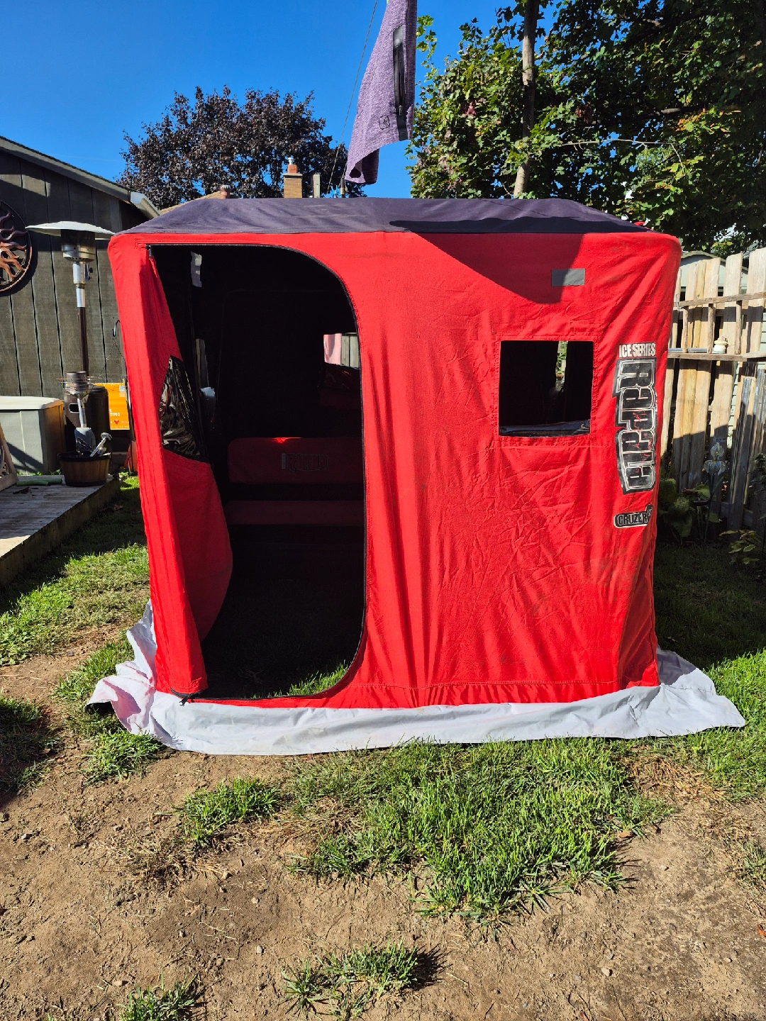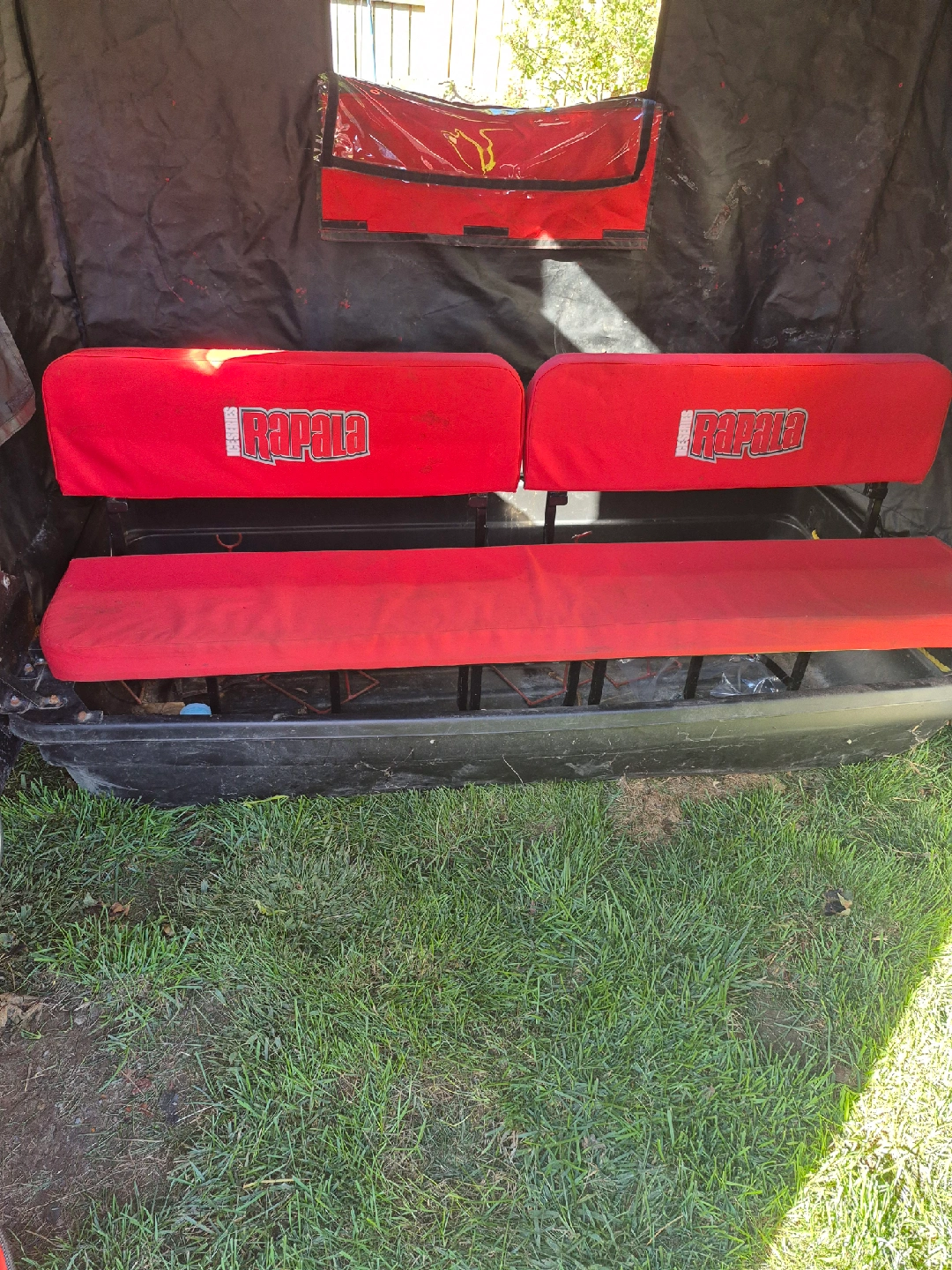 Selling a used Rapala ice fishing shelter. It has a red and black exterior. It comes with a bench seat inside, perfect for staying comfortable while you fish during the winter months!