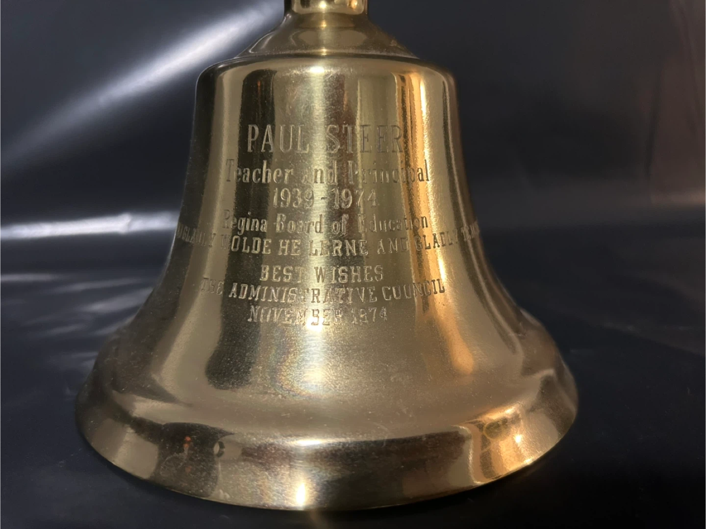 Vintage brass school bell with wooden handle, presented in 1974 as a retirement gift to Paul Steer, teacher and principal with the Regina Board of Education from 1939–1974. The bell is engraved with: “Paul Steer – Teacher and Principal – 1939–1974 – Regina Board of Education – ‘And gladly wolde he lerne, and gladly teche’ – Best Wishes, The Administrative Council, November 1974.” This Middle English quote is from Chaucer’s Canterbury Tales, making the inscription especially unique and meaningful. • Material: Solid brass bell with black wooden handle • Weight: approx. 704 g (1.55 lbs) • Height: 25.4 cm (10 in) • Width (base diameter): 15.2 cm (6 in) The bell produces a loud, clear ring and has a nice aged patina consistent with its age. Overall, it’s in very good vintage condition with minor surface wear. This is not just a decorative piece but also a piece of educational history from Regina, Saskatchewan. Perfect for collectors of vintage school memorabilia, brass bells, or unique presentation items with a documented history.