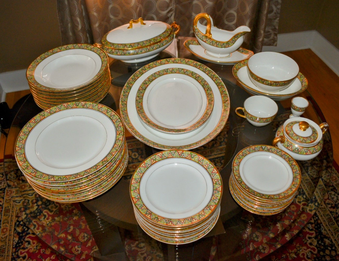 Grouping 1: Antique Dandenaud Limoge China Set - 45 pieces - Pattern Berber573 from France: set contains 8 DP, 9 LP, 9 SP, 8 soup bowls, 2 platters, 2 bowls, gravy boat & plate, covered vegetable, sugar bowl, 1 coffee cup and 1 egg cup Grouping 2: B&CO White, gold rimmed china - 13 pieces from France: set contains teapot & cover, sugar bowl, 2 coffee cups & saucers, 2 compote cups & saucers, 2 LP and 2 SP