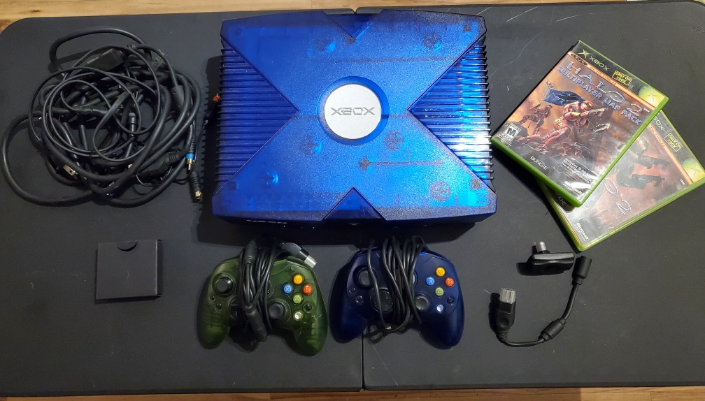 Crystal blue, Halo 2 Canadian region special edition X box bundle. All items are in full mint condition. This is one of the most complete and best condition bundles for the crystal blue xbox, the only piece missing is the extremely rare crystal blue TV set. $1000 OBO. Bundle includes: Xbox console Rare jewelled crystal blue and crystal green controllers Copy of Halo 2 and Halo 2 extra map pack edition Original rechargeable batteries Dvd playback attachment
