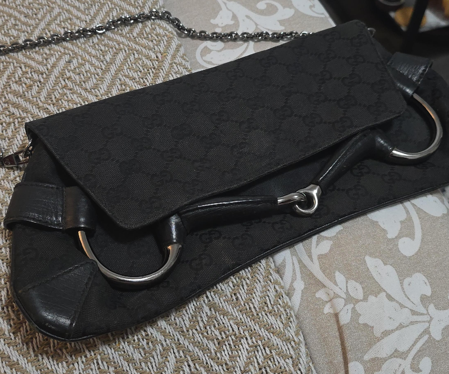 This Gucci shoulder bag is in great condition and ready for a new home! It features a classic black canvas design with a chain strap. Perfect for adding a touch of luxury to your everyday look. The bag has a stylish and timeless design.