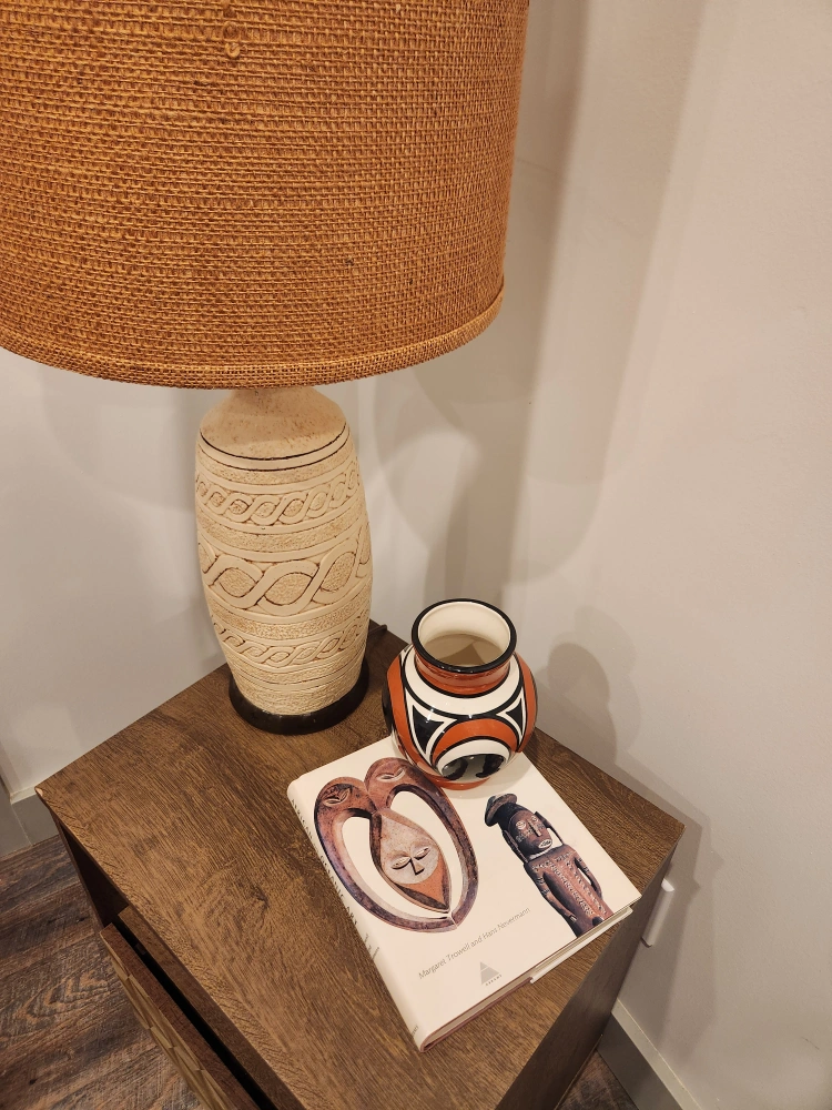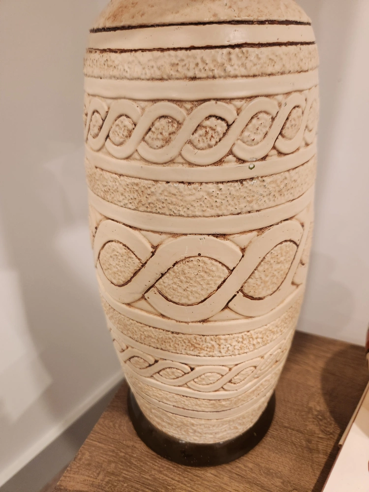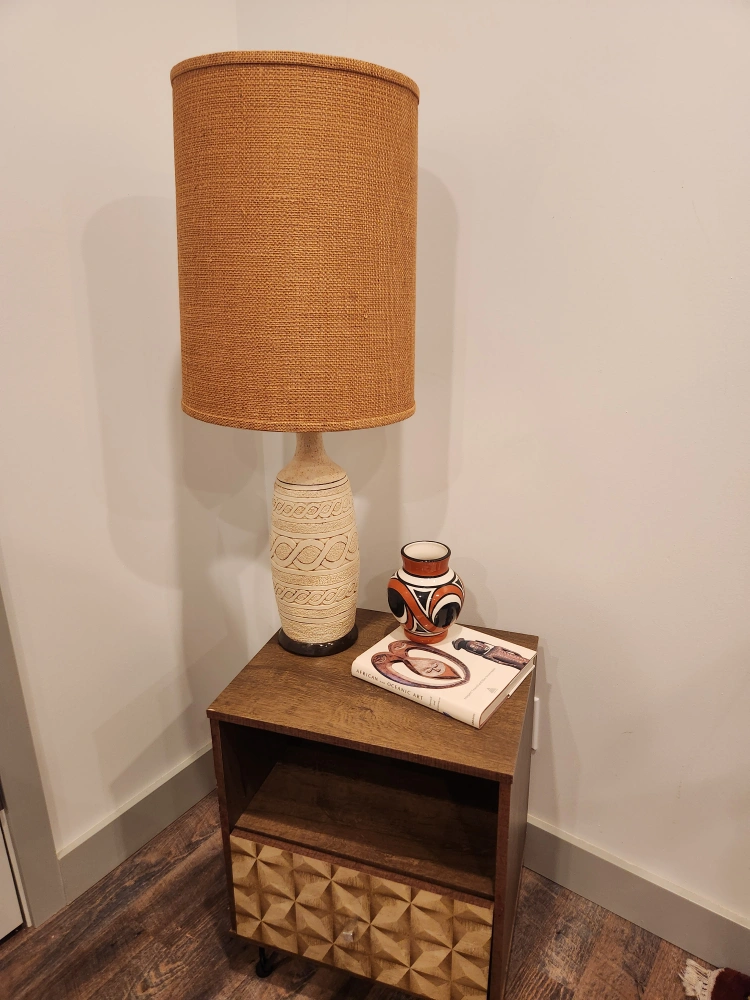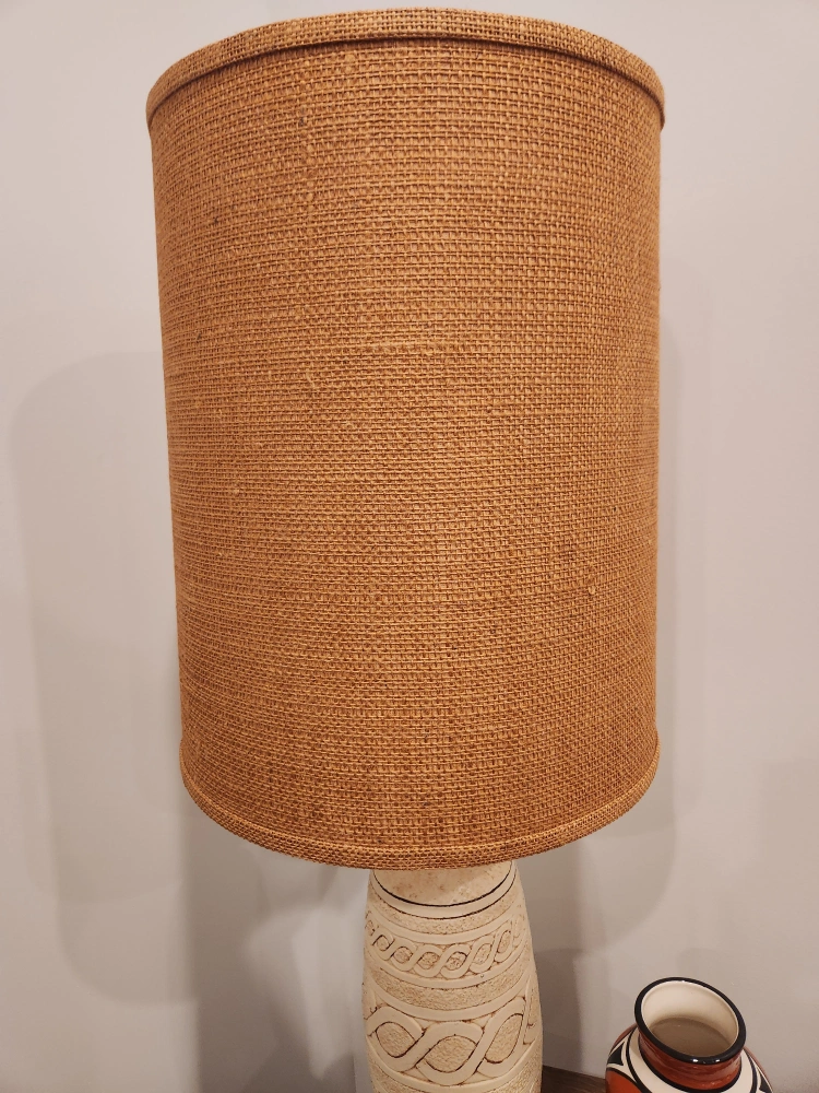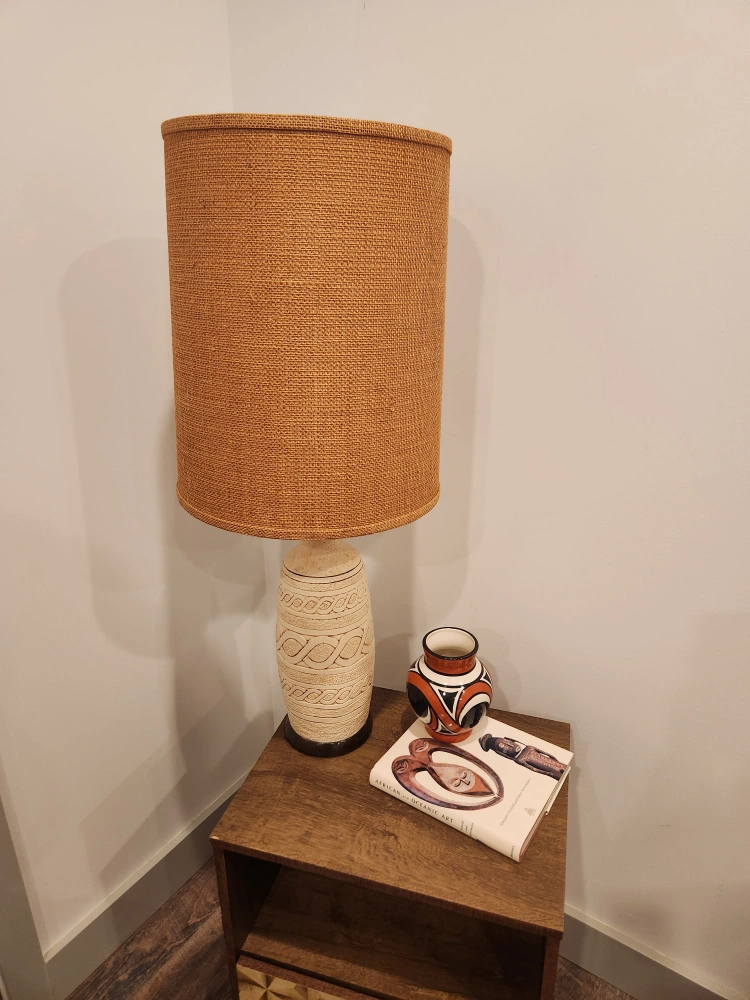 This MID CENTURY pottery table lamp has a reoccurring pattern base . It features a textured, off-white base with a woven, burlap lampshade. It would make a great addition to any room! 36 inches high and marvelous mid century style.