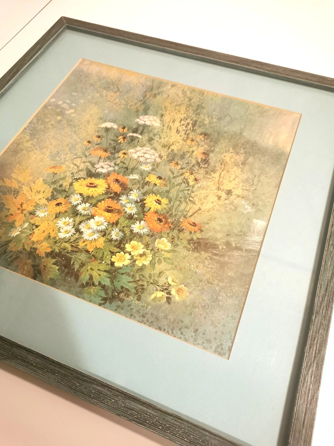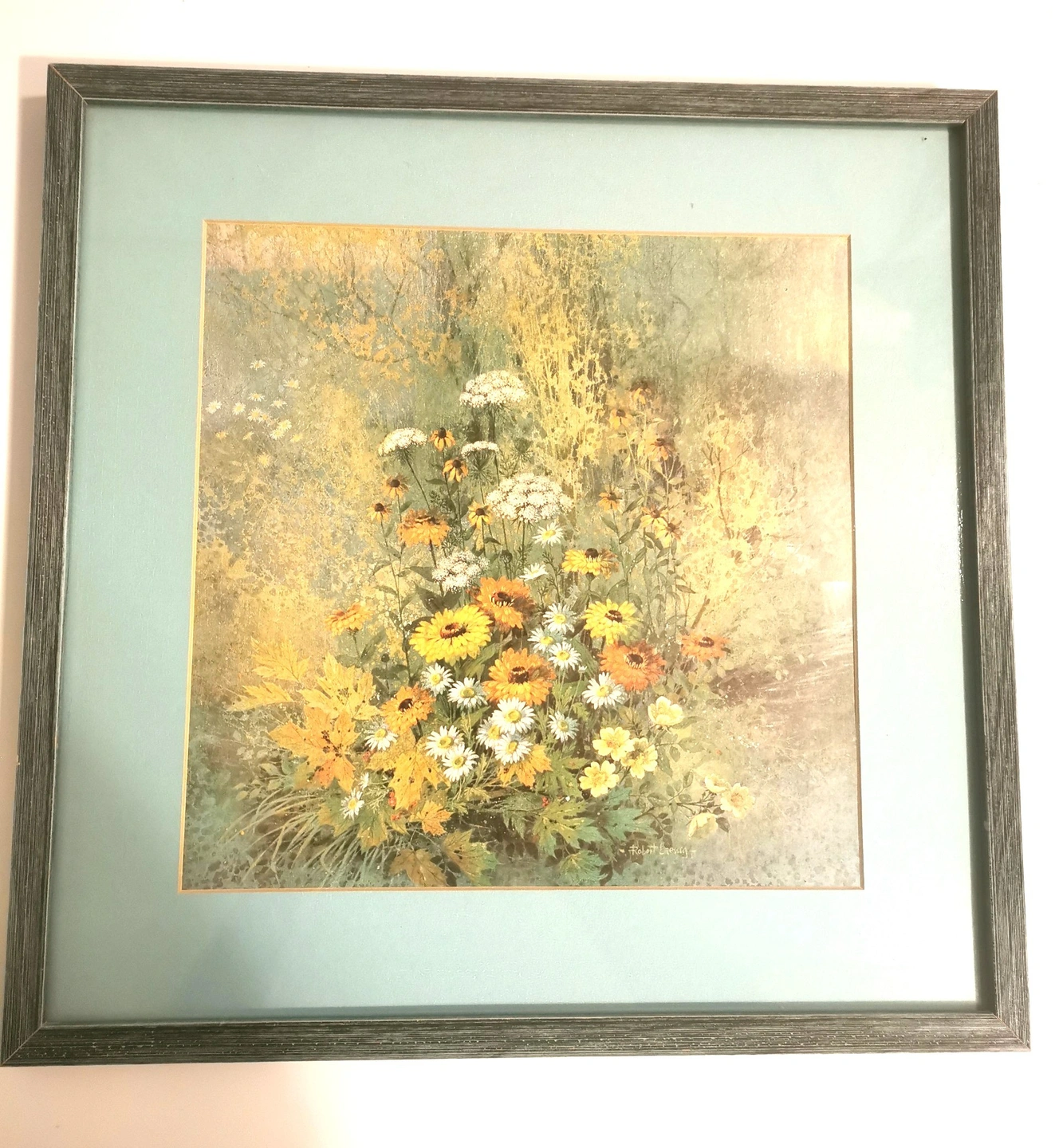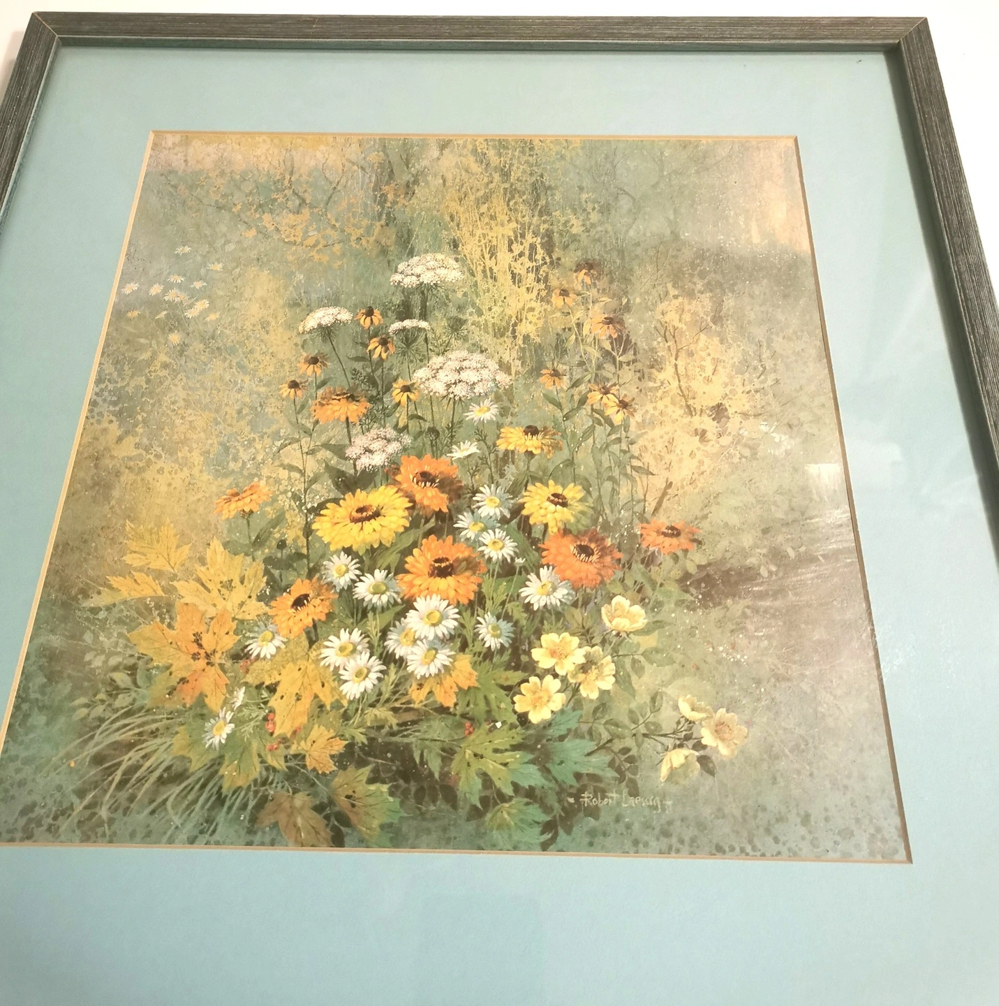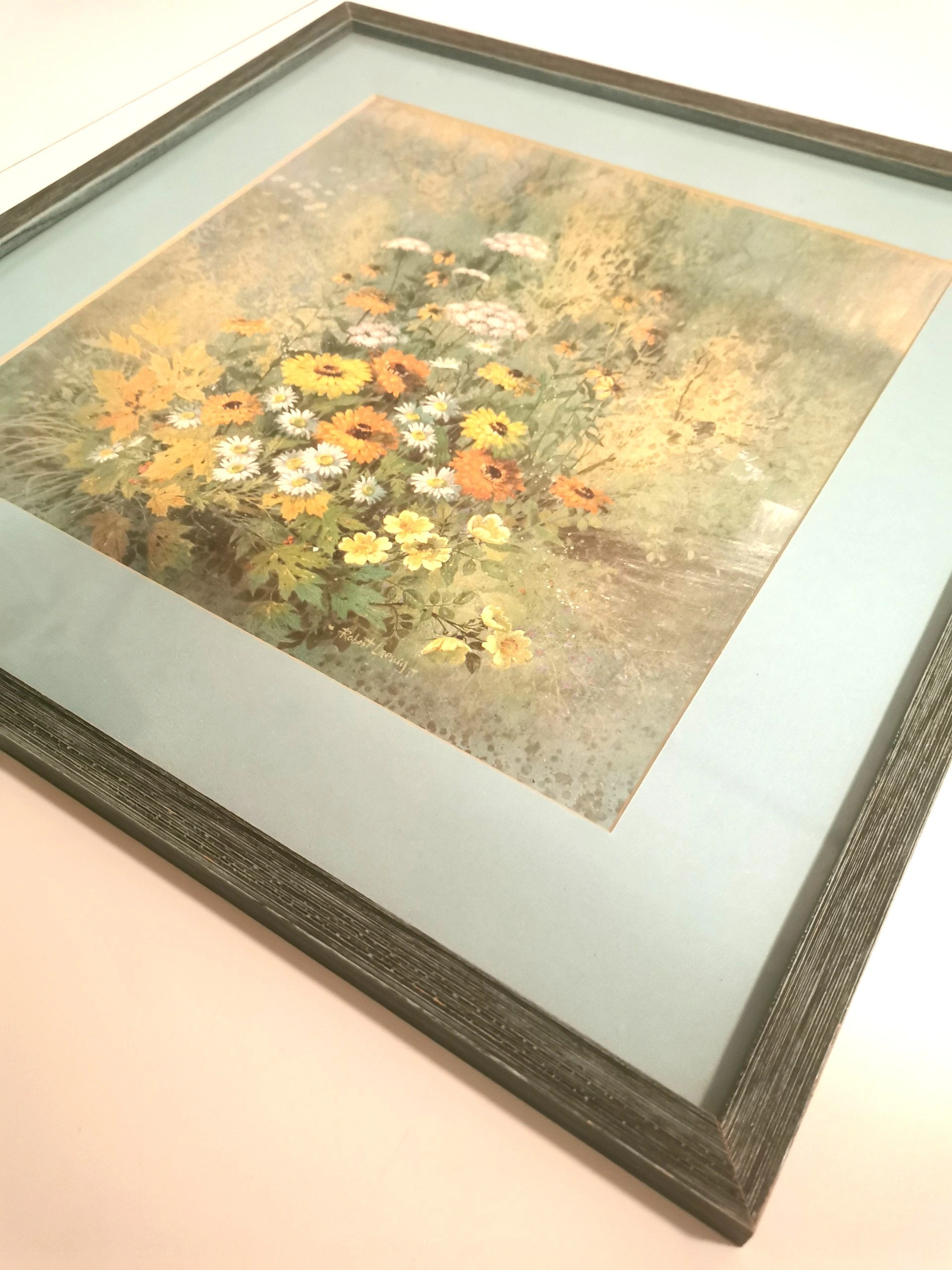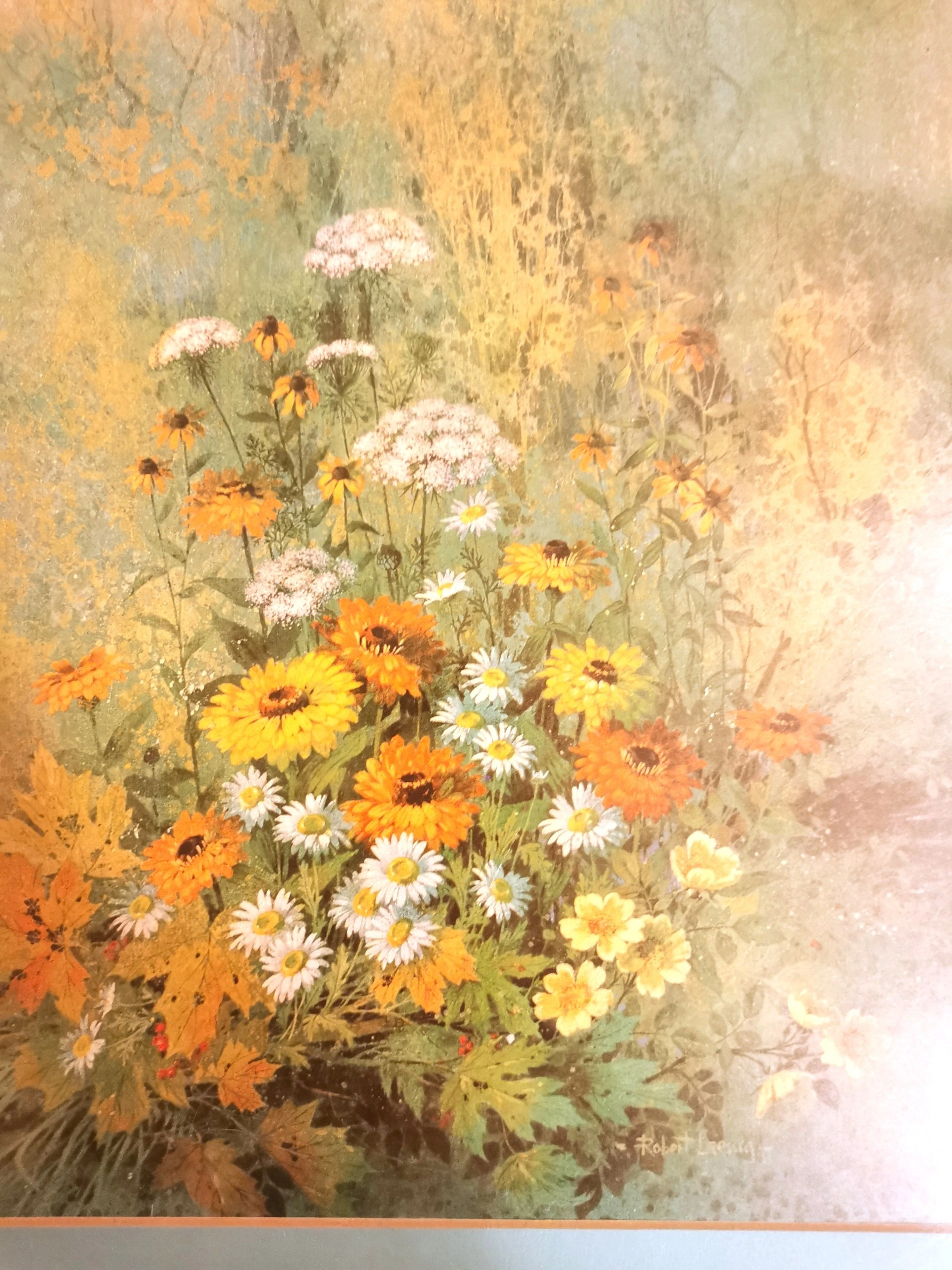 Explore the charm of vintage mid-century art with this Robert Laessig floral lithograph print, dating back to the 1970s. The piece showcases Laessig's talent for capturing the natural beauty of flowers through his artistic vision, making it a timeless addition to any collection. With its medium size, this print is perfect for adding a touch of elegance and sophistication to your living space or office. The lithograph technique used in its production ensures a high-quality representation of the artist's original work, allowing you to enjoy a piece of art history in your home. Condition: Good vintage condition light wear please reference photos as they are part of the description. Dimensions- Height 17 inches, WIdth 17 inches, Depth 1 inch