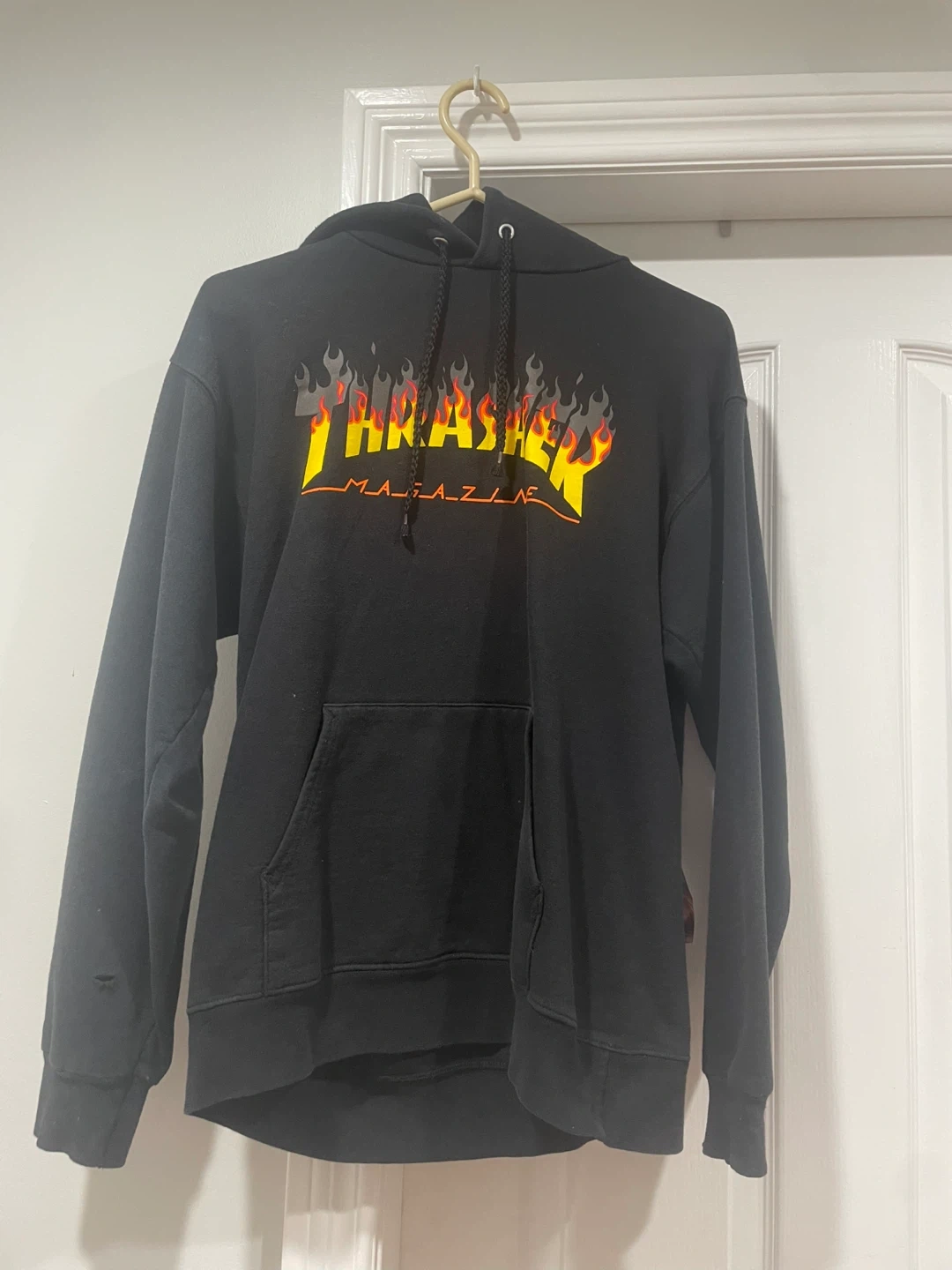 Selling a Thrasher Magazine hoodie in black. (This design has been discontinued and is hard to find) it has a small hole in the sleeve