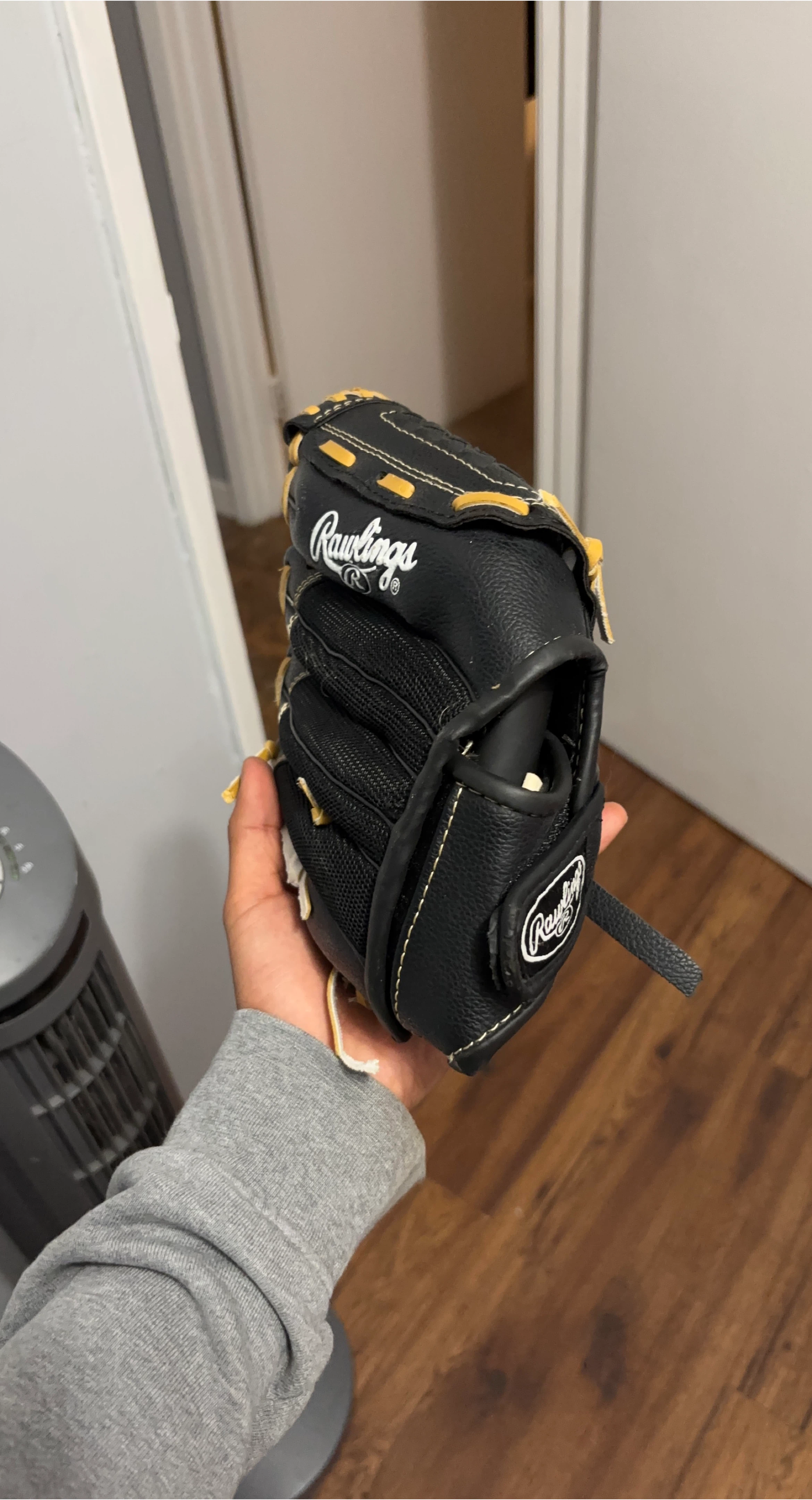Selling a Rawlings baseball glove in black. It's in great condition and ready for the next game! Perfect for baseball enthusiasts