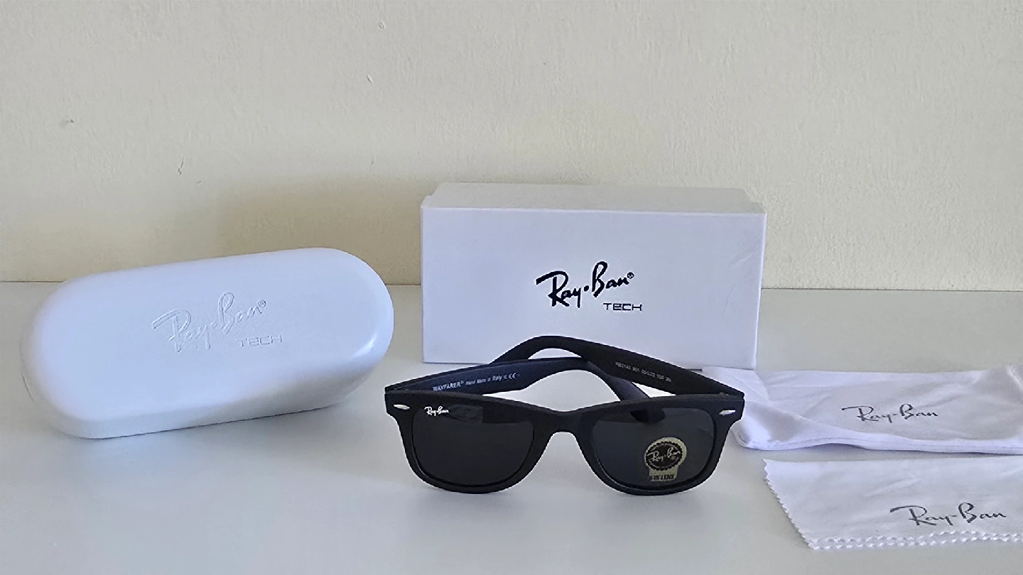 Selling a pair of classic Ray-Ban Wayfarer sunglasses in black! They're in great condition and come with the original Ray-Ban TECH box and case, as well as two Ray-Ban cleaning cloths. The model number is RB2140 901 50-22 150 3N. A stylish accessory to complete any outfit!