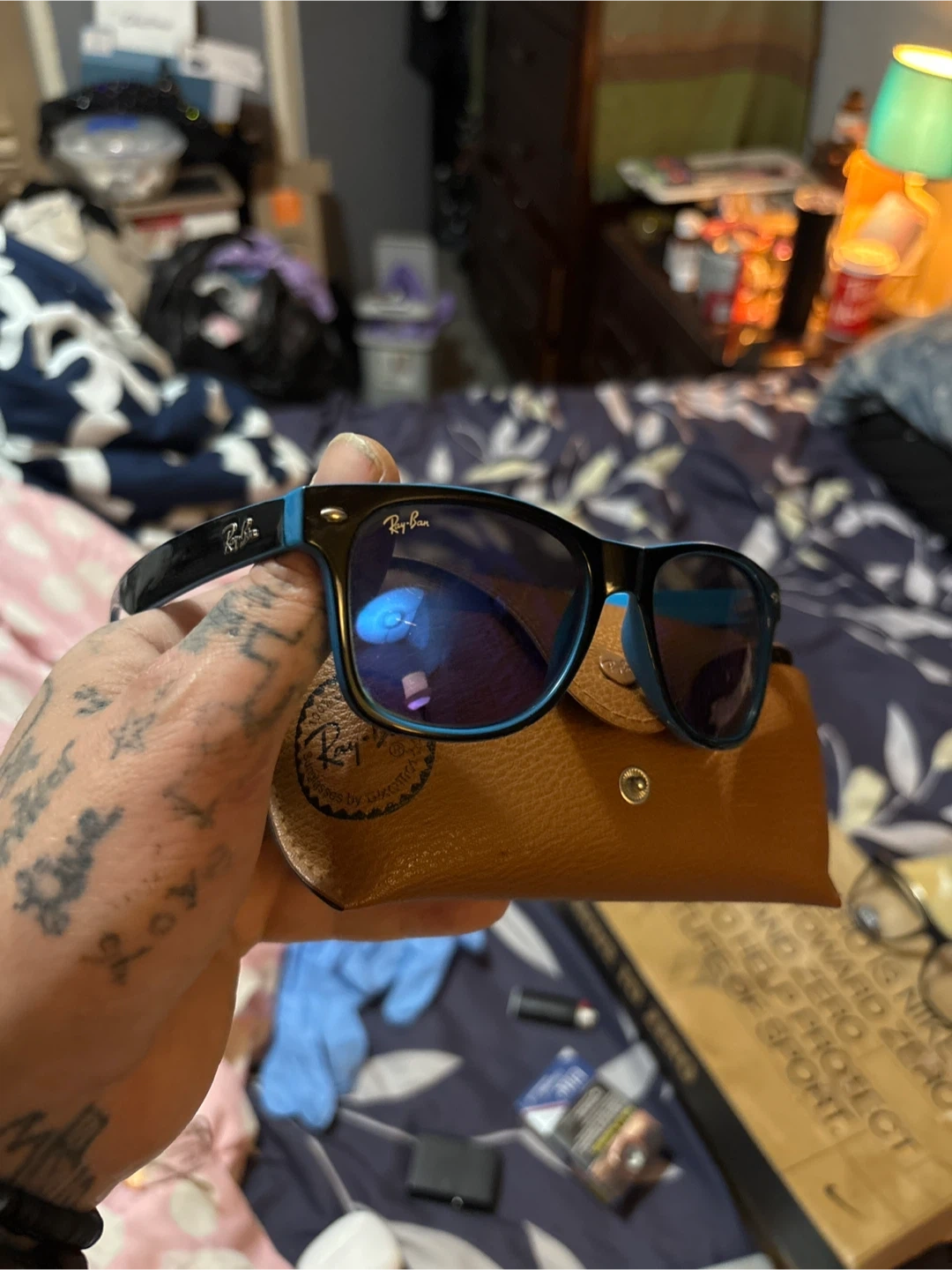 Selling a pair of Ray-Ban Wayfarer sunglasses. They feature a stylish black frame with a cool blue accent. Comes with the original Ray-Ban case to keep them protected! Originally 240 so 120