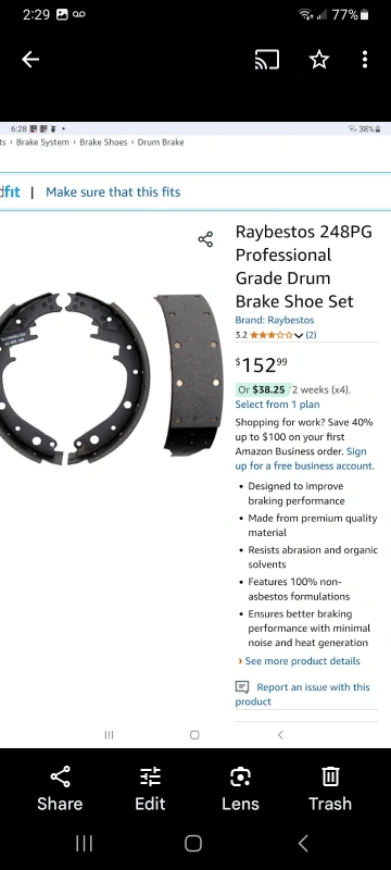 Selling a Raybestos 248PG Professional Grade Drum Brake Shoe Set! These are designed to improve braking performance and made from premium quality material. They also resist abrasion and organic solvents. Features 100% non-asbestos elements and ensures better braking performance with minimal noise and heat generation