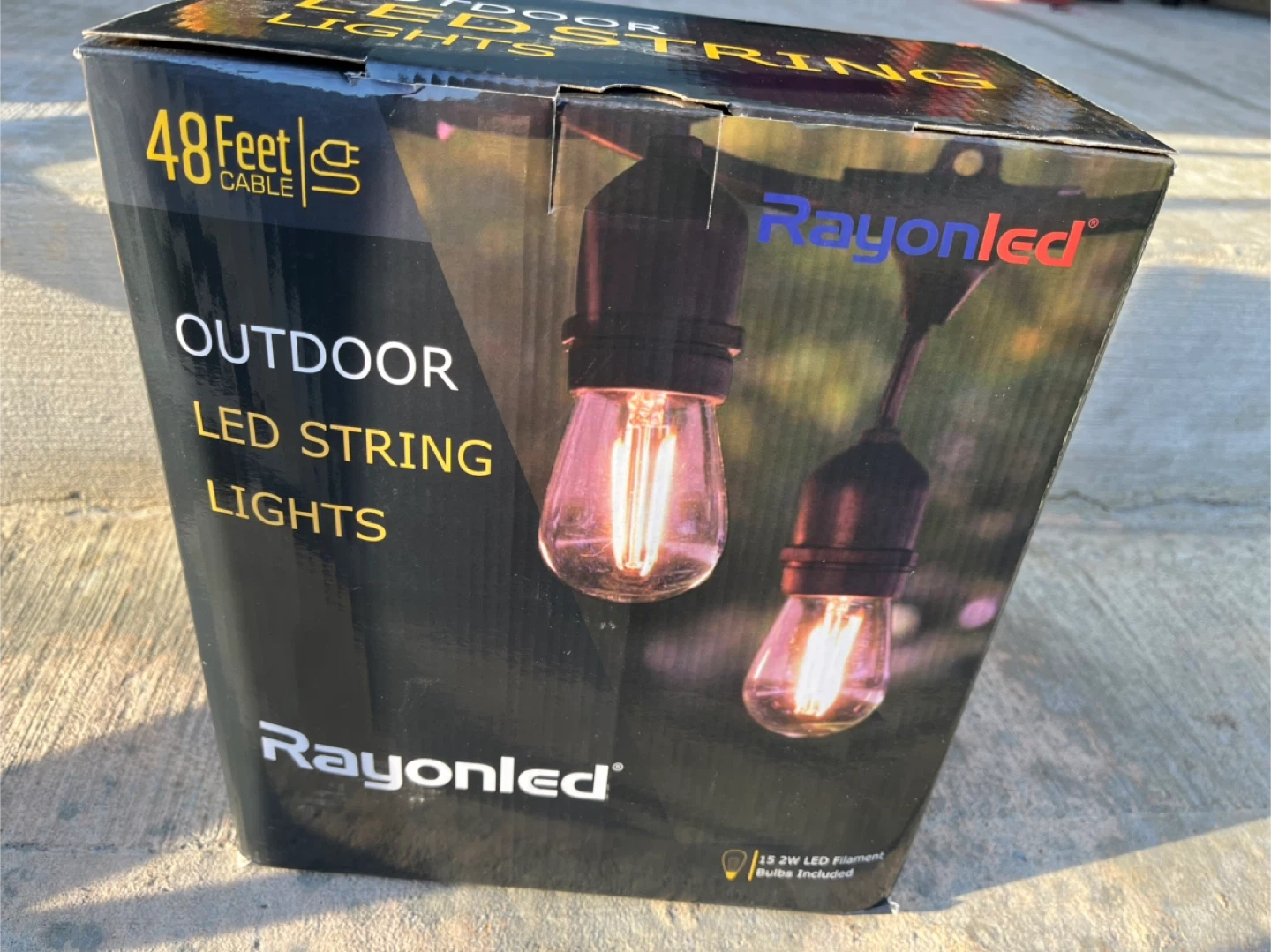 Selling a brand new set of Rayonled outdoor LED string lights still in the box! These lights are perfect for adding a warm and inviting glow to your outdoor space. Bulbs not included - 48 feet (14.63 m) in length - Bulb spacing: 3 ft (0.9 m) - Socket: 15 sockets IP65 - Weatherproof - 15 2W LED Filament Bulbs Included - Shape: S14 Non-Dimmable - Link up to 40 Strands together - Uses Only 30 Watts (15 bulbs) - Maximum Wattage: 1400 W - CCT and Voltage: 2700K/120V