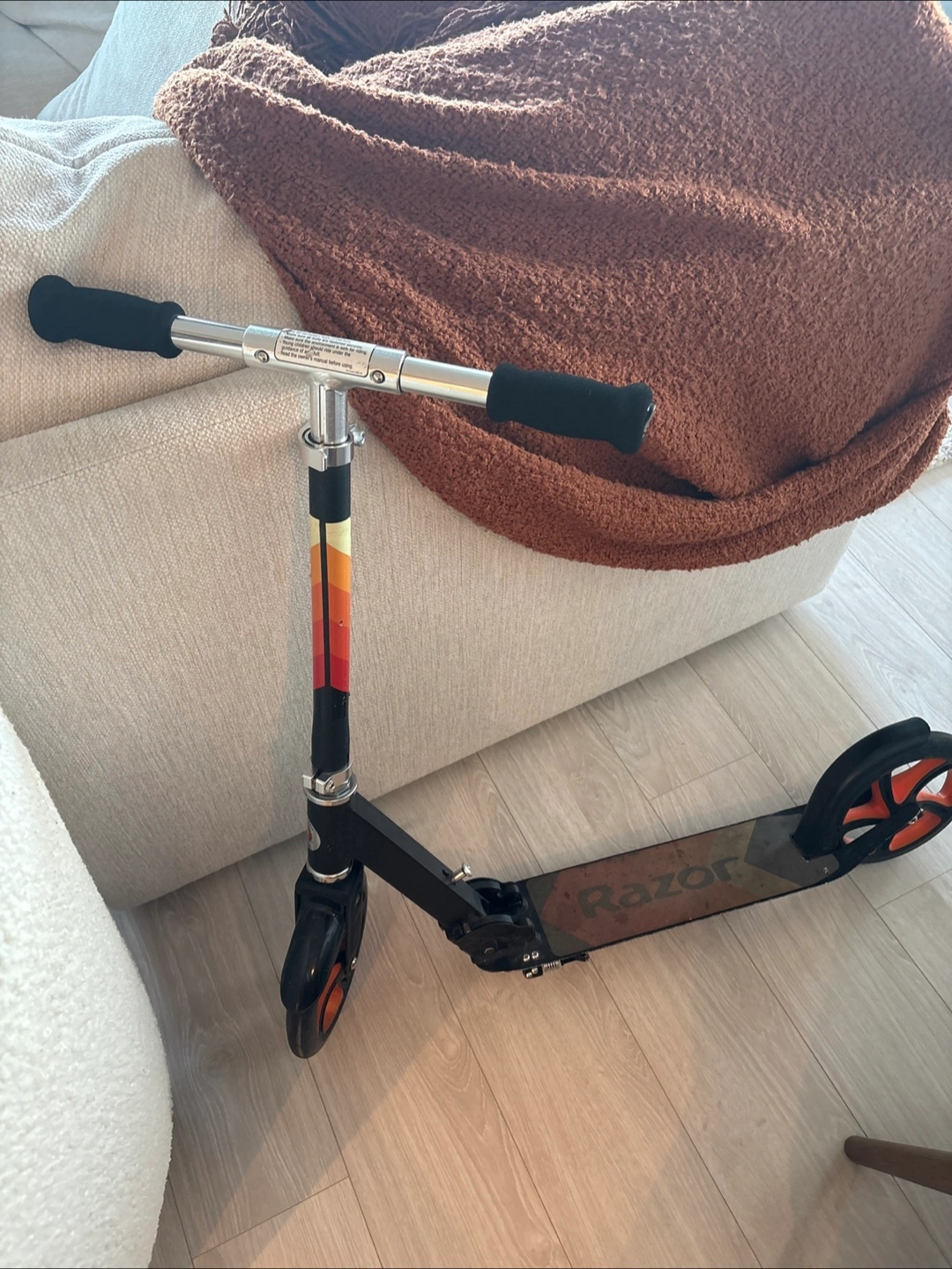 Selling a used Razor scooter. It's black with orange wheels and has some signs of wear on the deck. Great for kids who want to scoot around the neighbourhood!