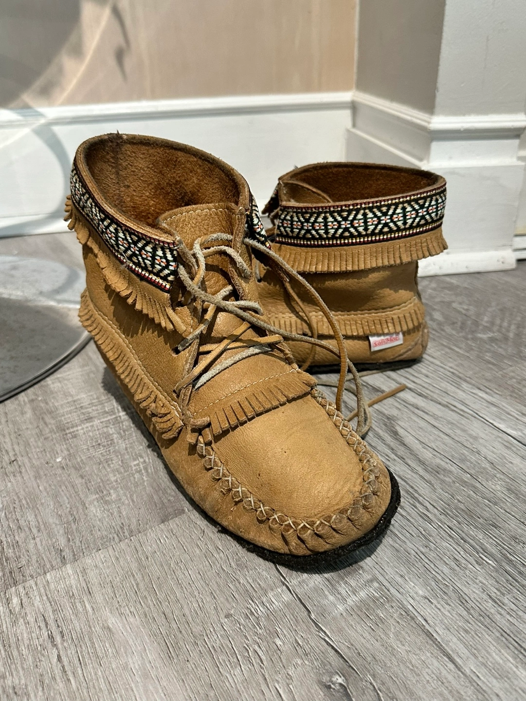 Pair of size 8 women's genuine leather ankle moccasin boots. Tan leather. Fringe detail. Woven accents. Lace-up closure.