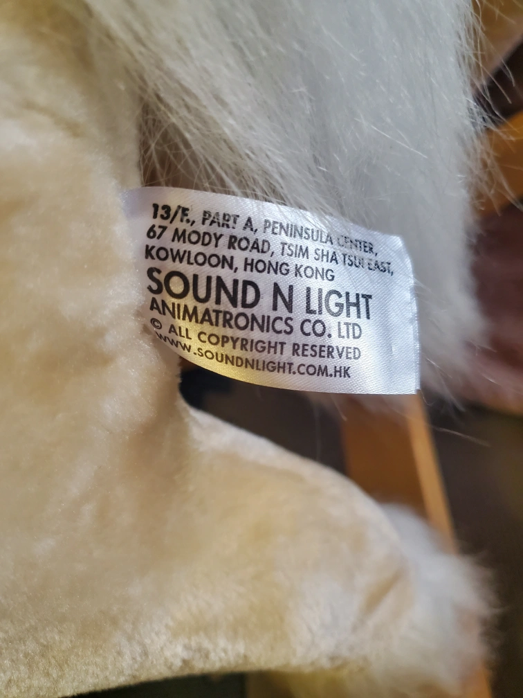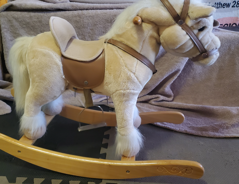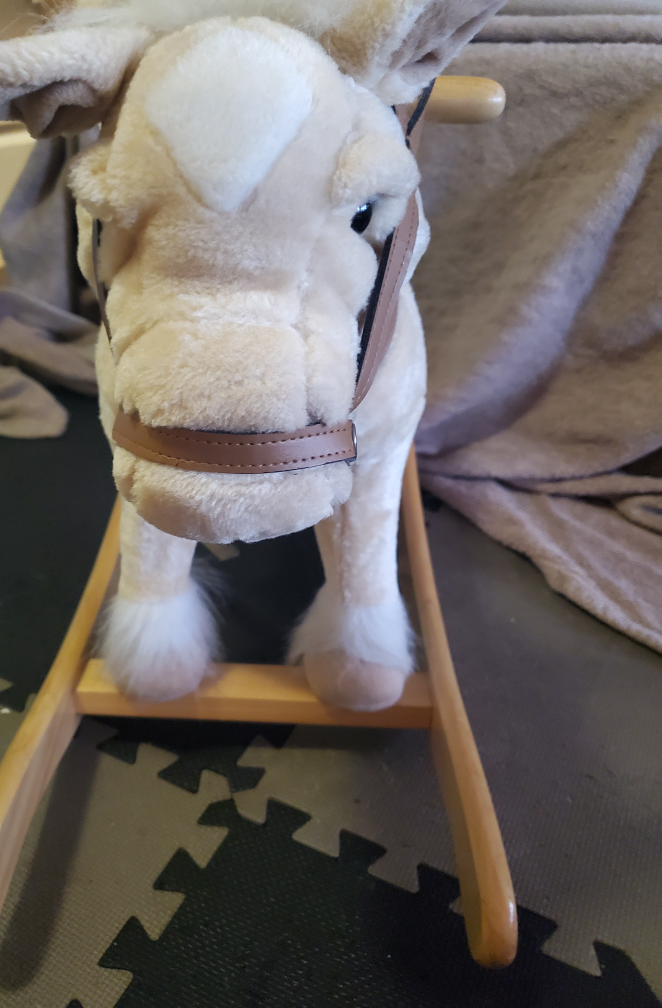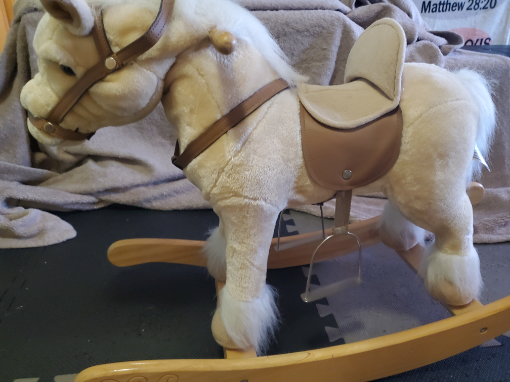 Sound N Light Rocking Horse. Comes with a saddle and reins and neighs. The horse is beige with a white face and white hooves. The rocking base and handles is made of wood. the ears amd tail move when you push the button. Safe and comfortable. weight capacity 160pds