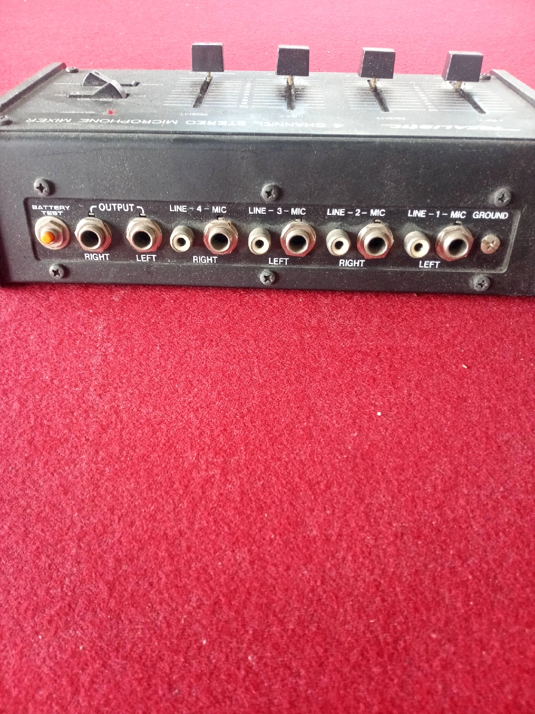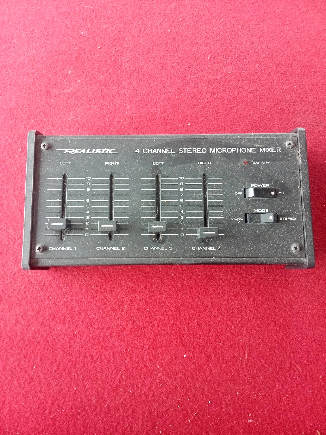 Selling a Realistic 4 Channel Stereo Microphone Mixer. It has controls for four channels, each with left and right adjustments. There's also a mode switch for mono or stereo output and connections for microphones and line inputs. 2 available ( $65 each or both for $115 )