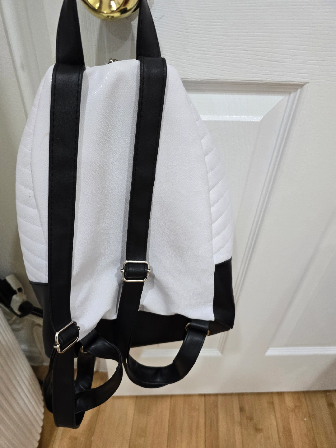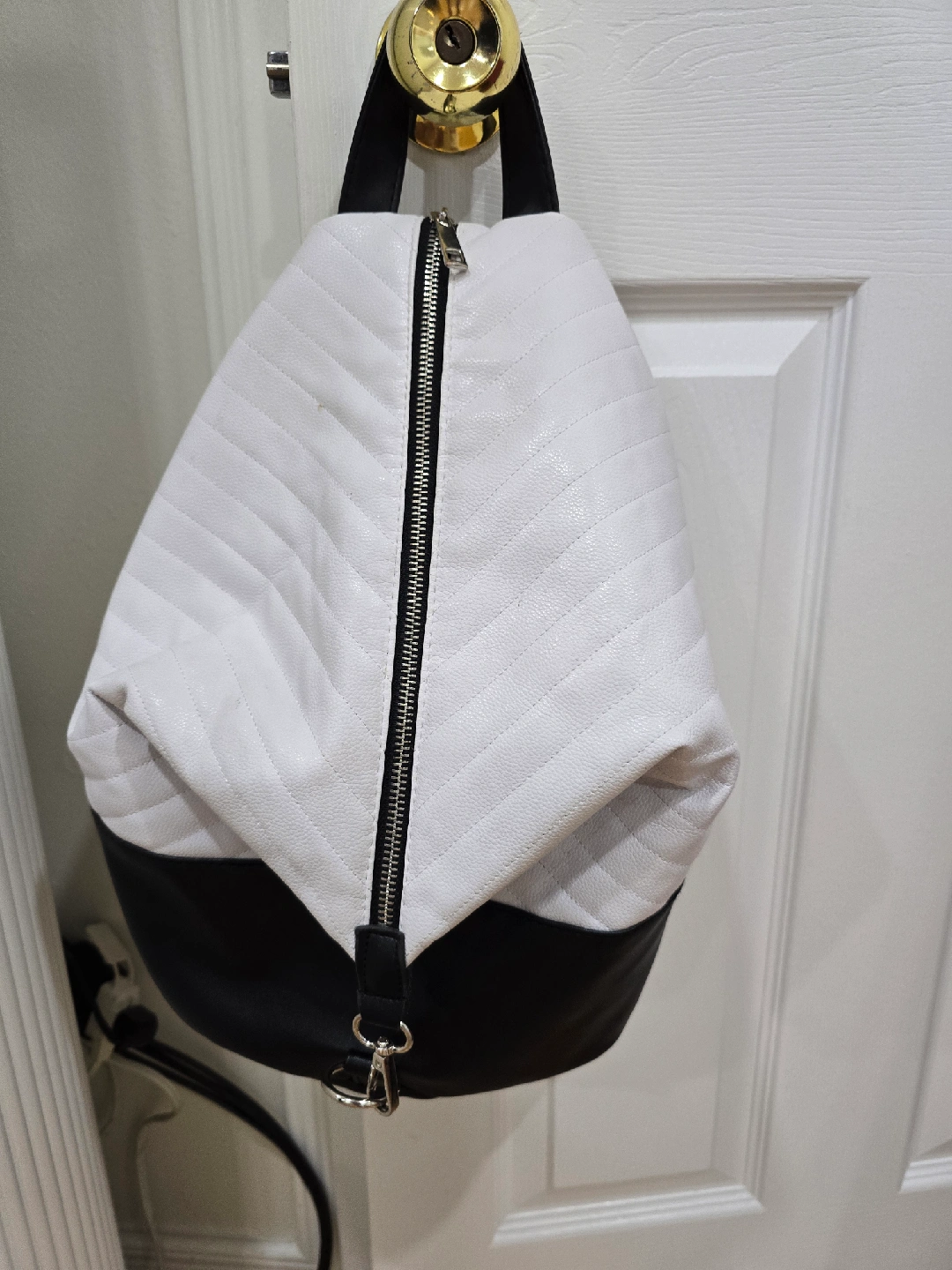 Selling a Rebecca Minkoff Julian backpack in a stylish white and black colour combination. It's a great size for everyday use and has a unique design with a front zipper. Perfect for carrying your essentials around town!