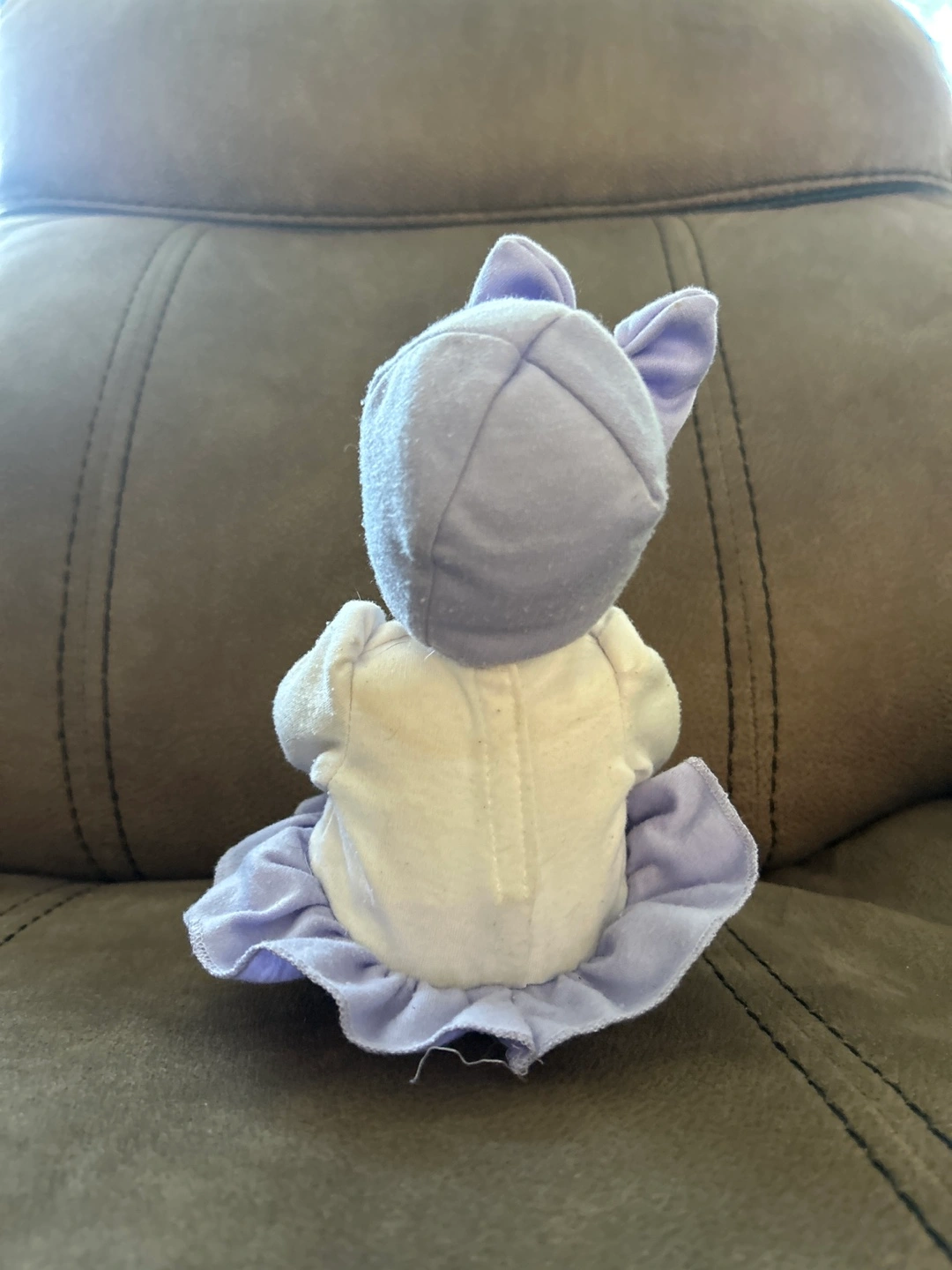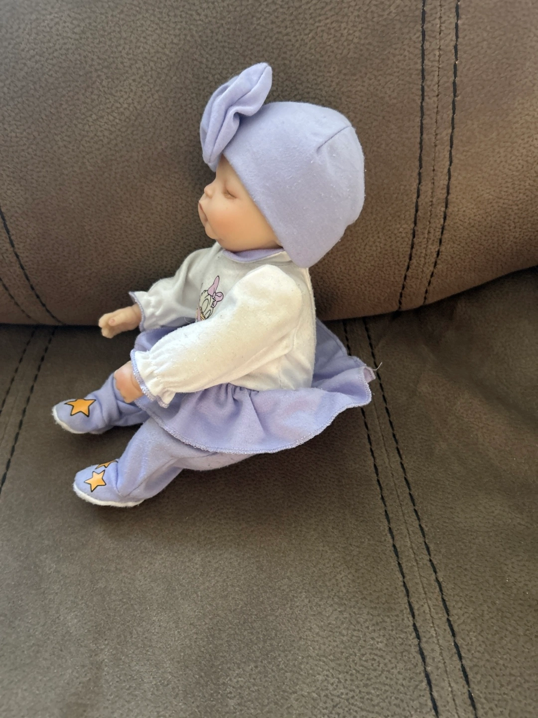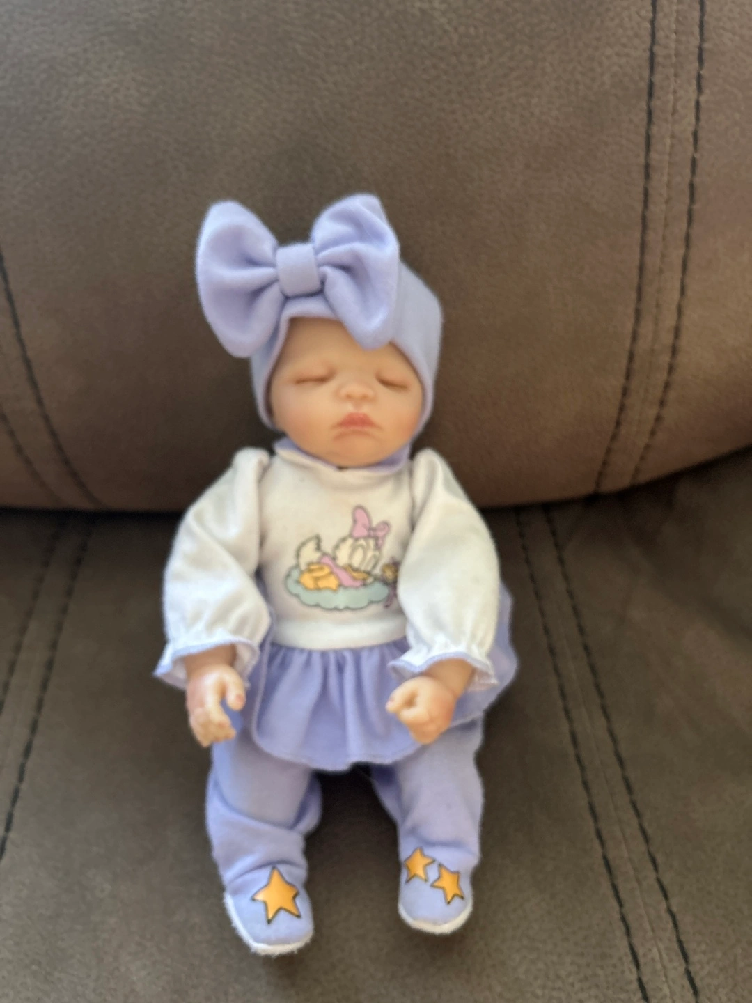 This is a sweet reborn baby doll dressed in a cute purple outfit. It has a matching headband and little star details on the shoes. Perfect for collectors or as a special gift!