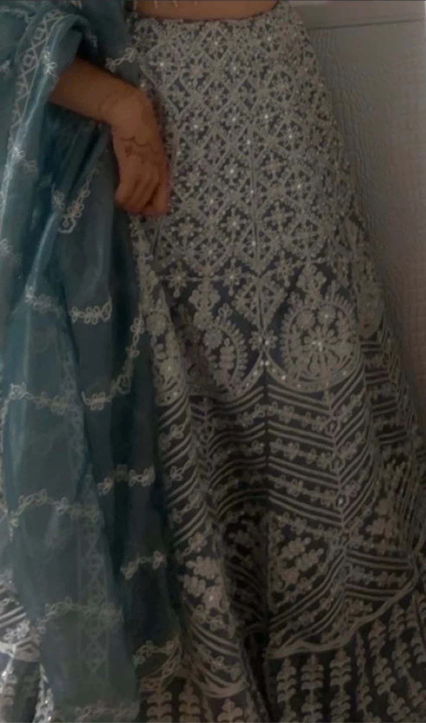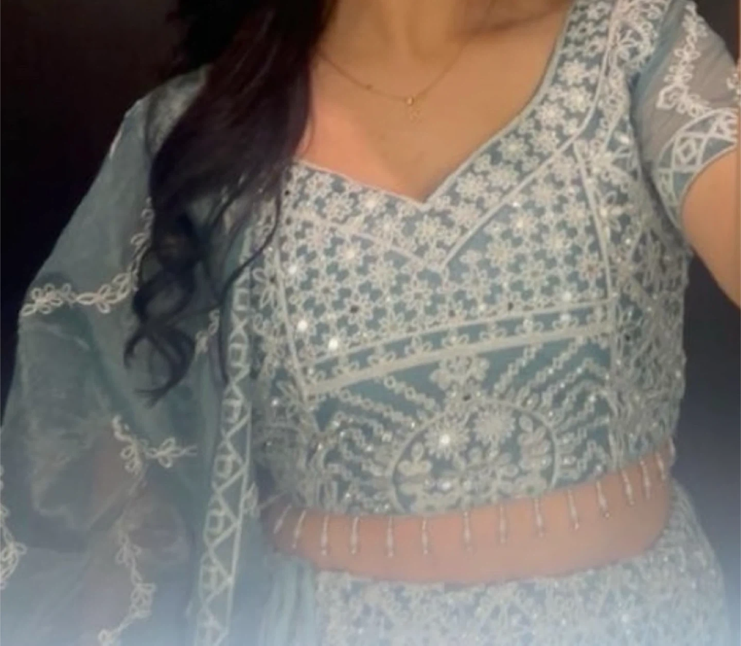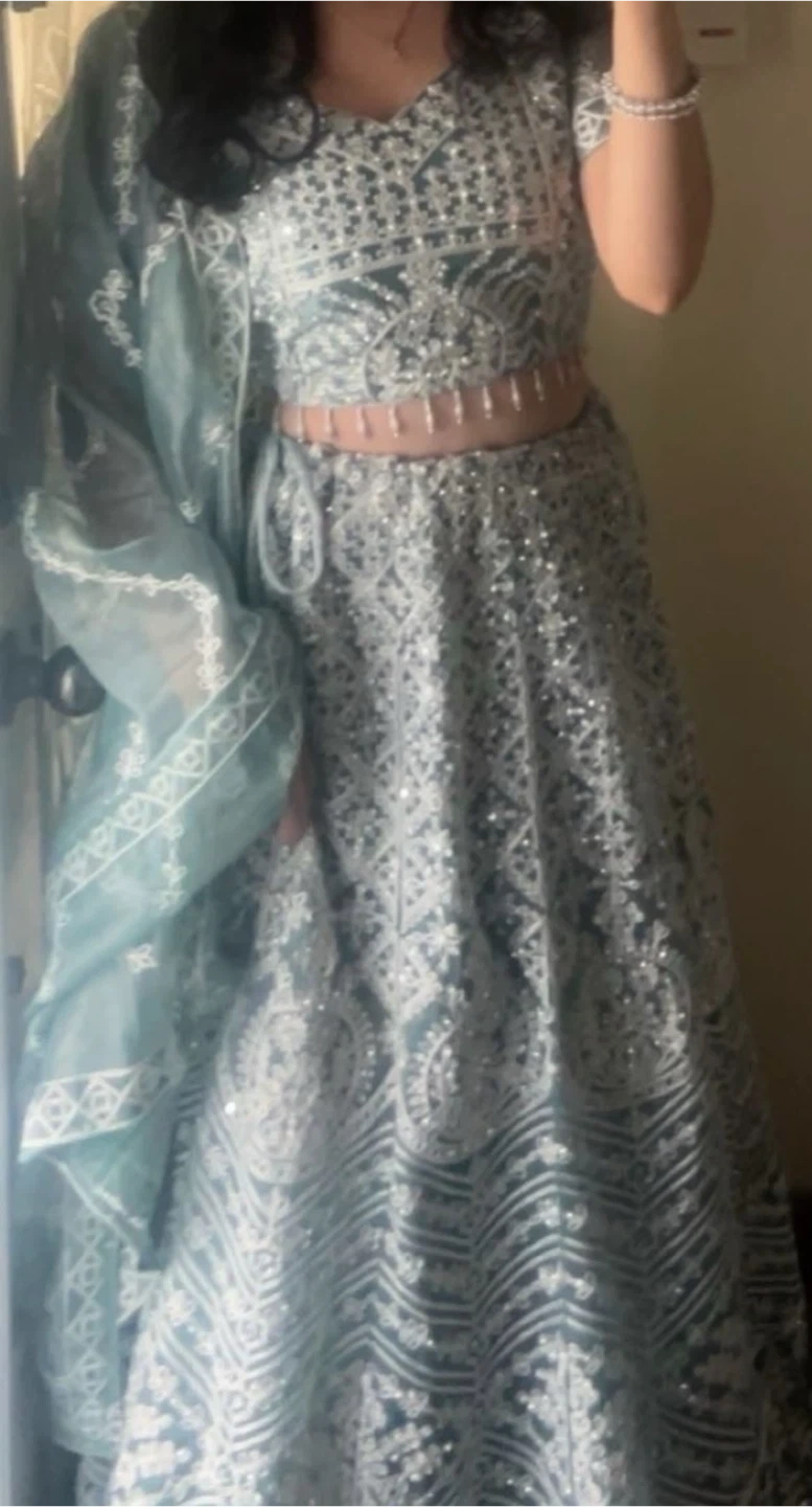 Selling a lovely lehenga choli set. The set is a beautiful blue-grey colour and has intricate designs with heavy stone and mirror work on front and back. Comes with a shimmer tissue fabric dupatta giving it an elegant and elevated look. It's in amazing condition and perfect for a special occasion! Purchased for $250.