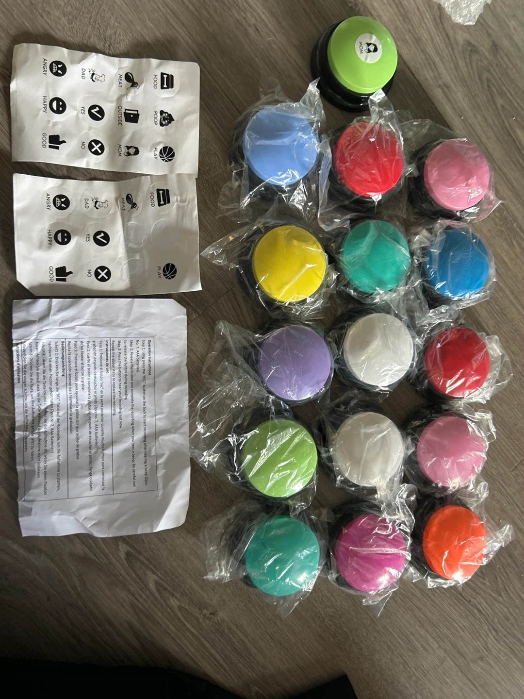 I have a set (16) of recordable talking buttons! These are great for training pets, kids, or even for games and pranks. They come in a variety of colours and are still sealed in their original packaging. Each button requires 2 AAA batteries (not included) to operate. Record your own voice or sound effect and press the button to play it back. Amaze your visitors while your pet pushes the buttons.