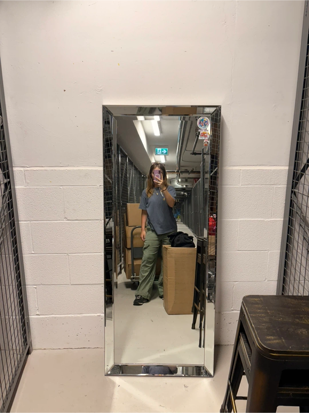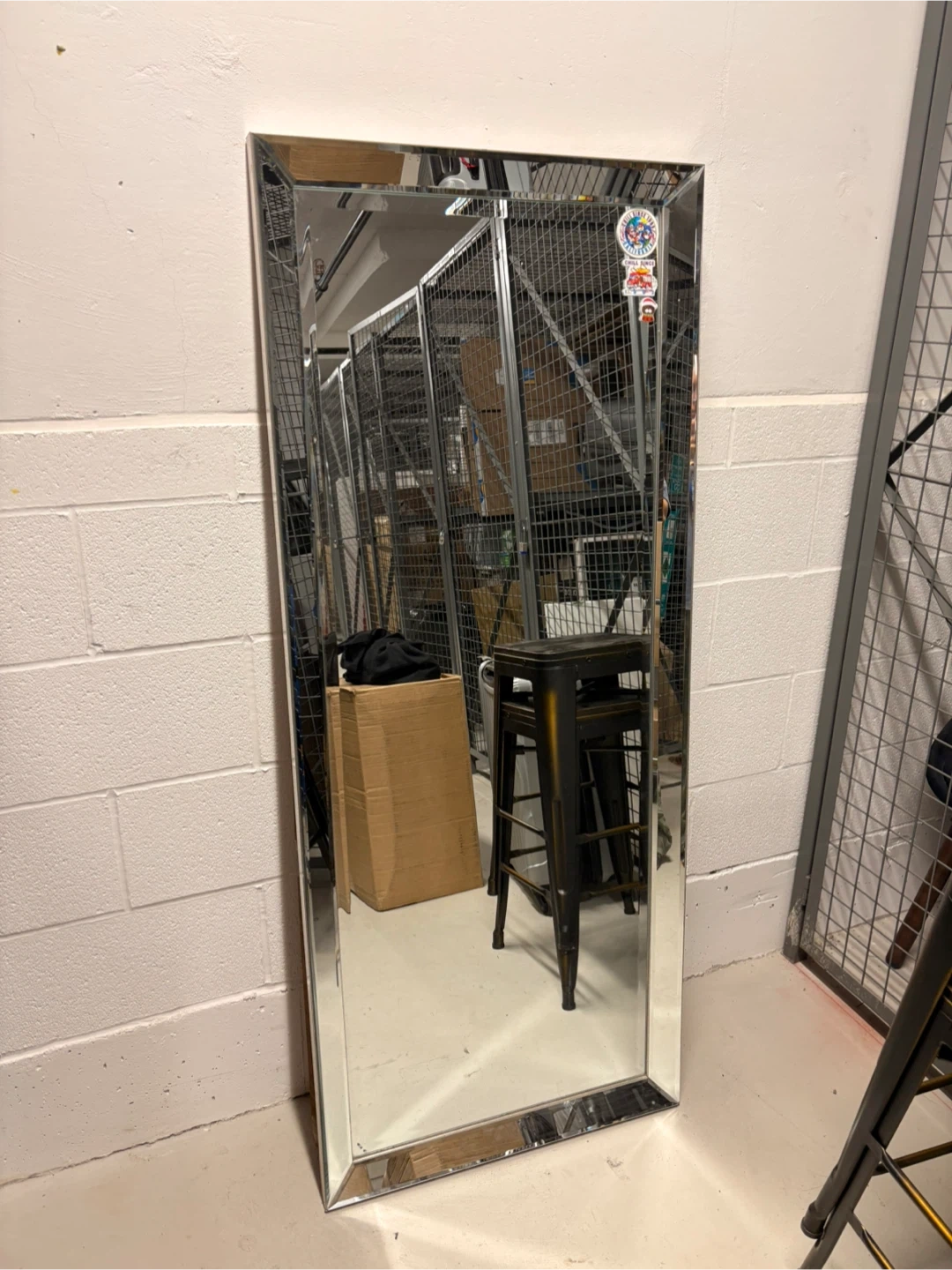 Selling a rectangular framed mirror. It's a stylish piece that would look great in any room! It's in good condition and ready for a new home. Two stickers on the right cover can be removed.
