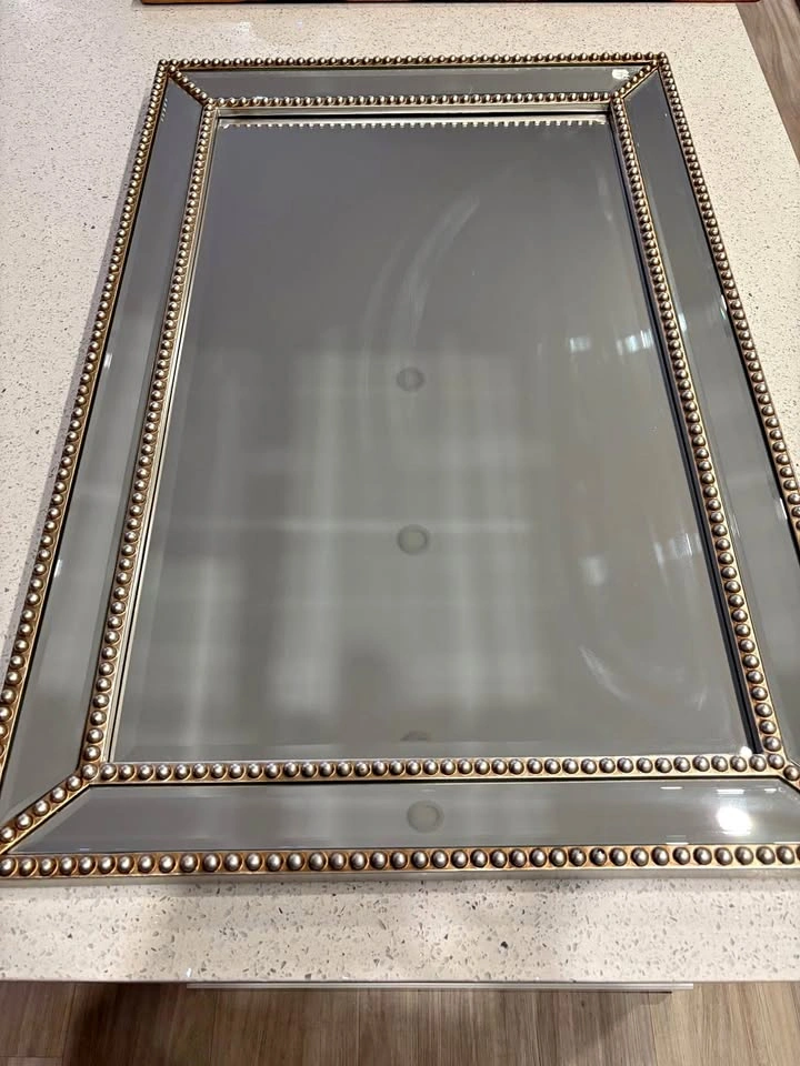 Rectangular Mirror with Beaded Frame and Antique Brass Finish 35” x 24” Beaded finishing detail surrounds the decorative mirror Antique brass finish: Mirror has beveled edges Hangs vertically or horizontally Pick up on St Clements
