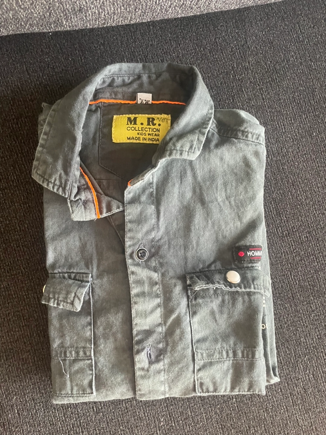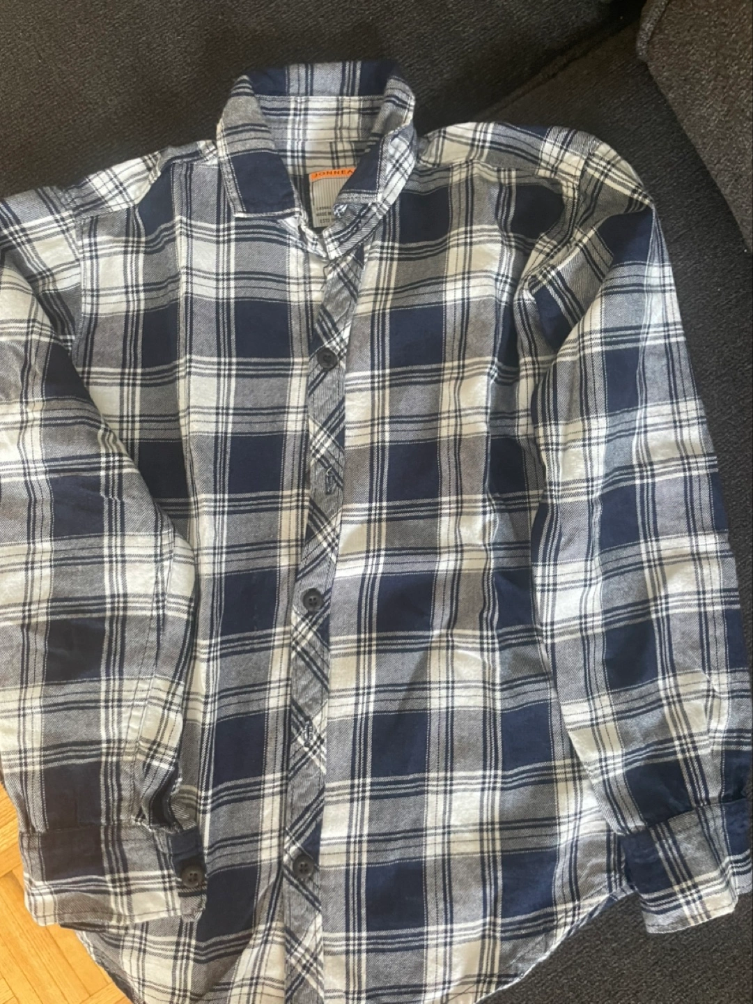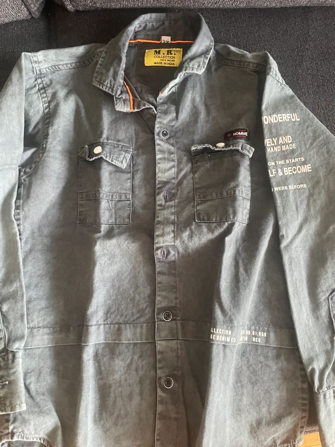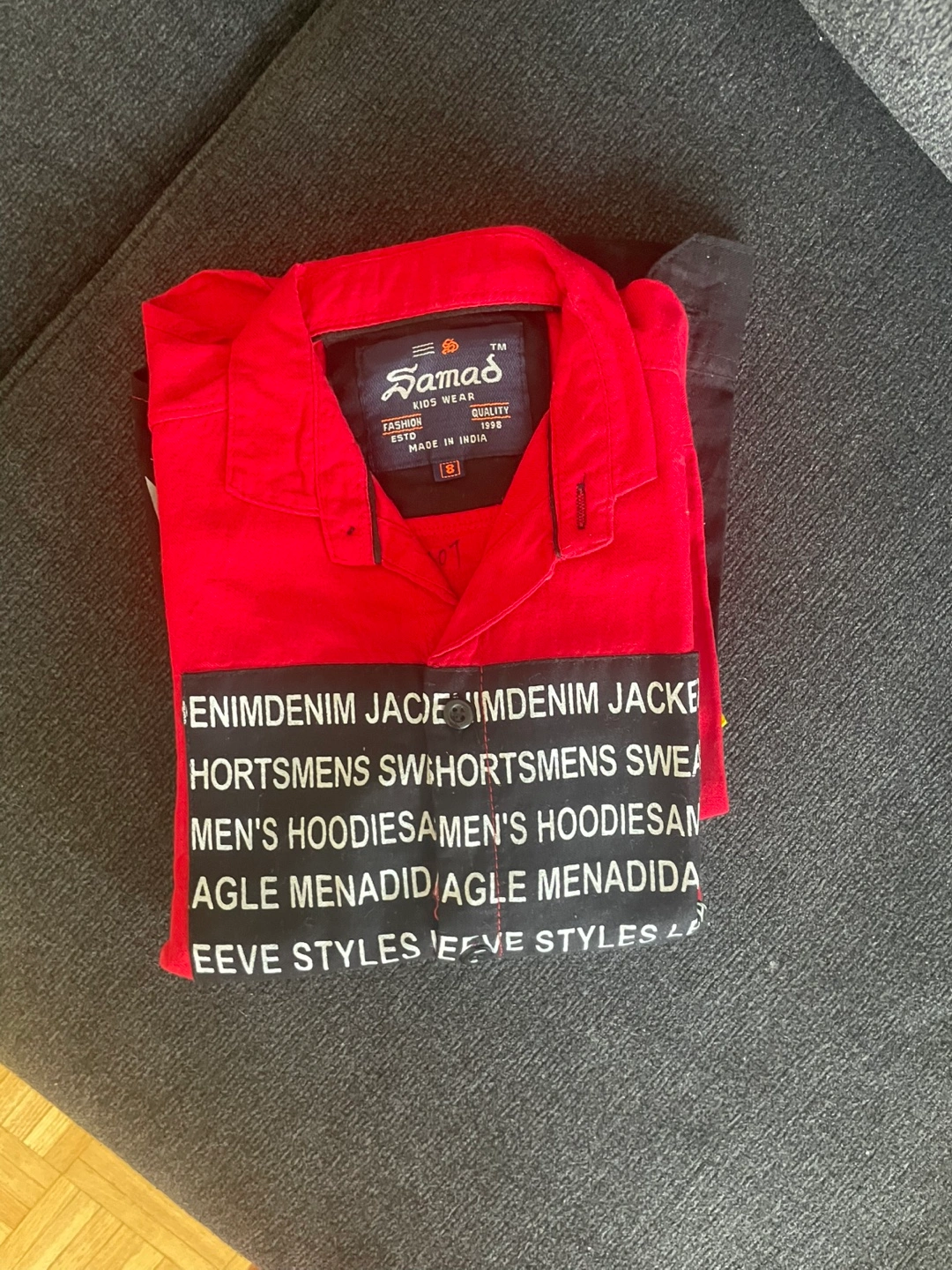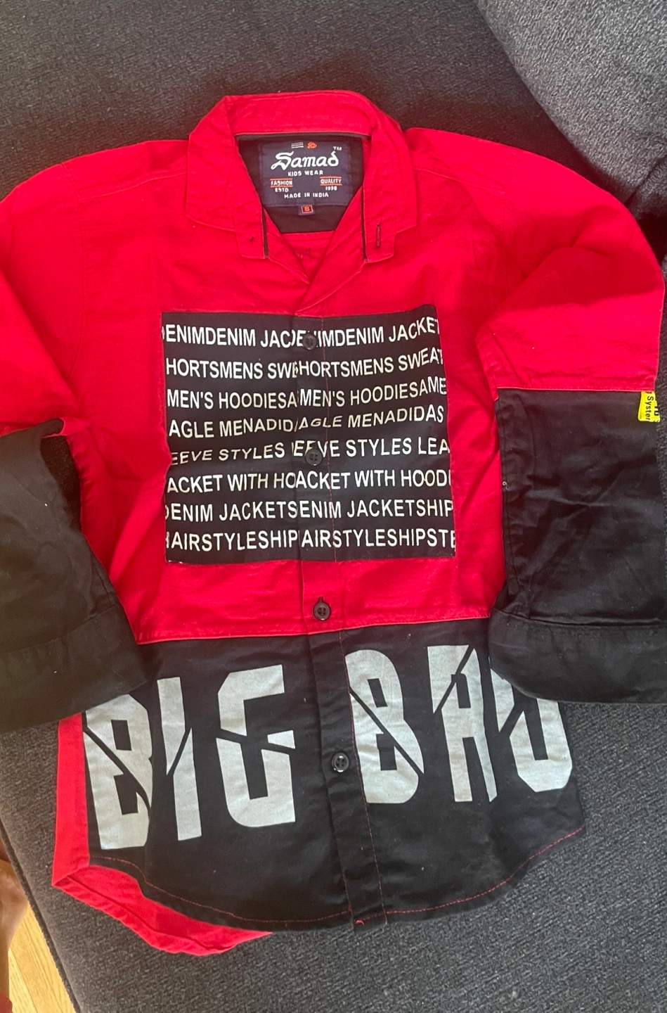Long sleeve button up shirt, red with black print on the sleeves. Size S. size are good for 5 to 7 kid boy