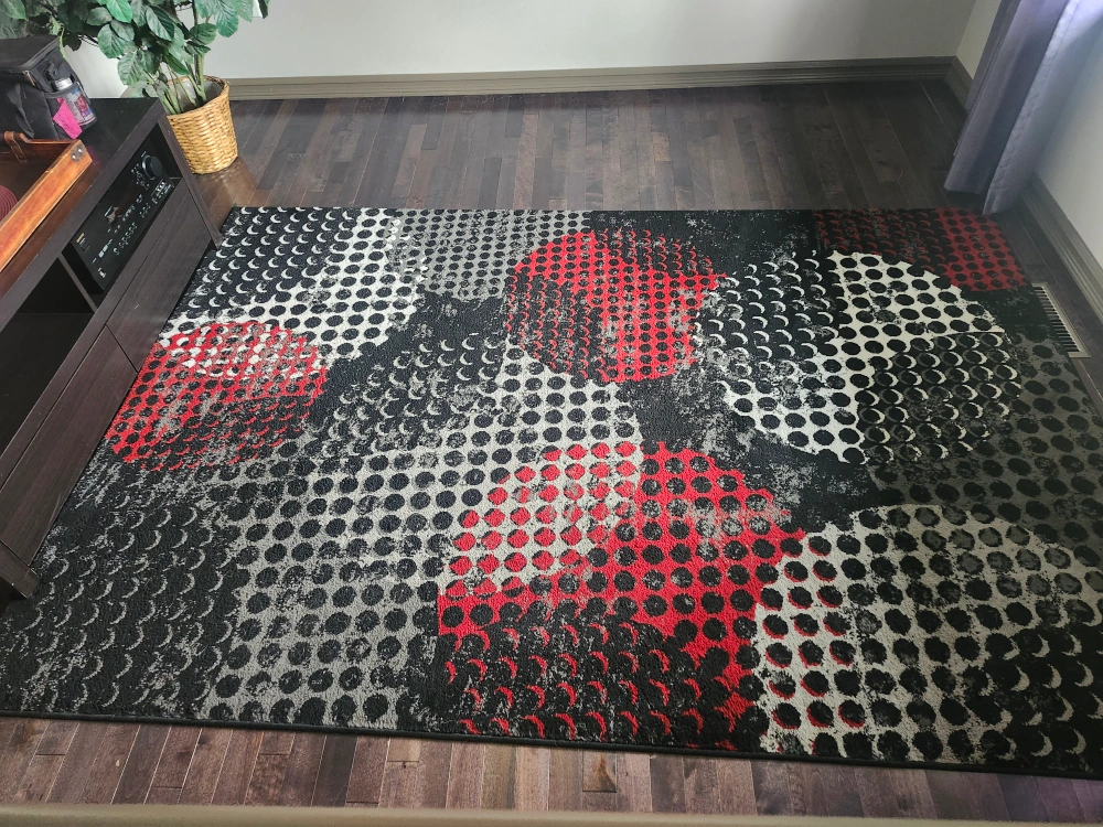 Area rug with a red, black, and grey patterned design. It's in great shape and would look great in any room!