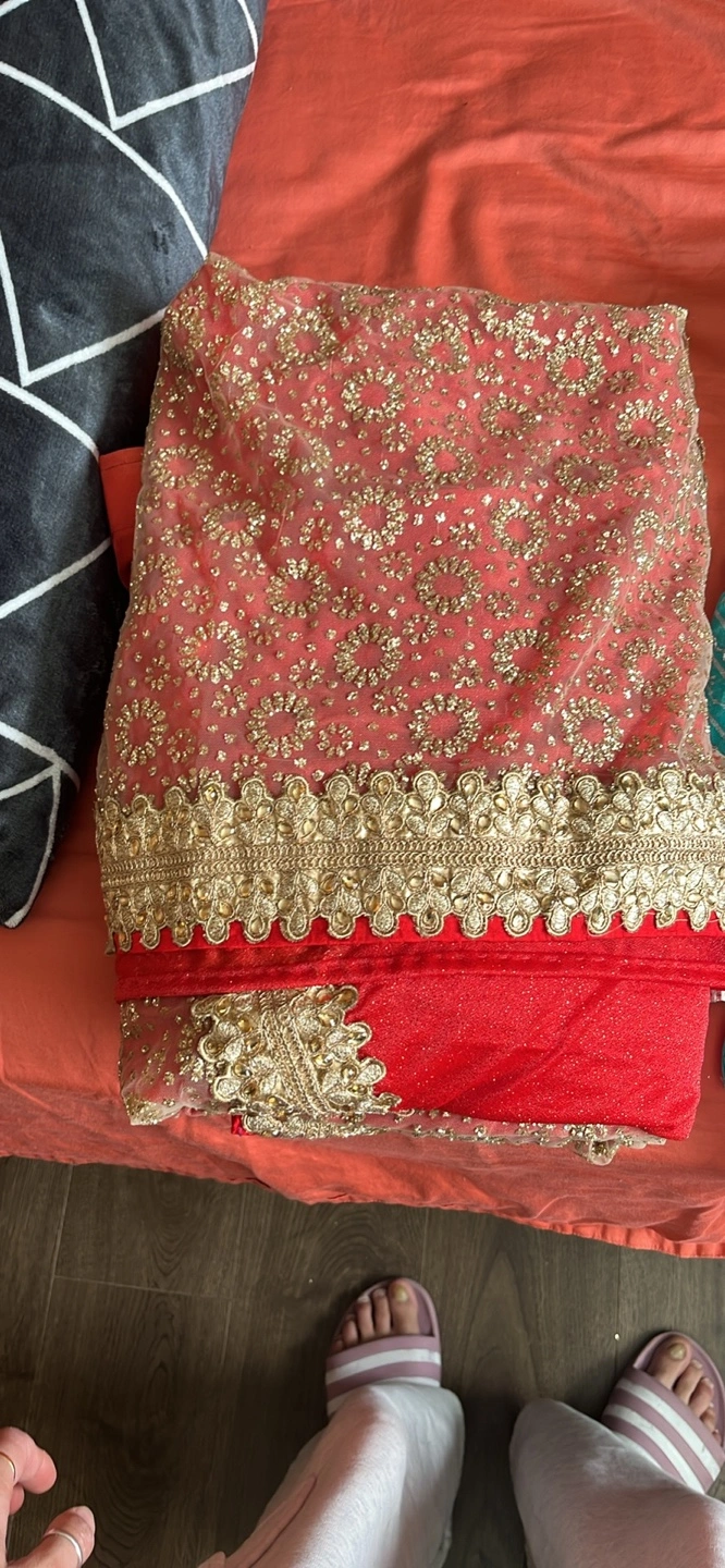 Beautiful red sari. Features gold embroidery and embellishments. Net fabric. Stunning detail.With stitched blouse.
