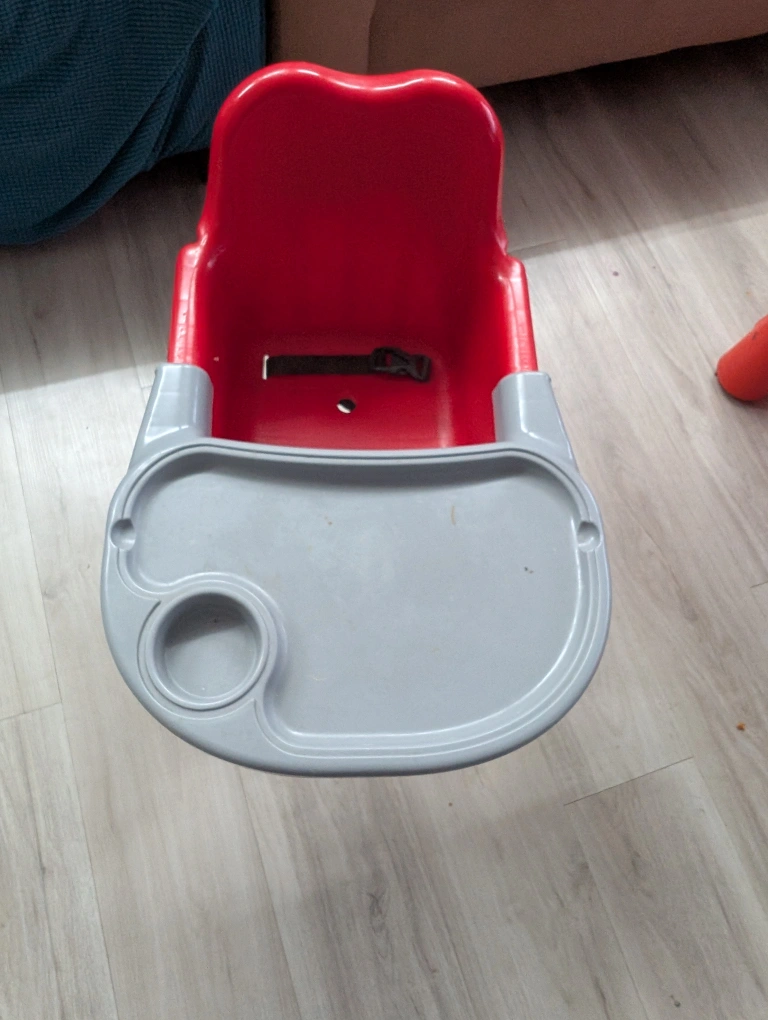 Selling a baby high chair in red and grey. It has a safety strap and a tray with a cup holder. Perfect for feeding time!