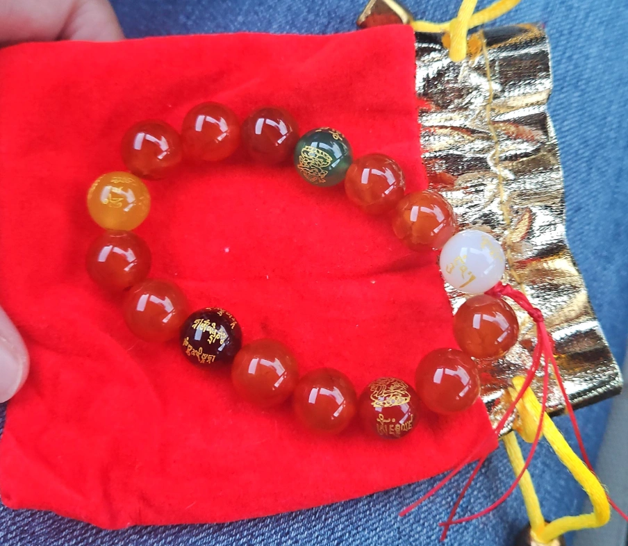 Selling a lovely red bead bracelet. It features a mix of red, yellow, green, black and white beads with intricate designs. Comes with a red and gold pouch for safekeeping