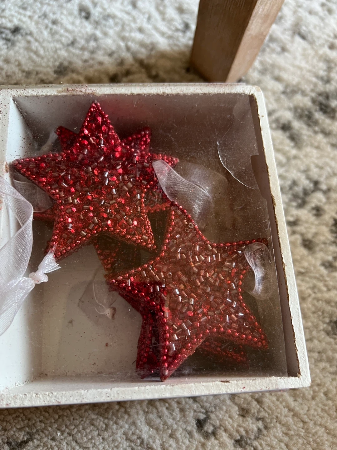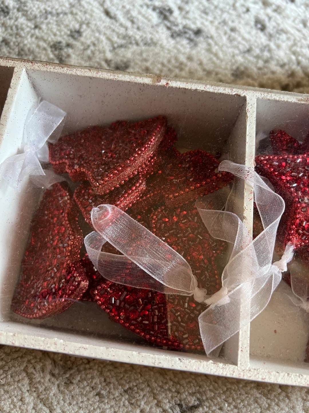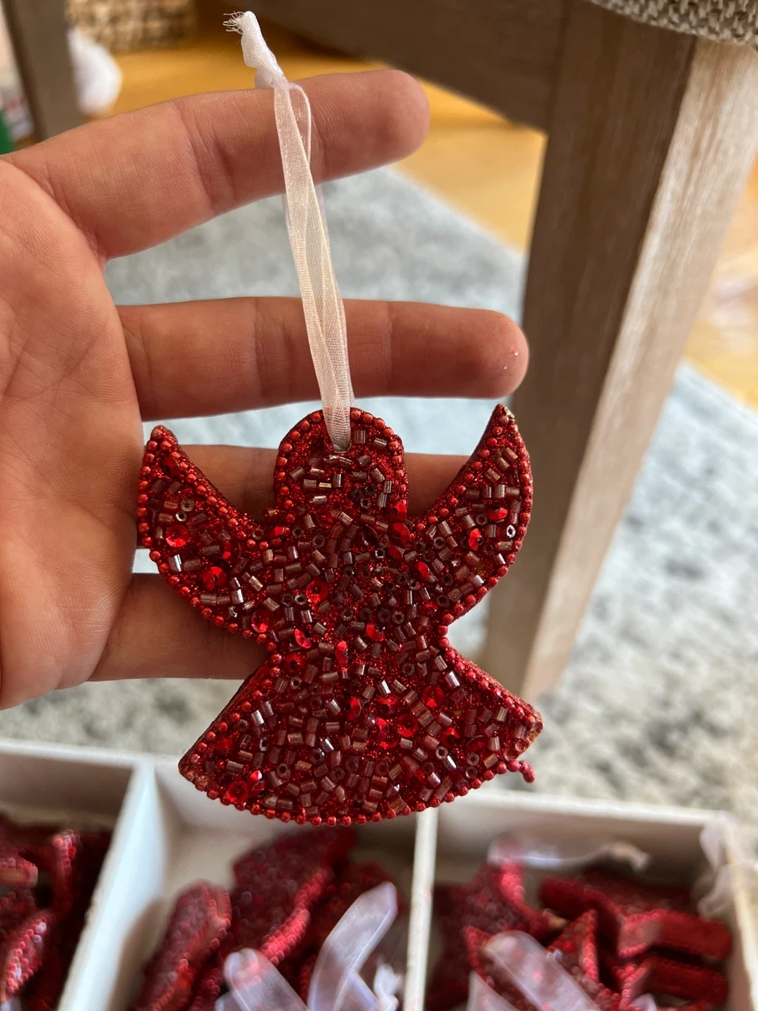 Selling a set of red beaded Christmas ornaments! There are angel, star, and tree shapes available. They are in great condition and ready to add some sparkle to your tree this holiday season