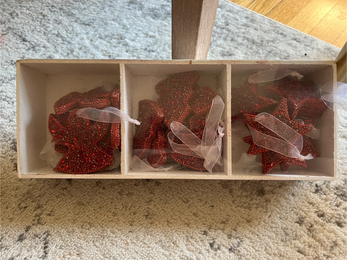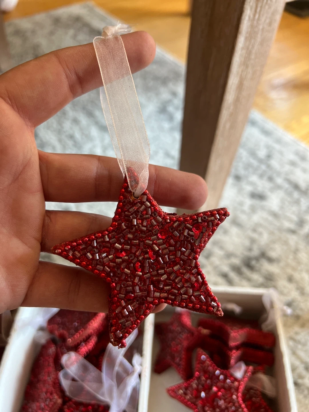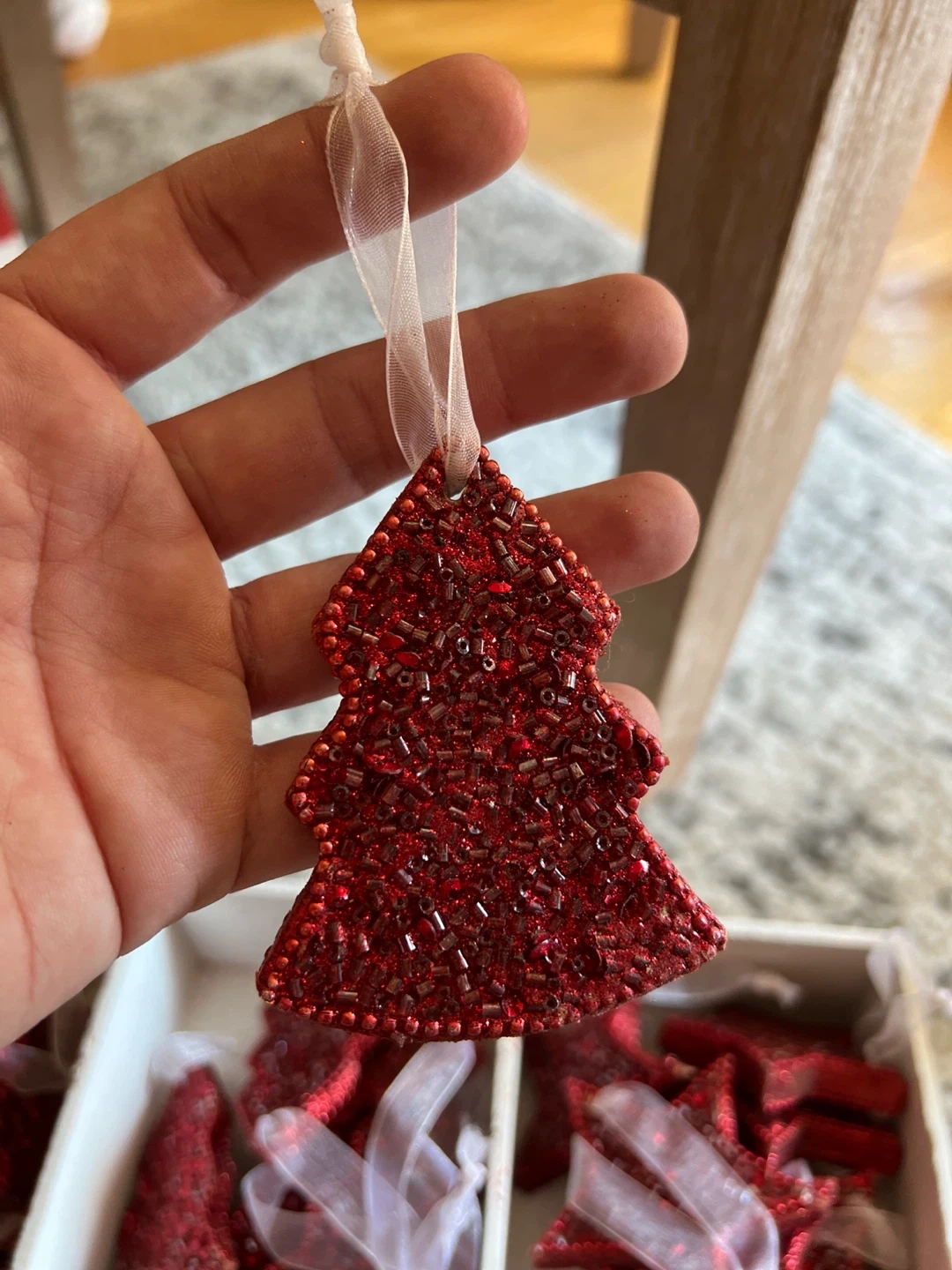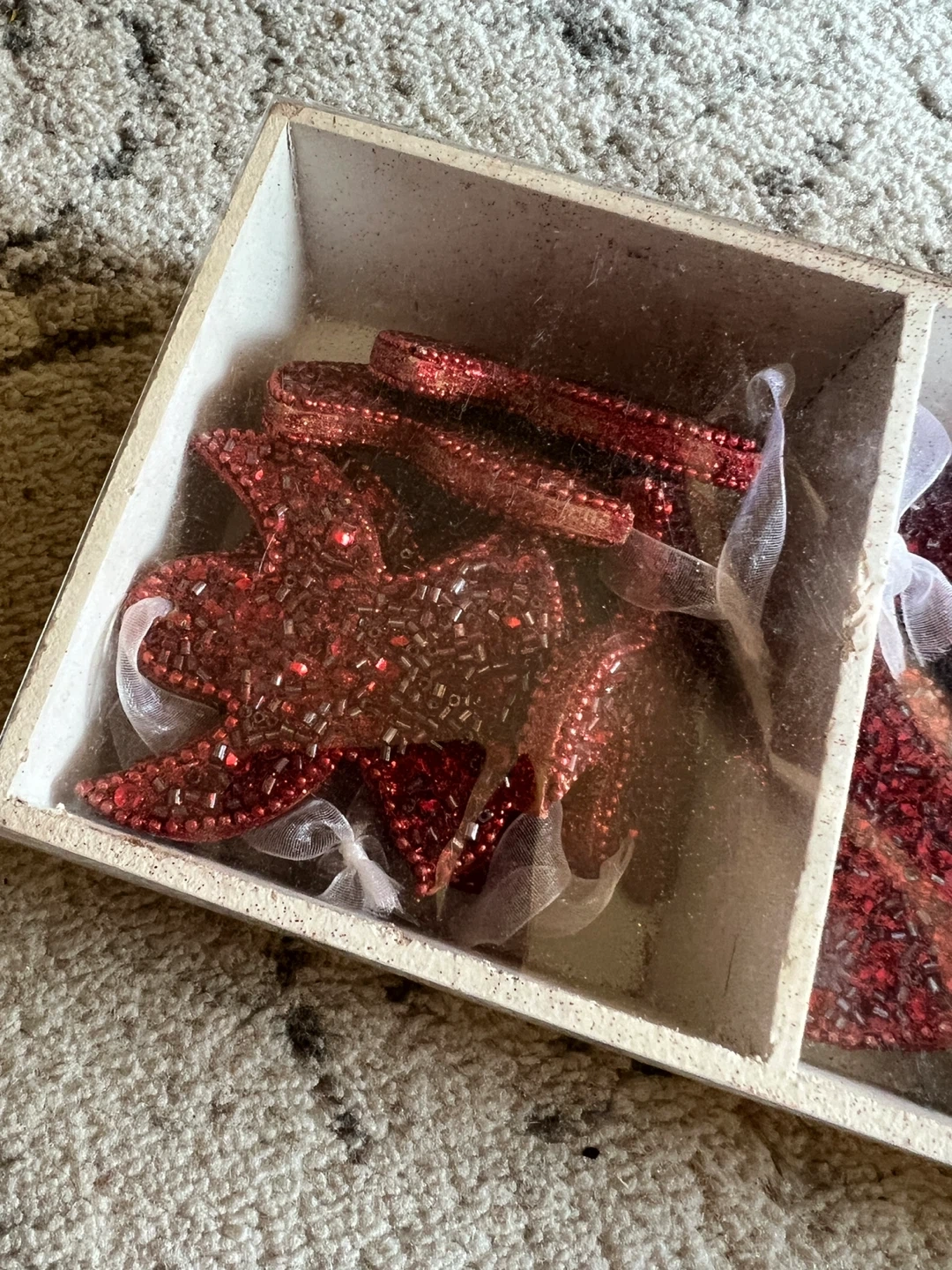 Selling a set of red beaded Christmas ornaments! There are angel, star, and tree shapes available. They are in great condition and ready to add some sparkle to your tree this holiday season