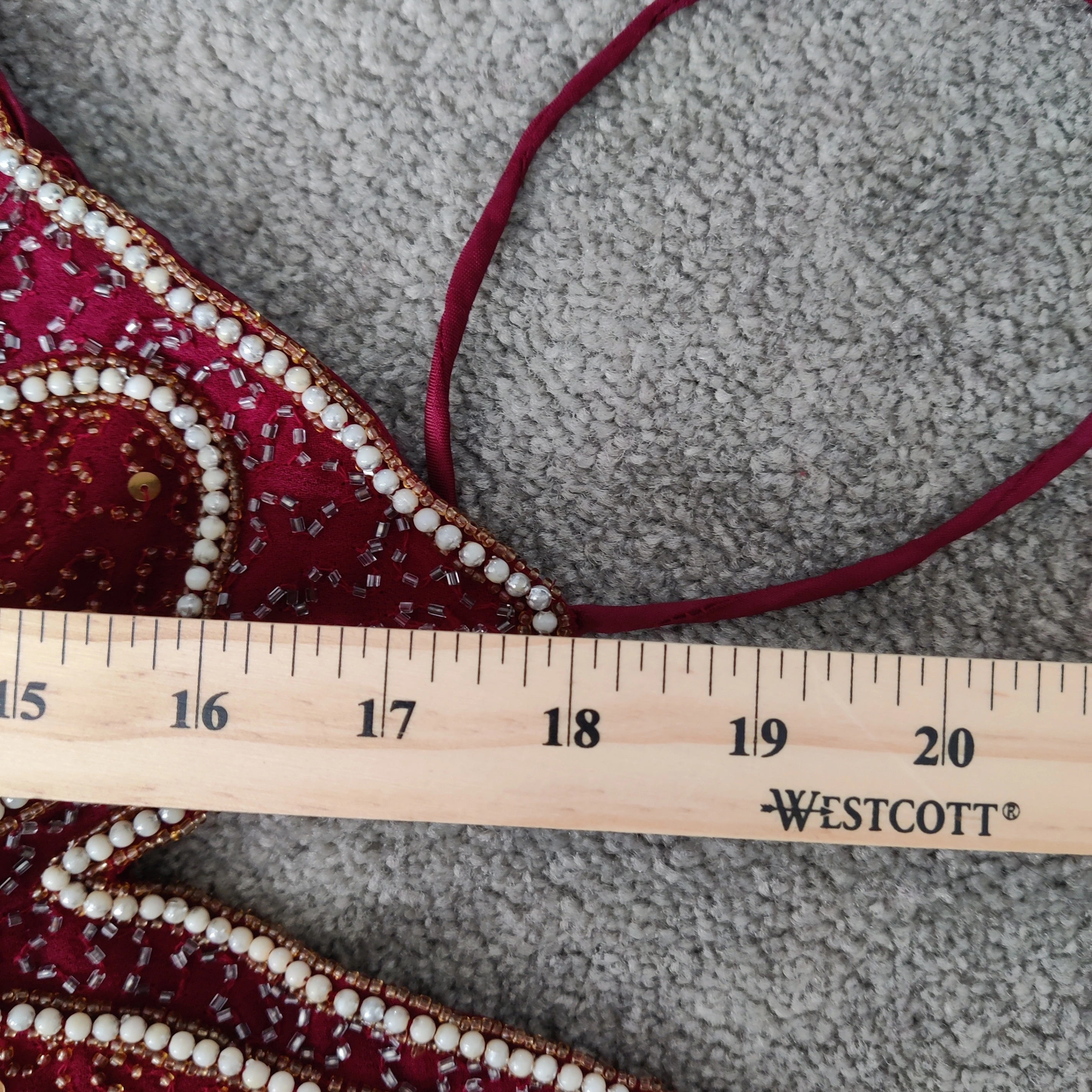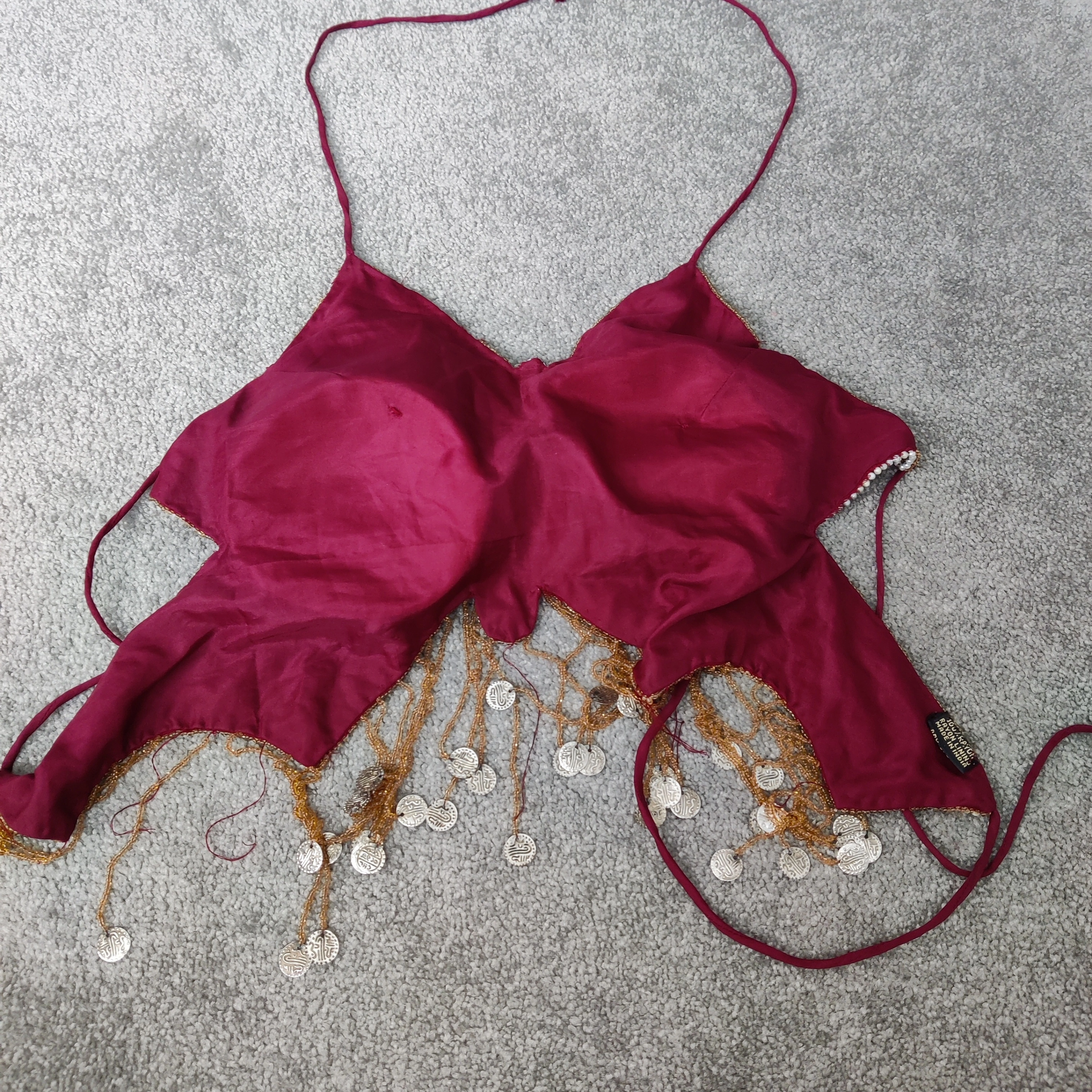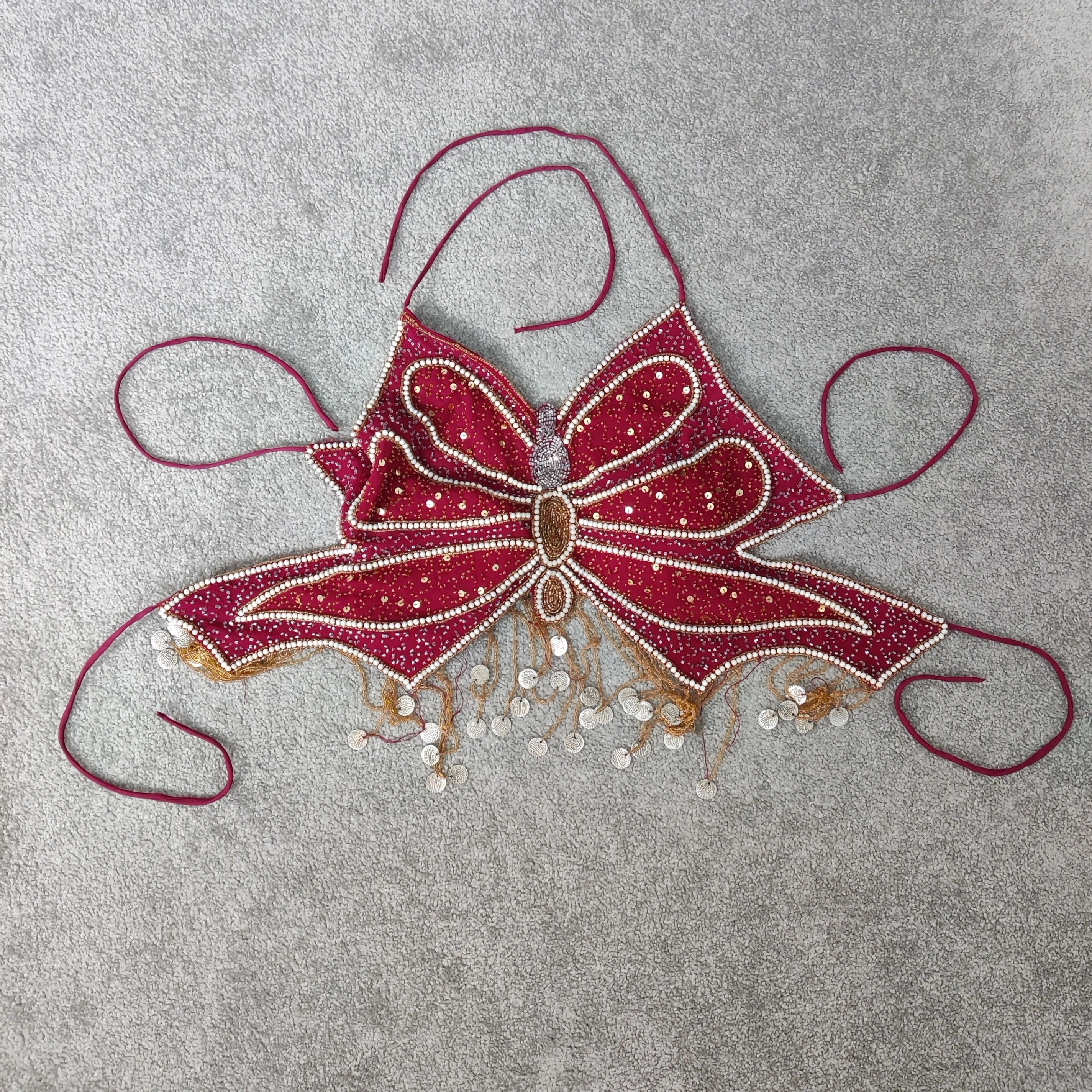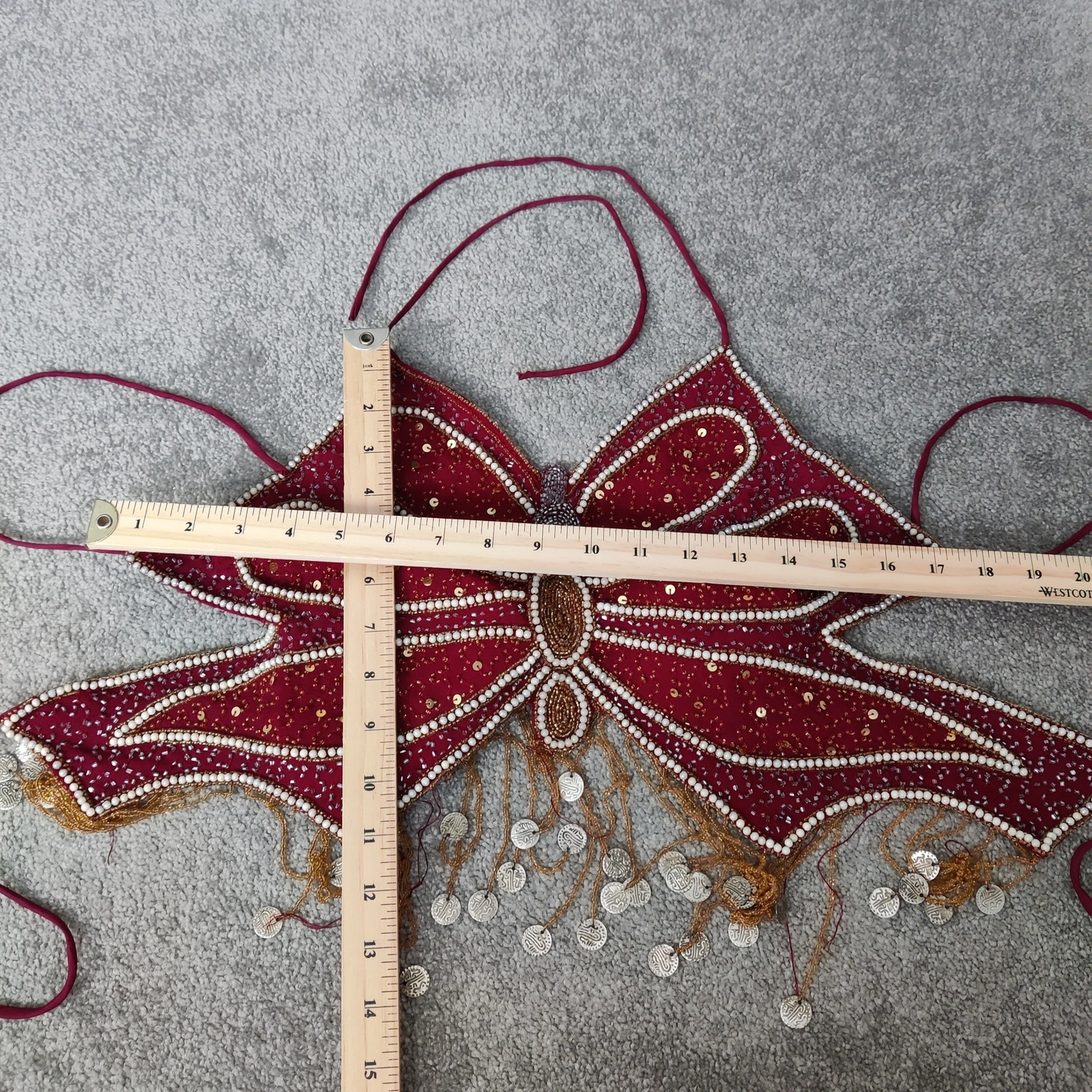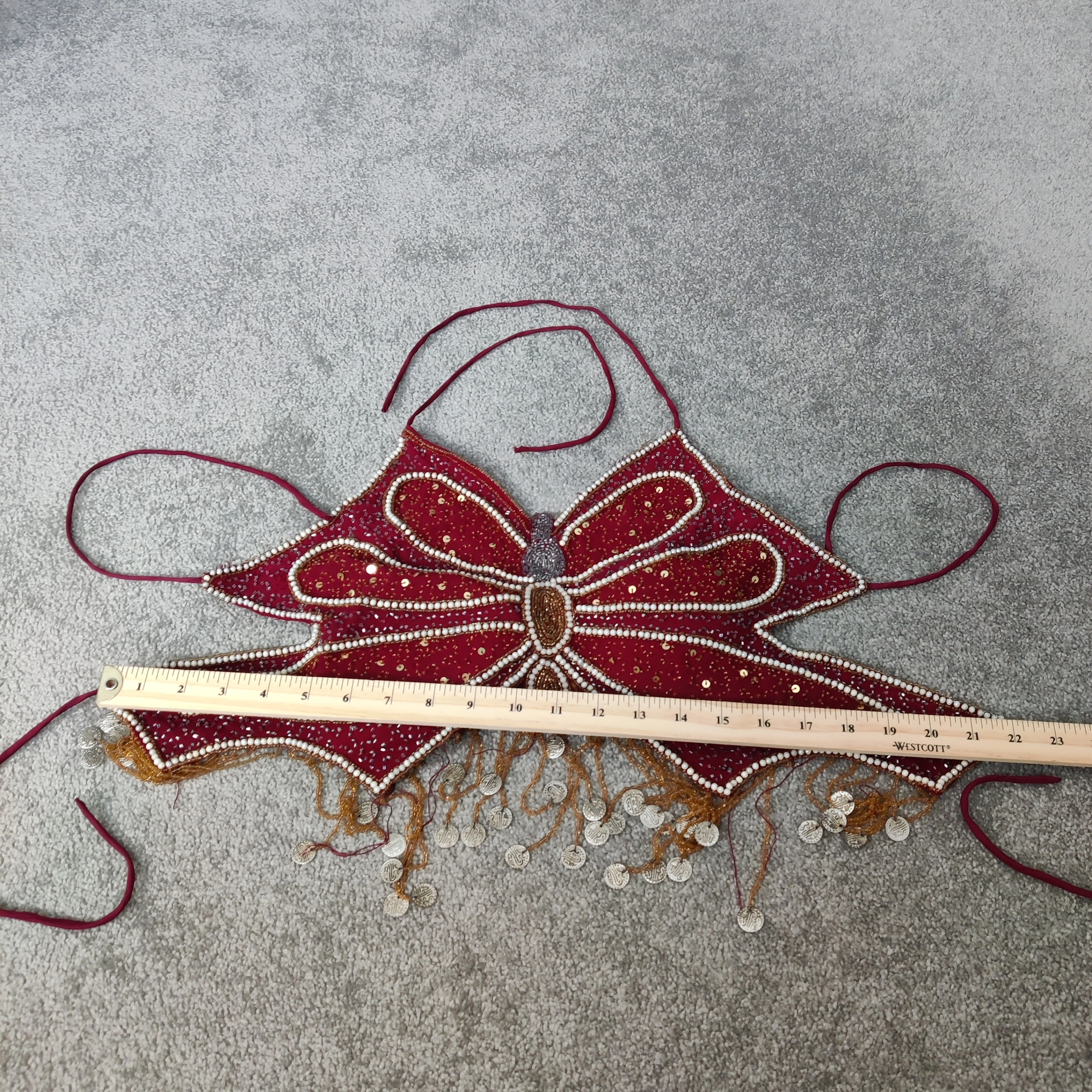 Stunning red halter top featuring an intricate oversized bow design embellished with gold and silver beading, pearls, and sequins. The bottom edge is decorated with shimmering bead fringe and dangling sequins, adding movement and sparkle. Adjustable neck and back ties allow a customizable fit. Perfect for belly dance, stage performances, festivals, parties, or as a statement costume piece. Pre-owned and in excellent condition — all beads intact, ready to shine! belly dance top, beaded halter top, festival wear, red bow costume, sequined top, performance outfit, stage costume, belly dancer outfit, party top, decorative halter, boho beaded top, handmade costume, carnival wear, statement piece, coachella In good used condition Measurements are approximate and taken laying flat Follow me on Instagram @renewifyupcycle for unique upcycled items