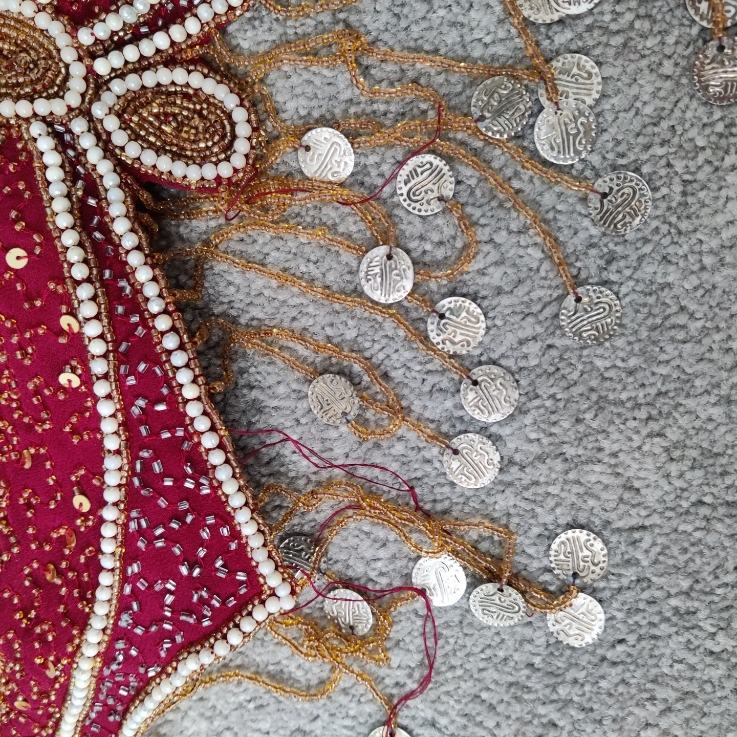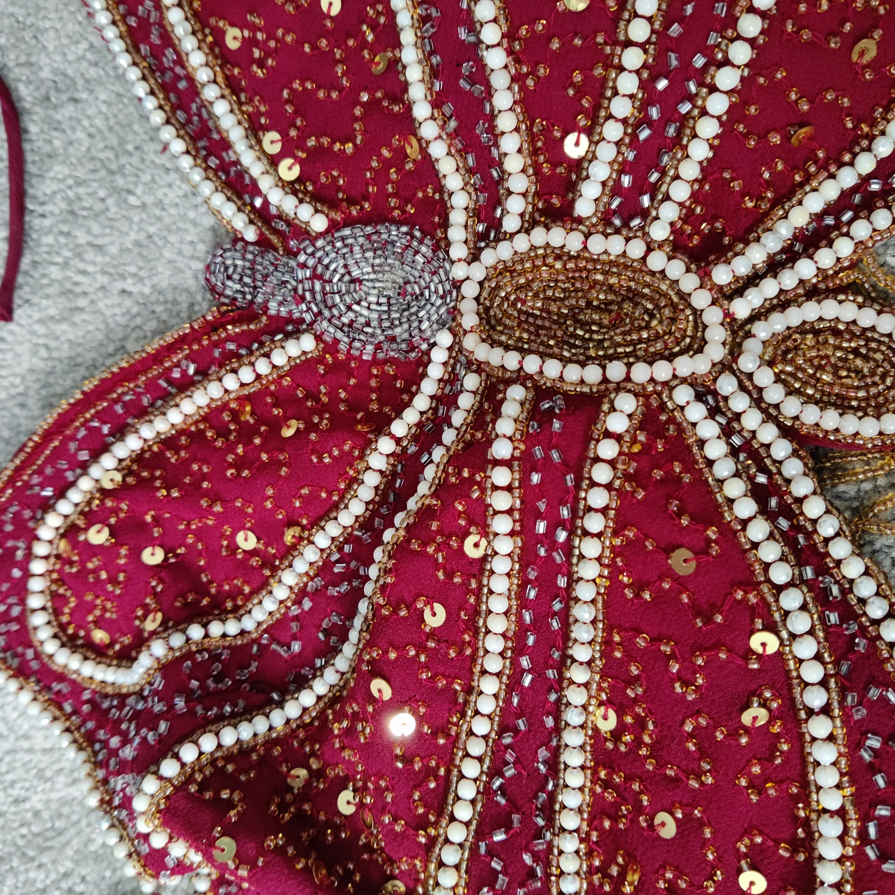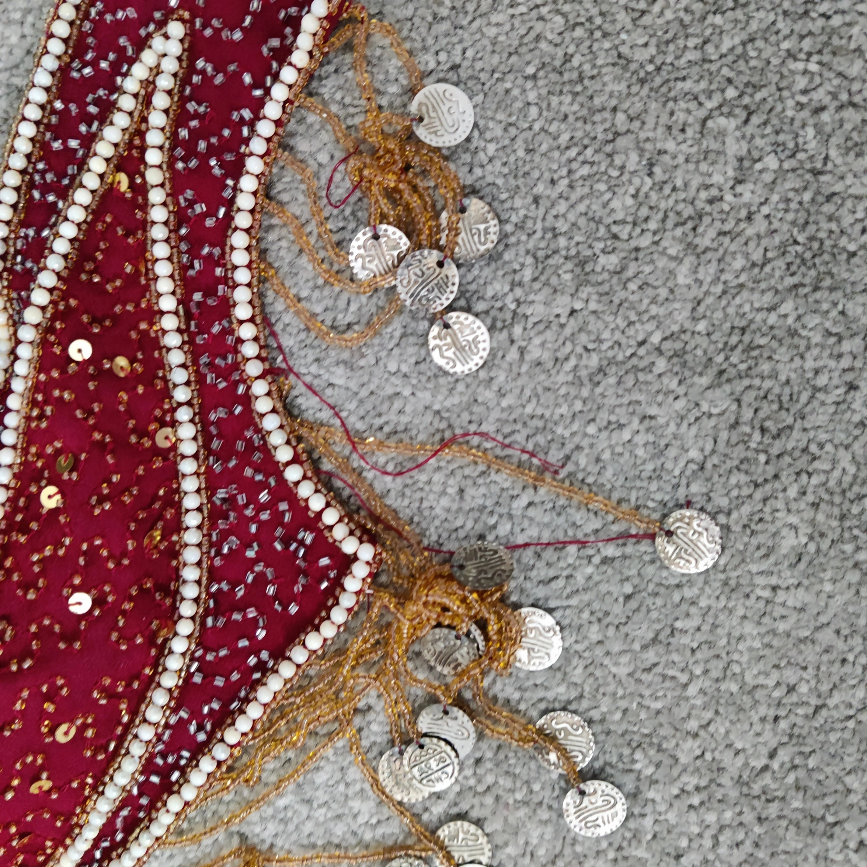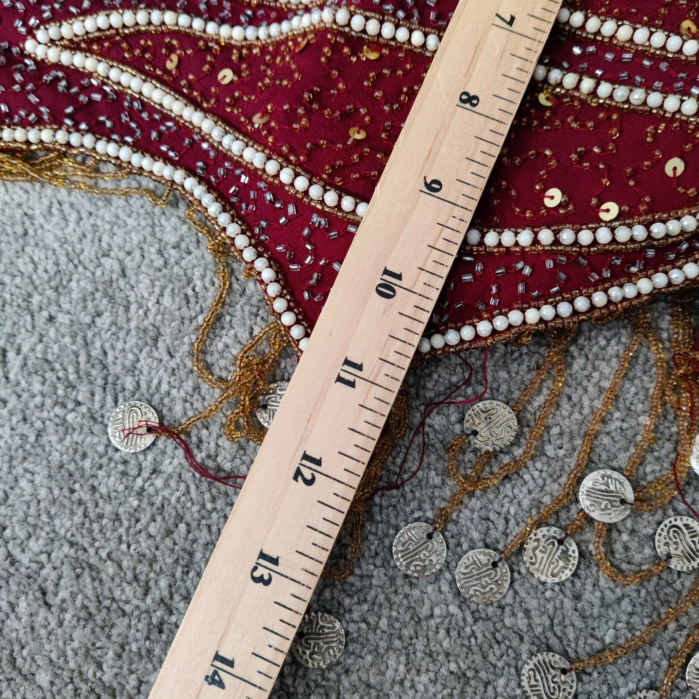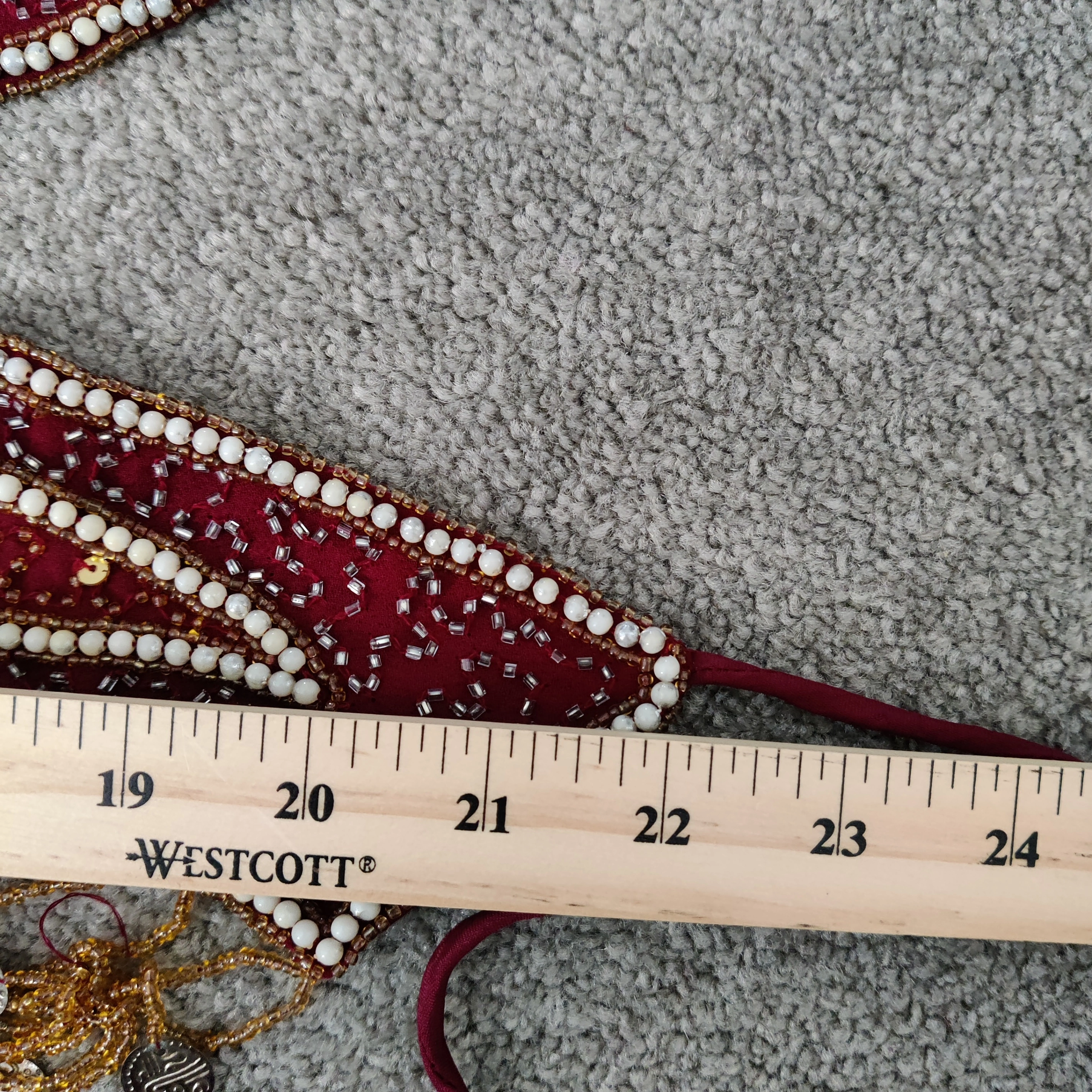 Stunning red halter top featuring an intricate oversized bow design embellished with gold and silver beading, pearls, and sequins. The bottom edge is decorated with shimmering bead fringe and dangling sequins, adding movement and sparkle. Adjustable neck and back ties allow a customizable fit. Perfect for belly dance, stage performances, festivals, parties, or as a statement costume piece. Pre-owned and in excellent condition — all beads intact, ready to shine! belly dance top, beaded halter top, festival wear, red bow costume, sequined top, performance outfit, stage costume, belly dancer outfit, party top, decorative halter, boho beaded top, handmade costume, carnival wear, statement piece, coachella In good used condition Measurements are approximate and taken laying flat Follow me on Instagram @renewifyupcycle for unique upcycled items