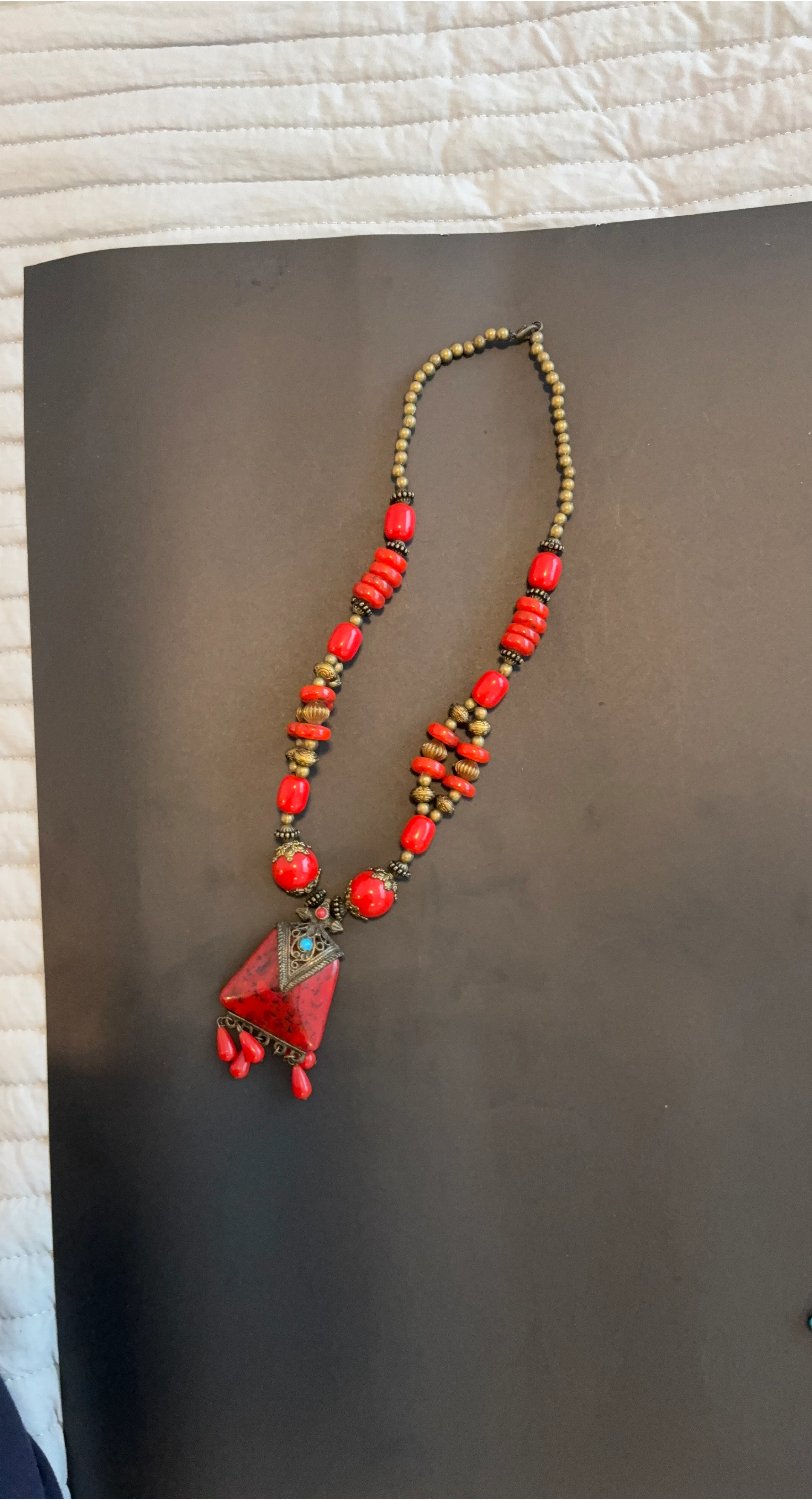 This is a red beaded necklace with a unique pendant. The beads are a vibrant red, and the pendant has a distinctive shape with some antique brass detailing. It’s a great statement piece to add some flair to any outfit