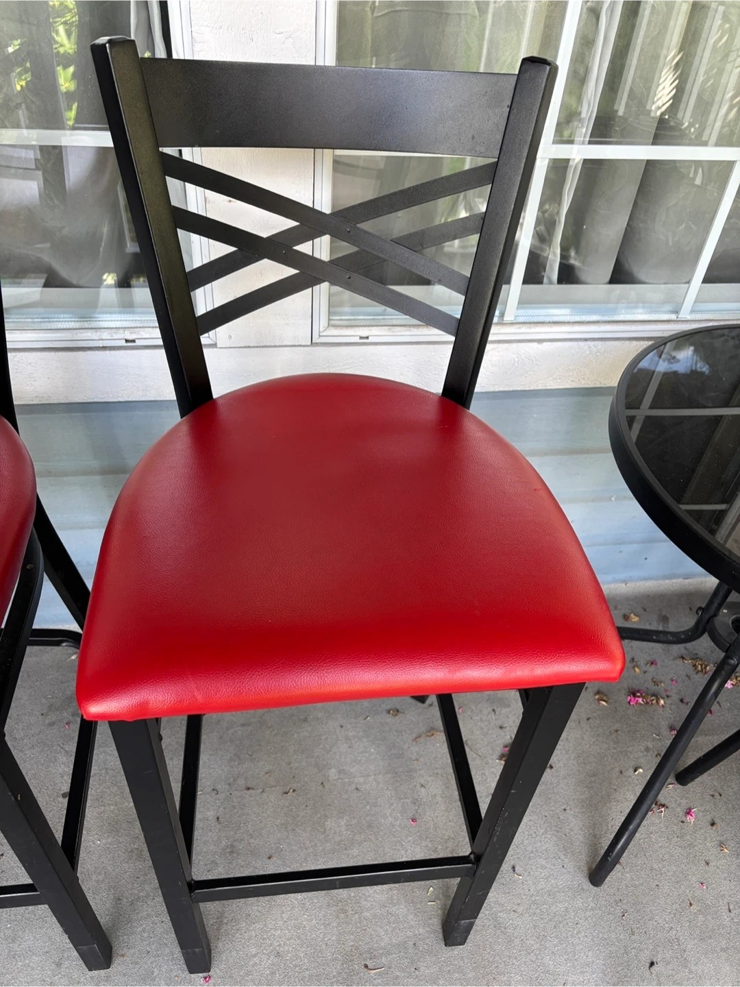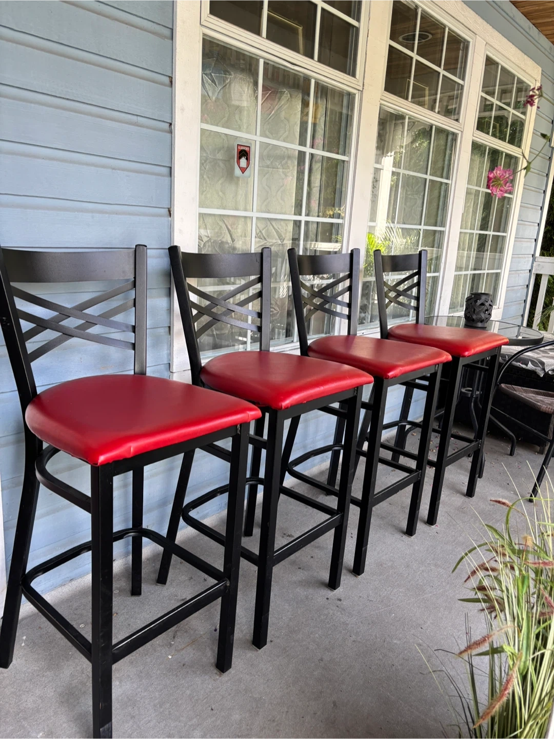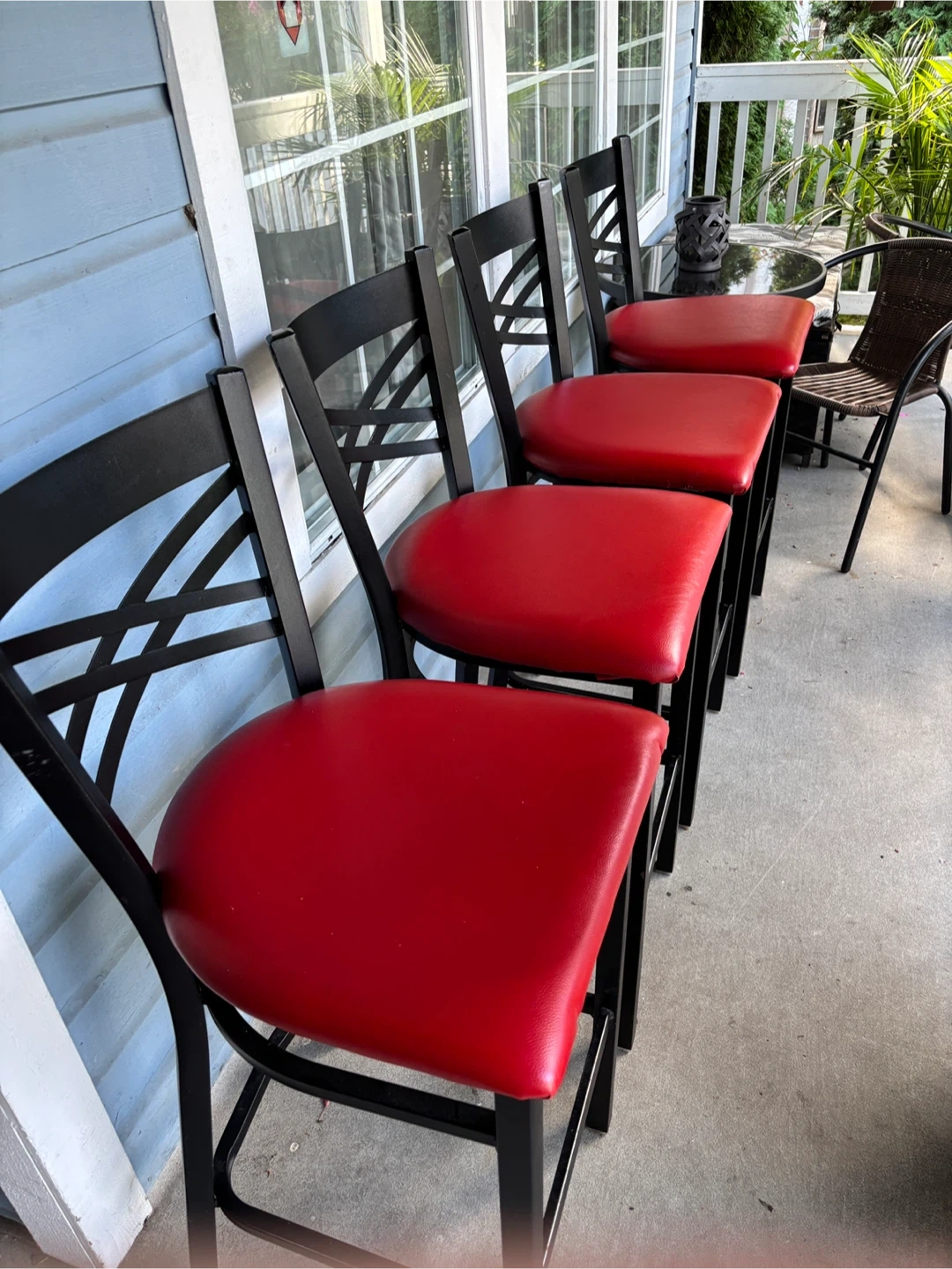 Selling a set of 4 bar stools. They feature a black metal frame and a vibrant red seat. The seat measures approximately 17 inches in width, and the total height of the stool is about 42 inches. Great for adding a pop of colour to your kitchen or bar area! $40 each or 4 for $150