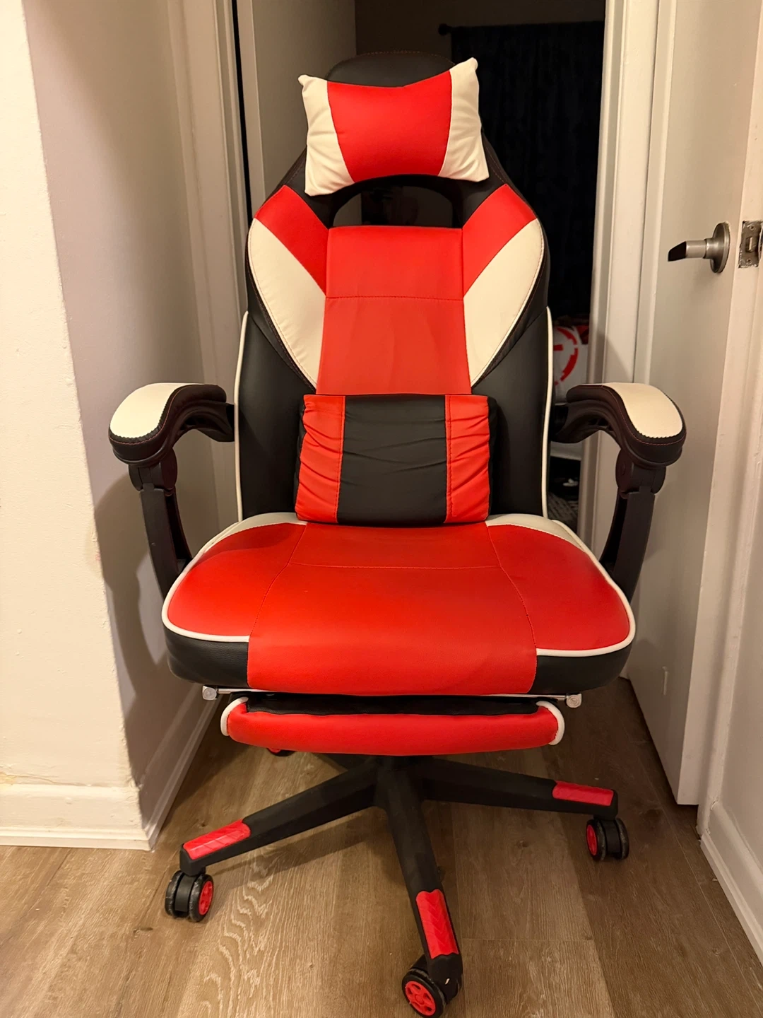 Selling a gaming chair in red, white, and black. It features a headrest and lumbar support pillow for extra comfort. It also has a retractable footrest for when you want to kick back and relax during those long gaming sessions. Pick up or I can drop off depends on the location. Swivel and up or down adjustment lever still in perfect condition.
